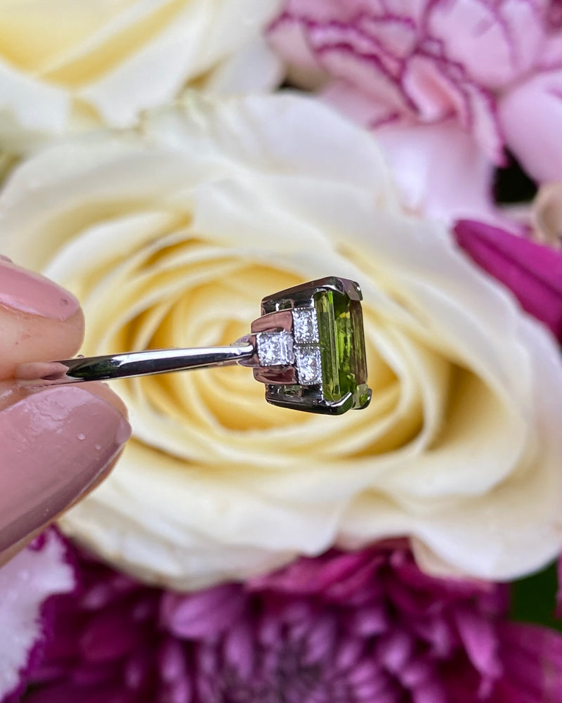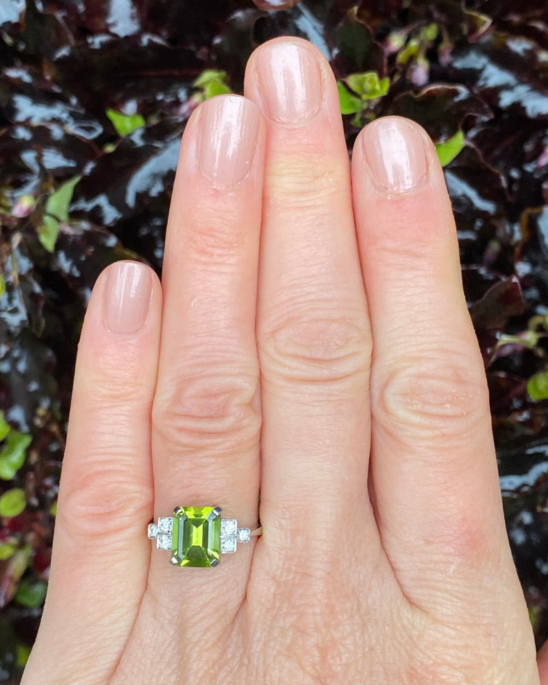 A stunning Art deco Style Peridot and Diamond Cluster Ring. You don’t often see Peridots and it’s such a lovely shade of green you’d wonder why we aren’t all searching them out! Believed to bring good health, restful sleep and peace to relationships by balancing emotions and mind...and they look gorgeous! The Emerald Cut Peridot weighs 2.20ct, is set with 4 claws and measures 9mm x 7mm. Set either side are three bright and sparkly Brilliant cut diamonds H/I colour and VS/SI clarity which weigh 0.18ct in total. The Diamonds are all pave set with a fine milgrain edging.
