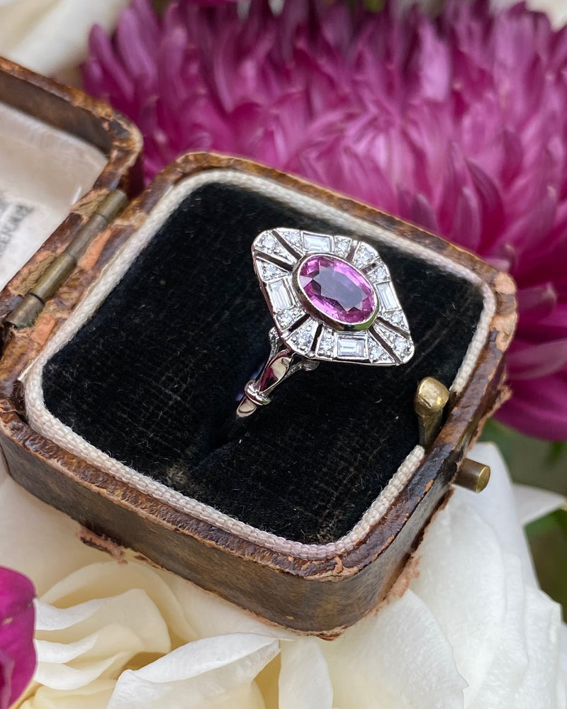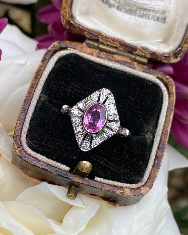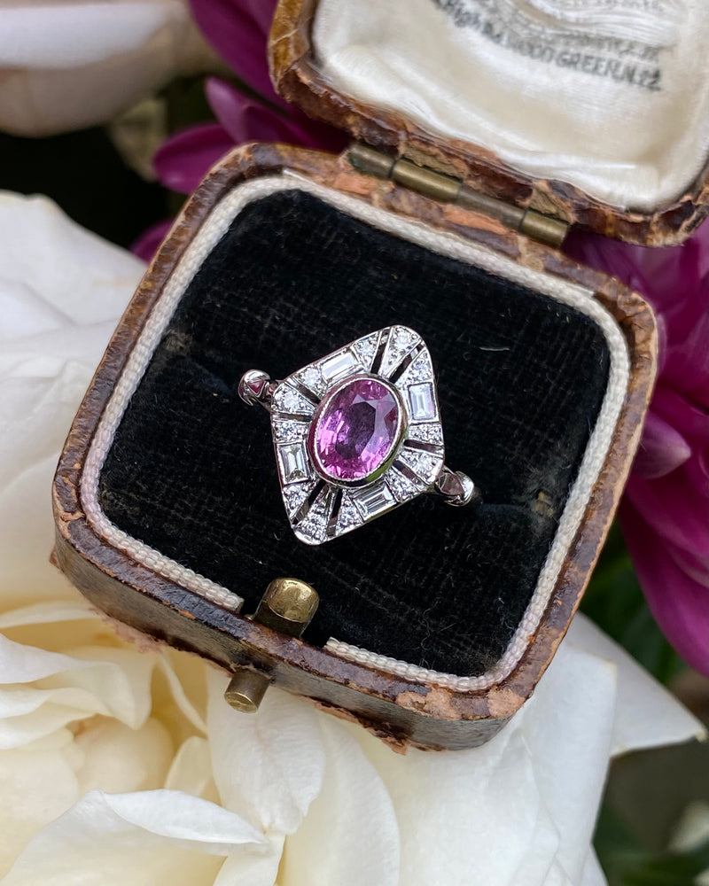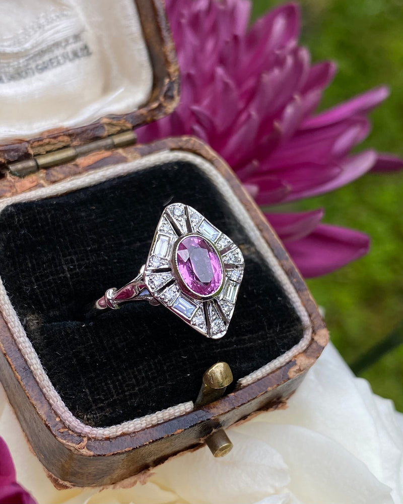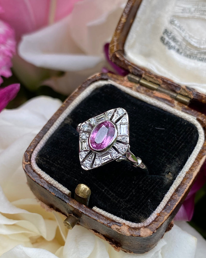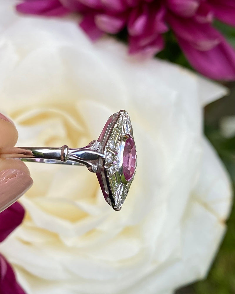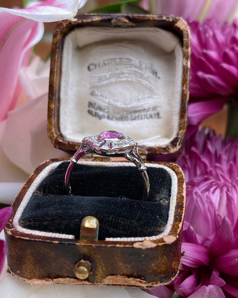 Art Deco Pink Sapphire and Diamond Platinum Ring 0.35ct + 1.0ct
