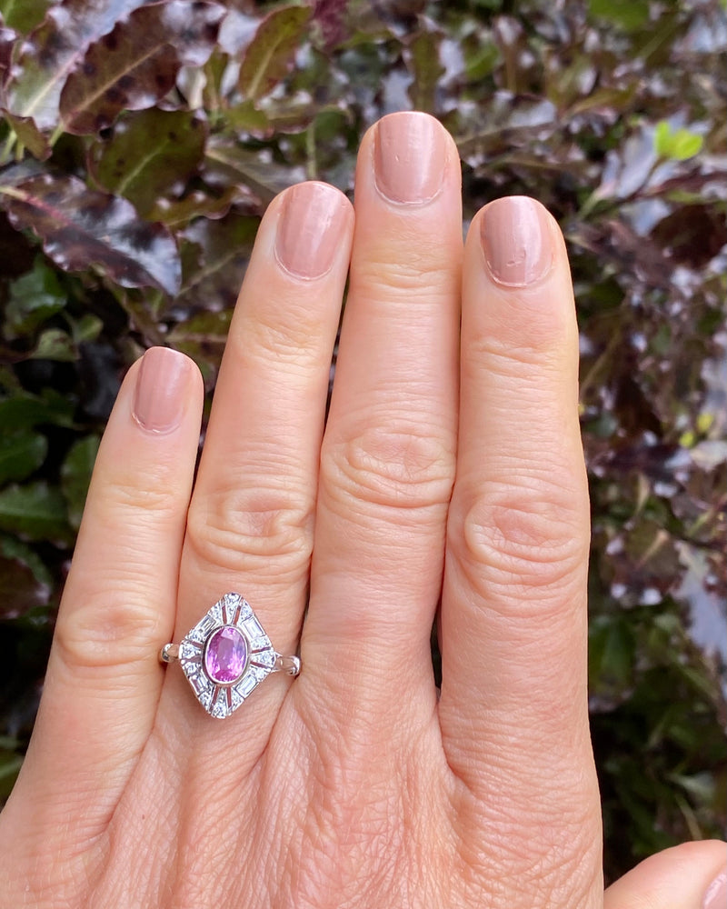 Wow, LOVE this ring! What a fantastic look for the money - I don't think it can be beaten with its combination of Pink Sapphire and interesting mix of cuts of Diamonds and geometric cut outs, it’s simply exquisite! The Pink Sapphire weighs 1.0ct, measures 7mm x 5mm, and is a pretty, playful pink colour and is beautifully offset with a rub over setting and a Diamond shaped surround set with a mixture of Brilliant Cut and Baguette Cut Diamonds. There are pierced out sections and pave setting, classic of the Art Deco era, with additional scallop detailed shoulders of the ring. The Diamonds weigh a total of 0.35ct and are good quality, H/I colour and VS/SI clarity. The ring is a lovely shape, sits beautifully low on the finger and is really eye-catching.