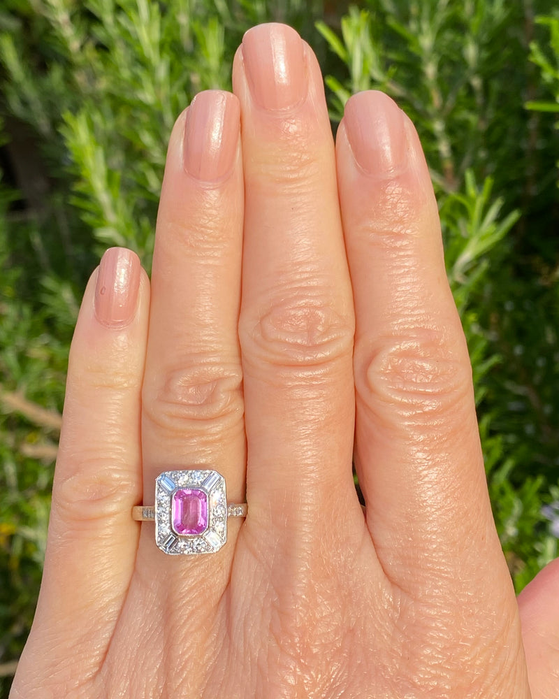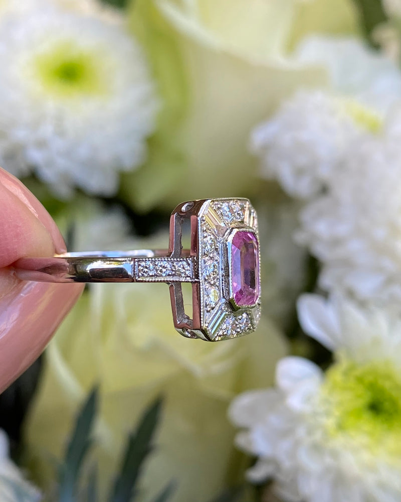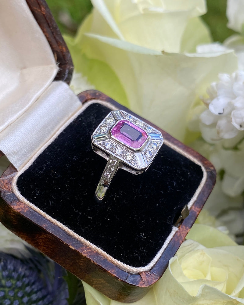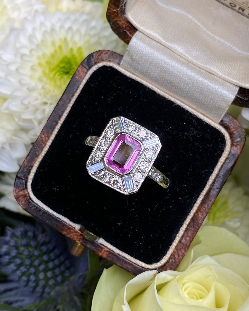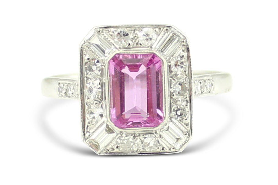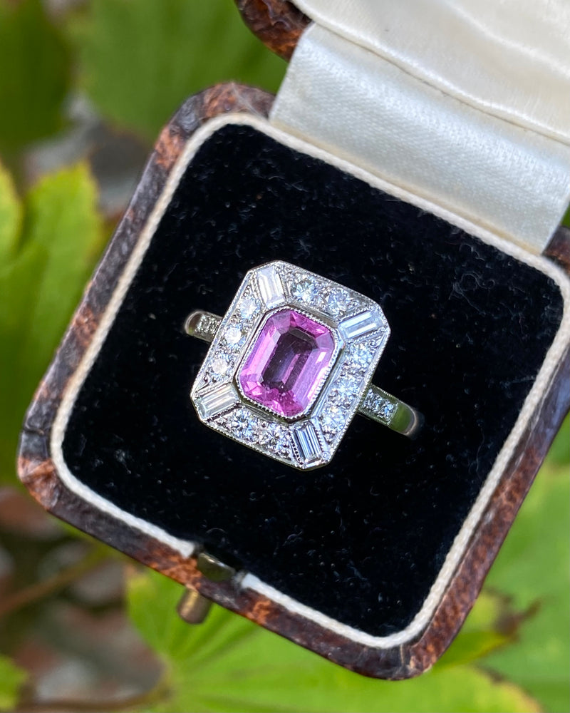 A fabulous Art Deco Style Pink Sapphire and Diamond ring. The central Pink Sapphire is Emerald cut, weighs 1.05ct and is a really pretty clear pink colour with a rubover setting, measuring 7mm x 5mm. Ths stunning stone is surrounded by a classic Art Deco mixture of Baguette Cut and Brilliant Cut Diamonds. The Diamonds are set in mixture of Rubover and Pave settings and are finished with a fine millgrain edging. There are an additional three Diamonds Pave set on either shoulder of the ring giving a lovely look to the band of the ring. The total Diamond weight in the ring is 0.55ct and are all fabulous bright and sparkly stones of a fine H/I colour and VS/SI clarity.