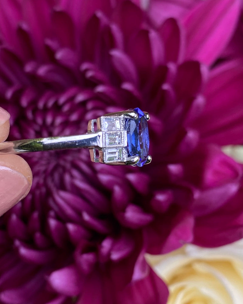 A stunning Art Deco style Tanzanite and Diamond ring with a fine AAA+ Tanzanite with a rich violet blue colour. The oval Tanzanite weighs 1.70ct and is set with 4 claws and measures 8mm x 6mm. Set either side are three horizontally set Baguette Cut Diamonds which weigh 0.30ct in total. The Diamonds are a lovely H/I colour and VS/SI quality and are rub over set with a fine milgrain edging. The ring is made entirely in high quality Platinum and can easily be sized to other measurements.