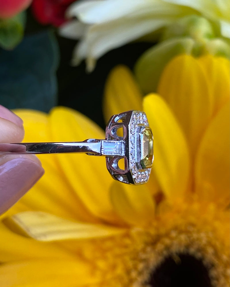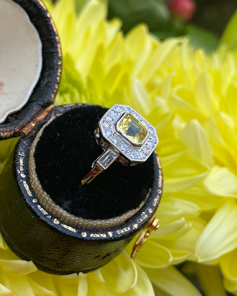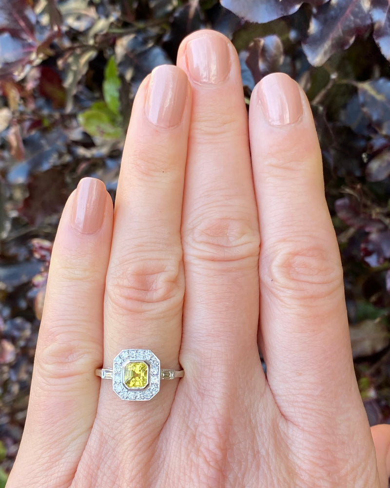 This Art Deco style Yellow Sapphire and Diamond Cluster is a beautiful ring! Sunny and vibrant, you can't help but smile wearing it. Set entirely in Platinum it looks great quality, it feels it too. The central Yellow Sapphire weighs 1.20ct measures 5.5mm x 5mm and is a lovely Emerald Cut shape. The surrounding Brilliant Cut Diamonds are pave set in an octagonal surround with an additional Baguette Cut Diamond rubover set in each shoulder, adding to the overall elegance. The Diamonds are bright and full of life, H/I colour, VS/SI clarity and weigh 0.30ct. The ring sits nice and low on the finger and is easy to wear. This is a lovely ring!