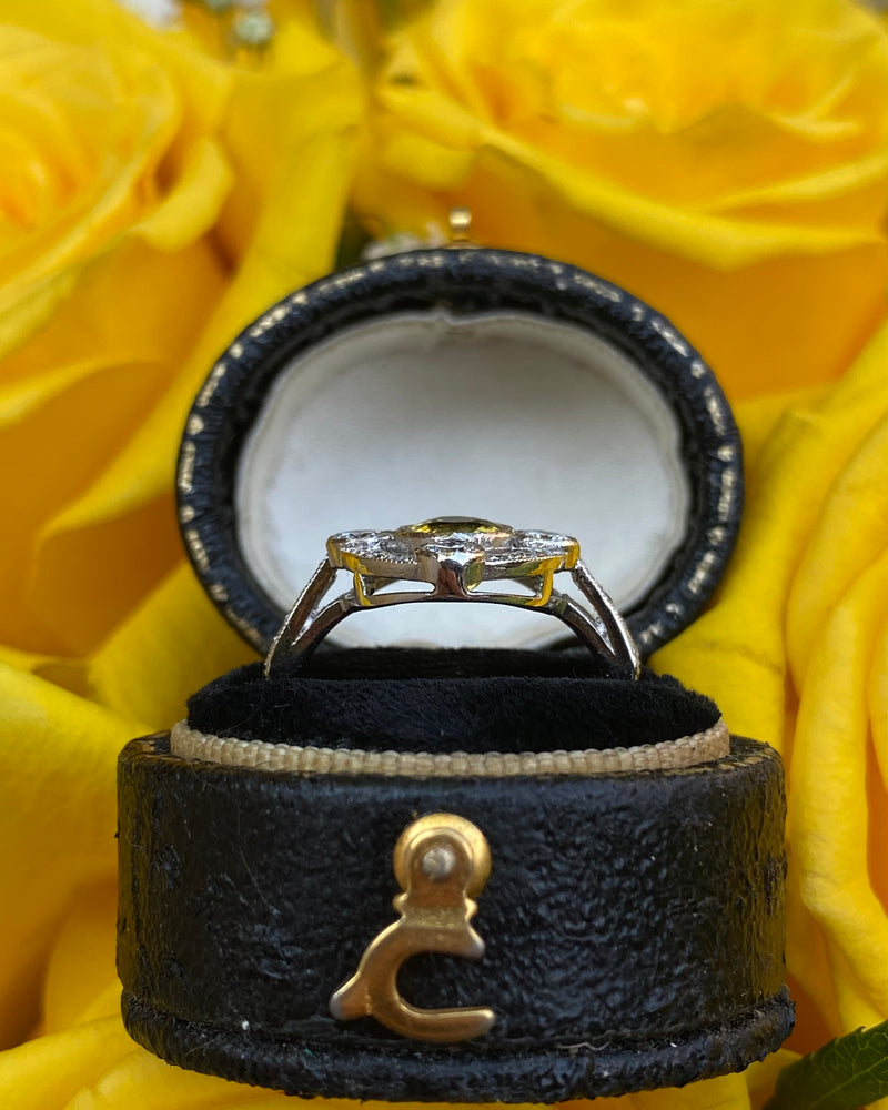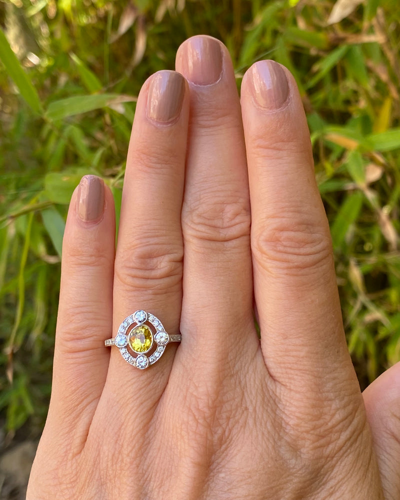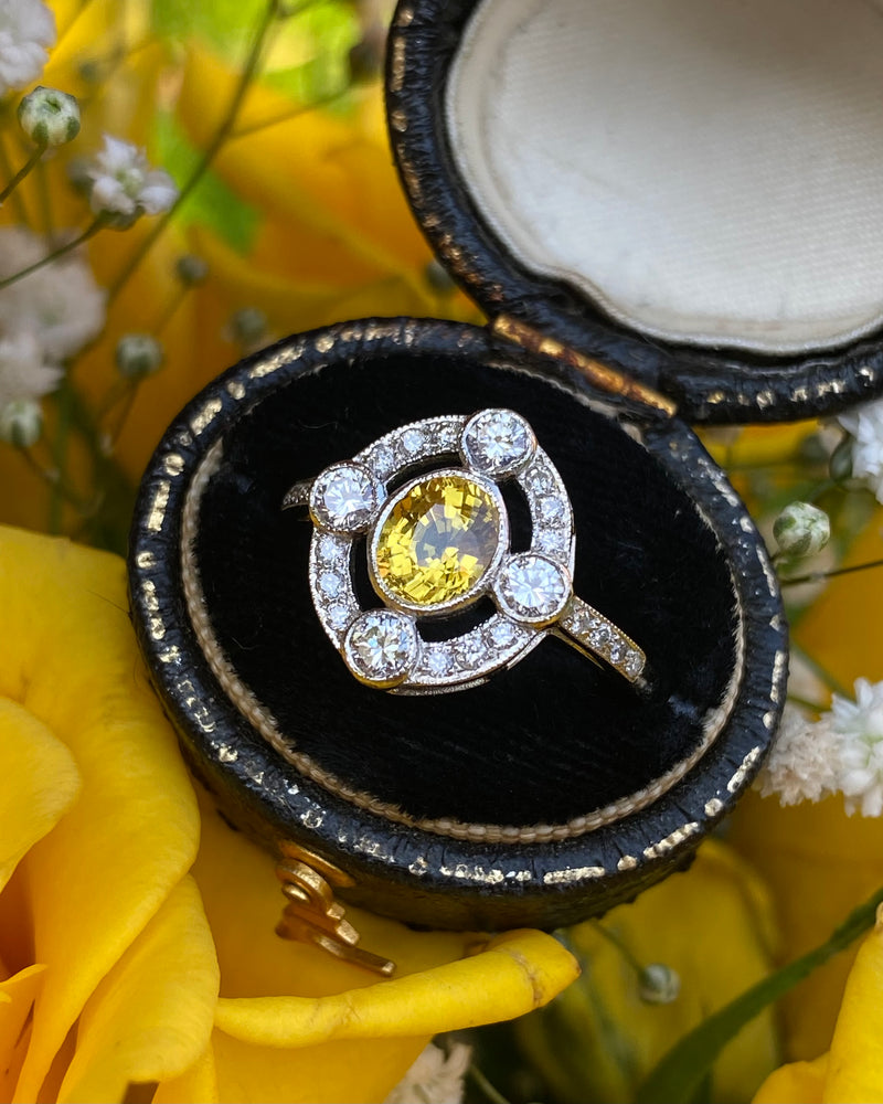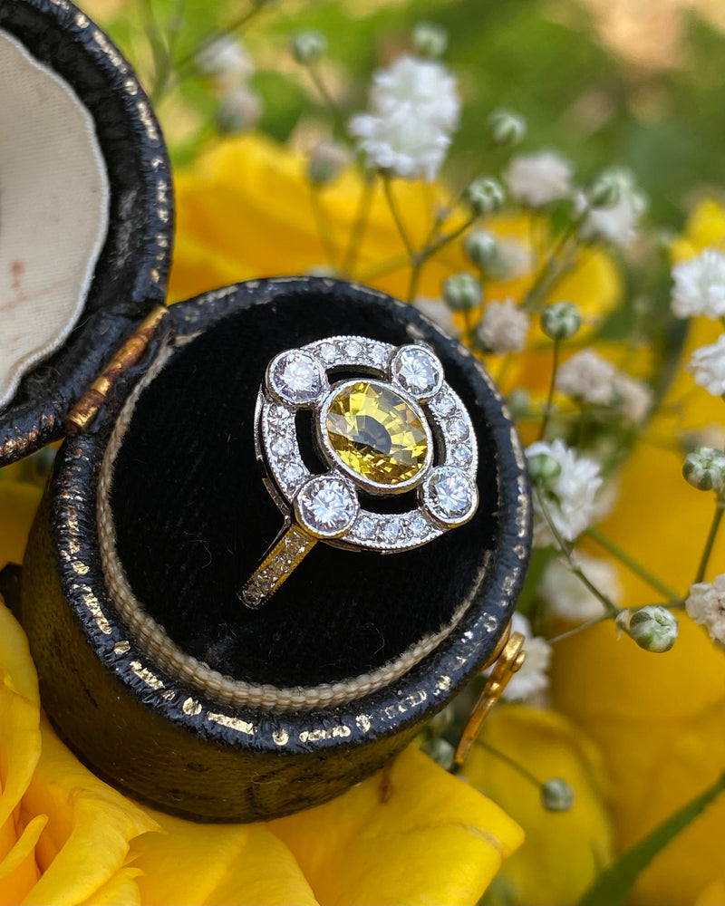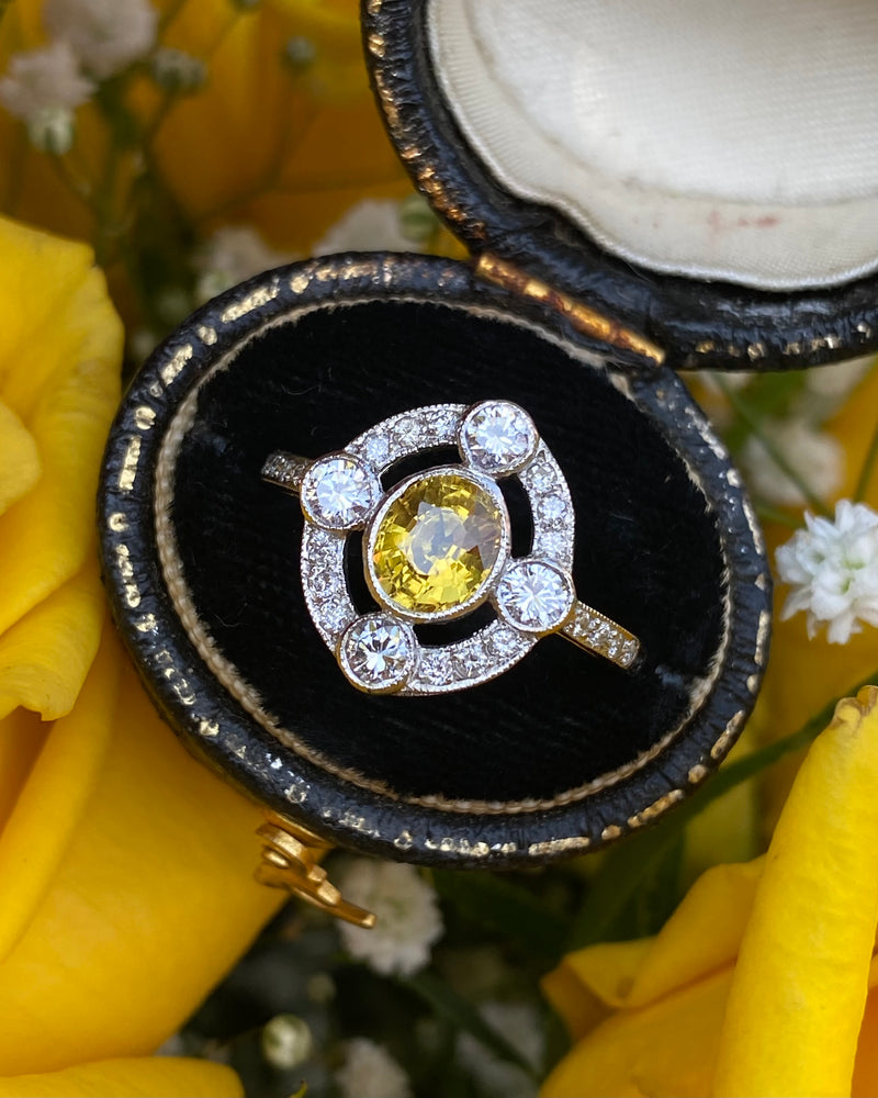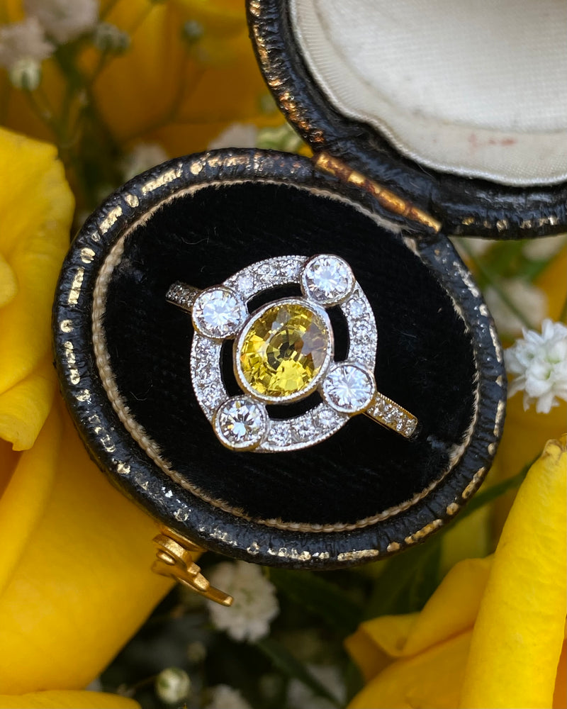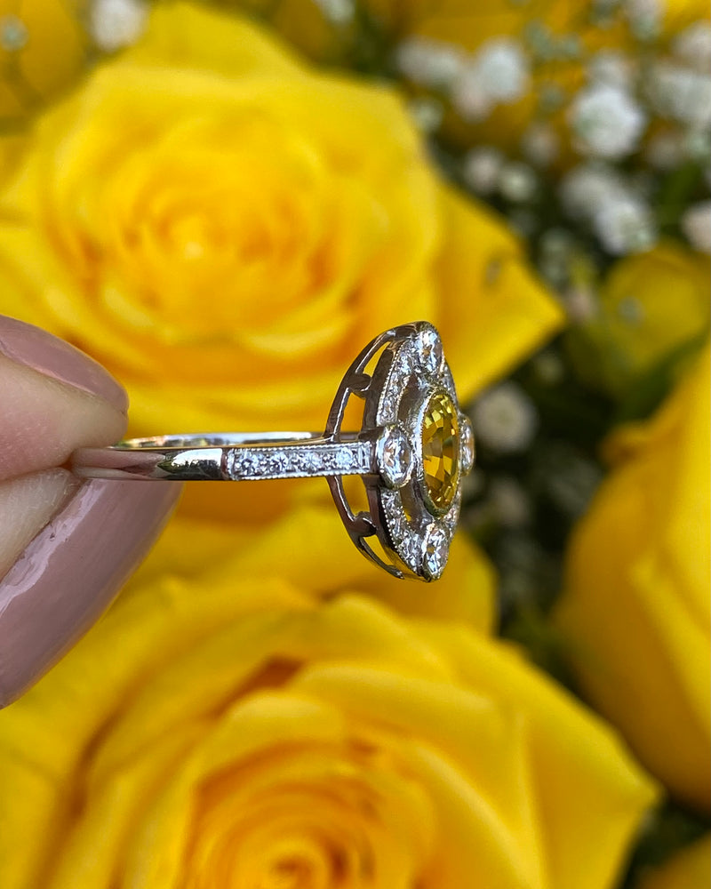 This Art Deco style Yellow Sapphire ring contains a beautiful central Oval Cut sunshine Yellow Sapphire weighing 1.10ct and measuring 6x5mm. There are larger Round Brilliant Cut Diamonds rub over set North, South, East and West above the central Yellow Sapphire, connected by a surround of Pave set Diamonds. In addition to this, further Diamonds are set in the shoulders of the ring, all finished with a fine milgrain edging with a total Diamond weight of 0.35ct and great H/I colour, VS/SI clarity. This ring is sunny and vibrant, you can't help but smile when you are wearing it!