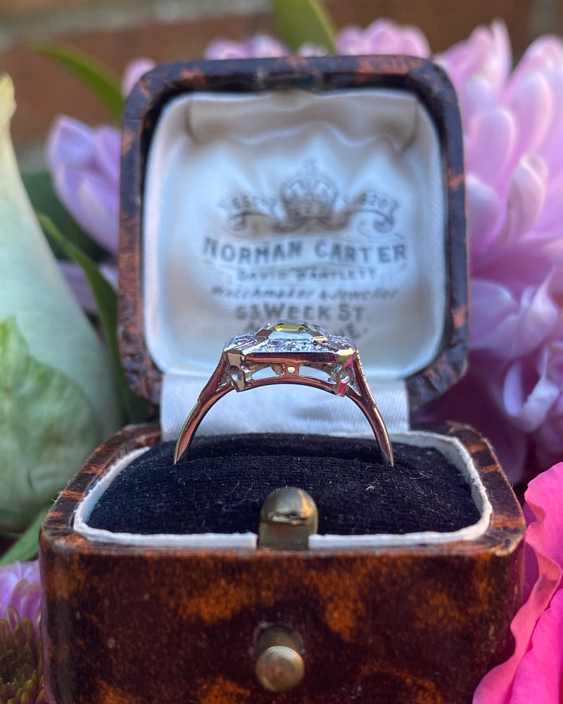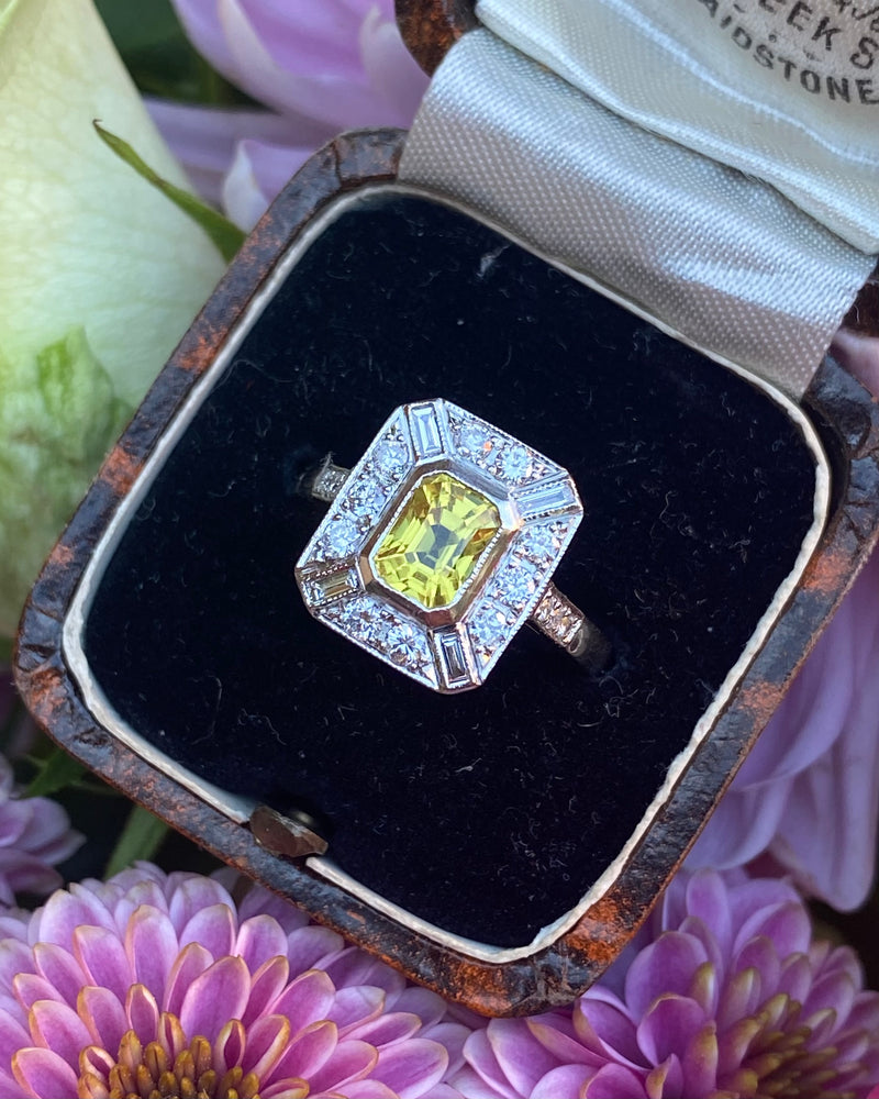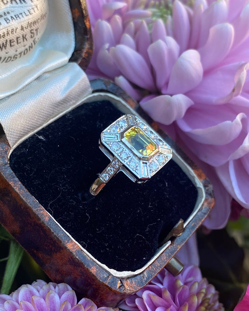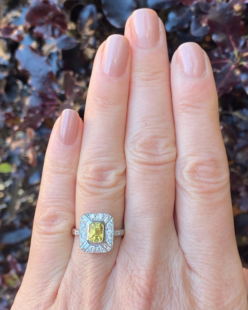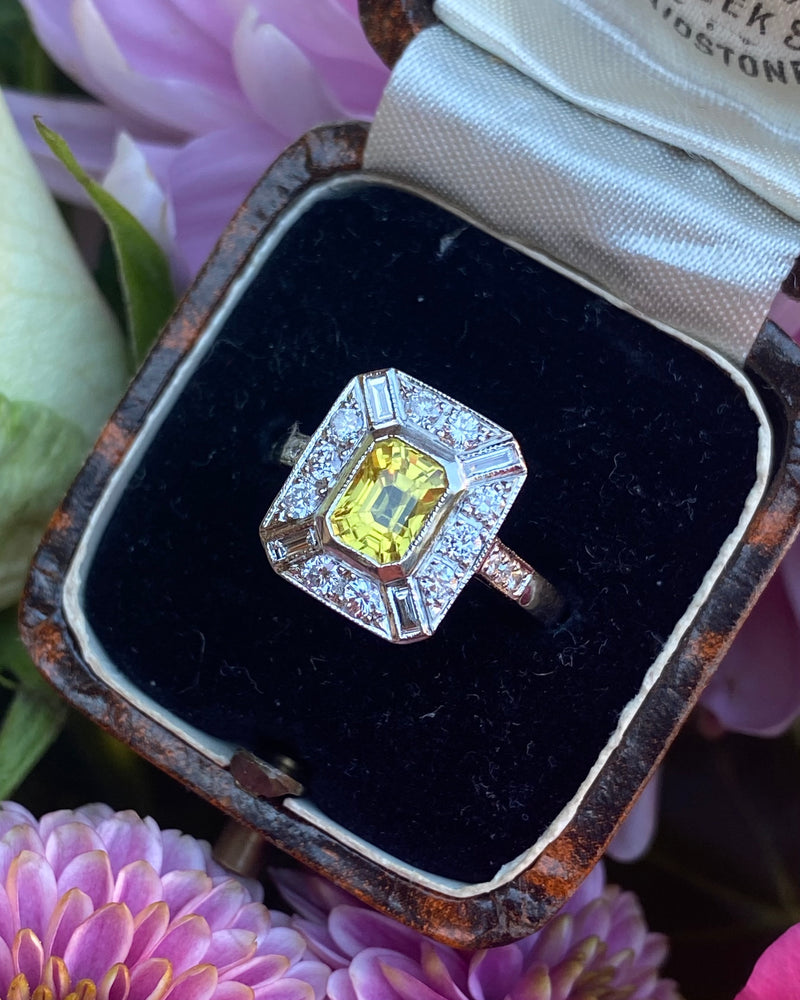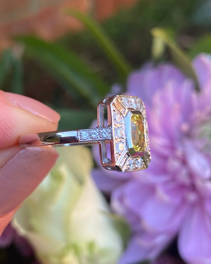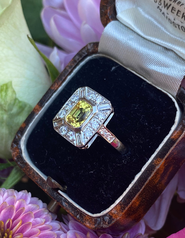 This is a beautiful Art Deco style Yellow Sapphire and Diamond Ring! Sunny and vibrant, you can't help but smile wearing it. Set entirely in Platinum it looks great quality, it feels it too. The central 1.20ct Yellow Sapphire is a lovely Emerald Cut shape and a gorgeous sunshine yellow and is set in a Rubover setting showing off the stone to full effect. Surrounding the central stone are Rubover and Pave set Brilliant Cut Diamonds and Baguette cut Diamonds with a total diamond weight of 0.50ct, all finished with a fine Milgrain edging. The Yellow Sapphire measures 6.5mm x 5mm and is a gorgeous rich colour. The Brilliant Cut Diamonds are bright and full of life, H/I colour, VS/SI clarity. The ring sits nice and low on the finger and is easy to wear.