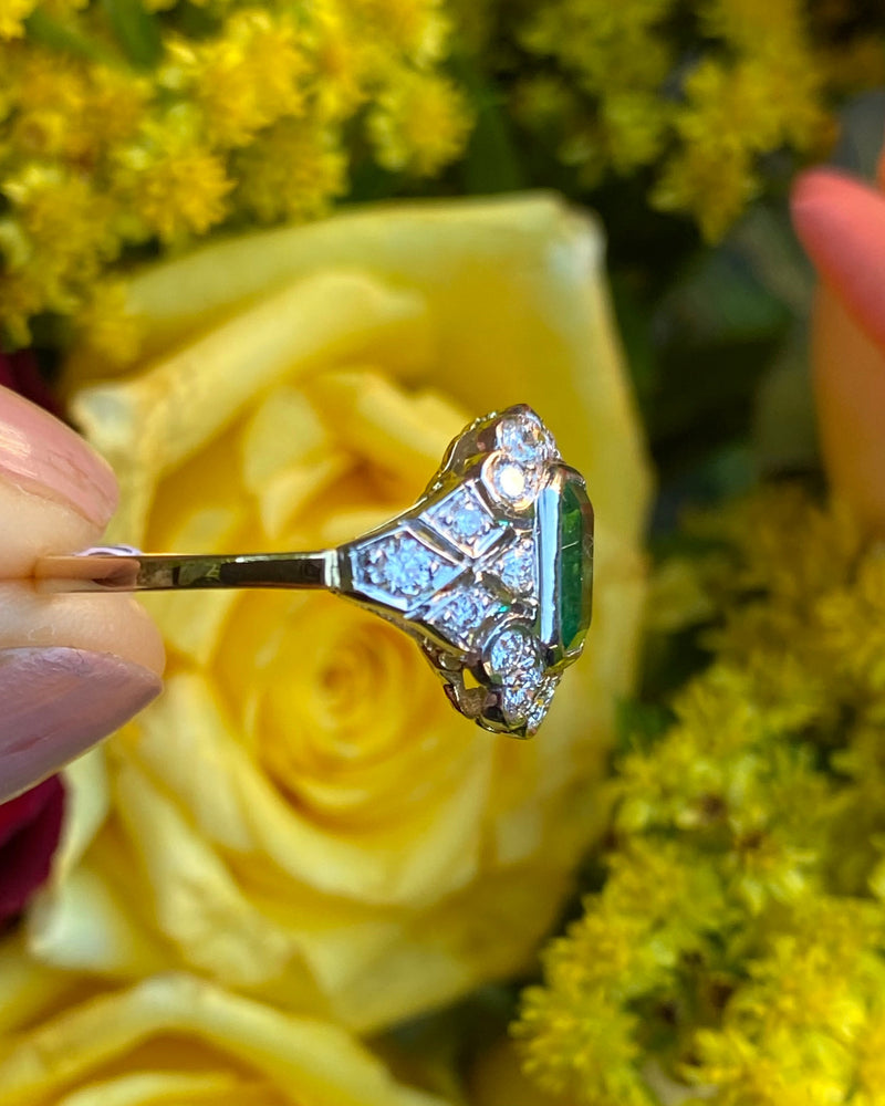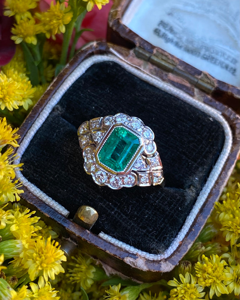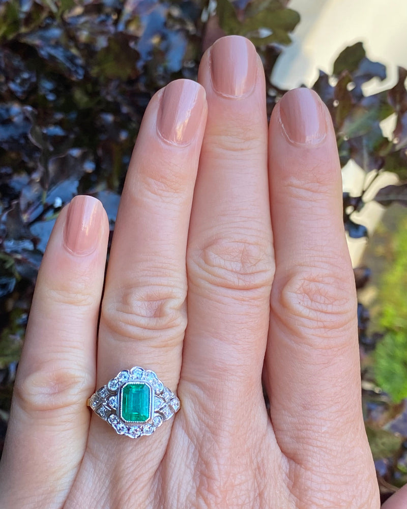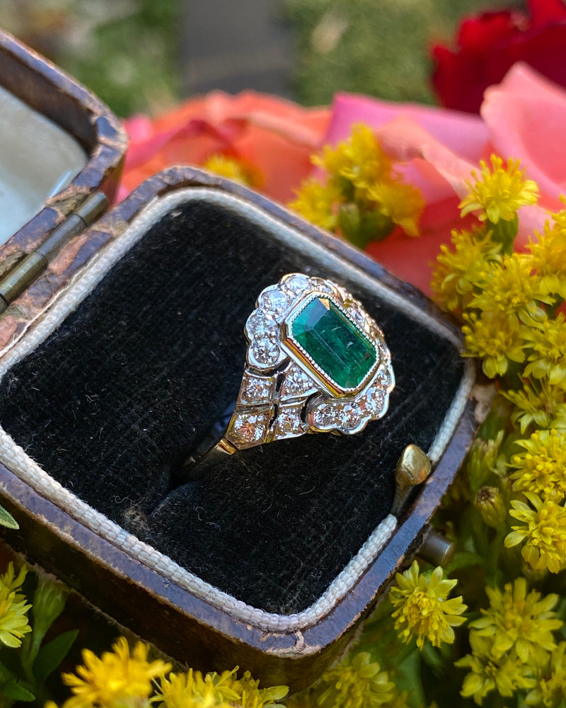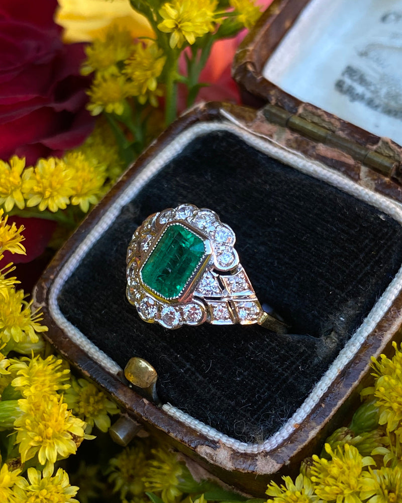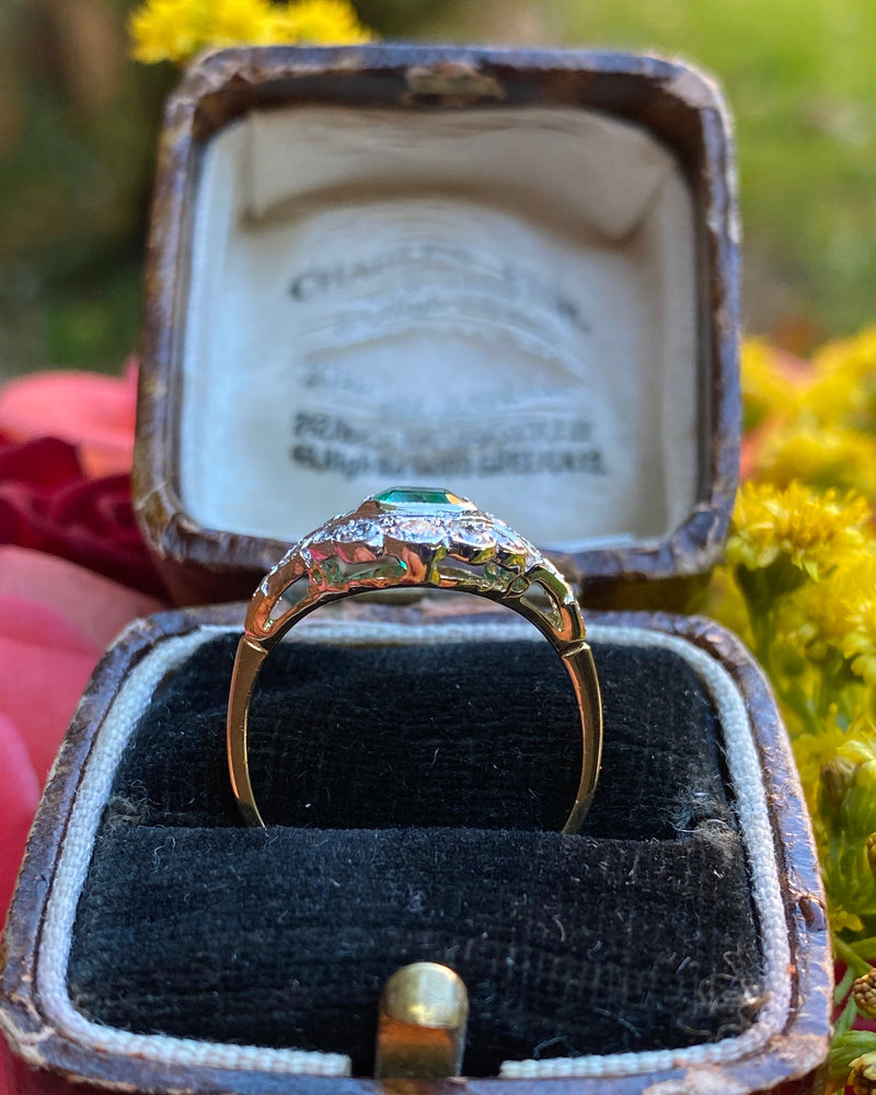 Edwardian Style Emerald and Diamond Cluster Ring 18ct Yellow Gold 0.60ct + 1.20ct