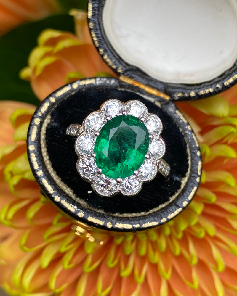 A lovely Emerald and Diamond Cluster Ring with a fantastic central 2.80ct Oval Cut Emerald of a lovely colour and clarity in a Claw setting. The Emerald is surrounded by ten substantial sized Round Brilliant Cut Diamonds with three round diamond set in the shoulders in a pave setting finished with a fine milgrain edging with a total diamond weight of 1.35ct. The Diamonds colour and clarity are H/I, VS/SI and are set in a traditional Rubover setting. The ring is made entirely of heavy, fine quality Platinum.