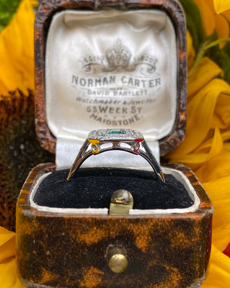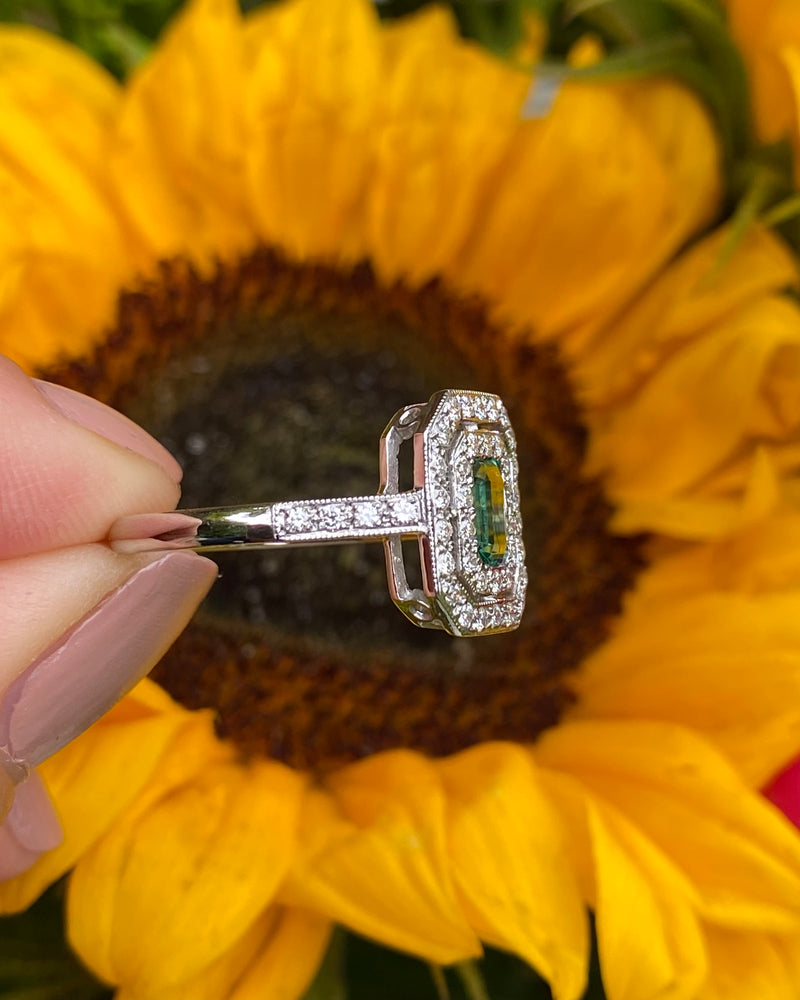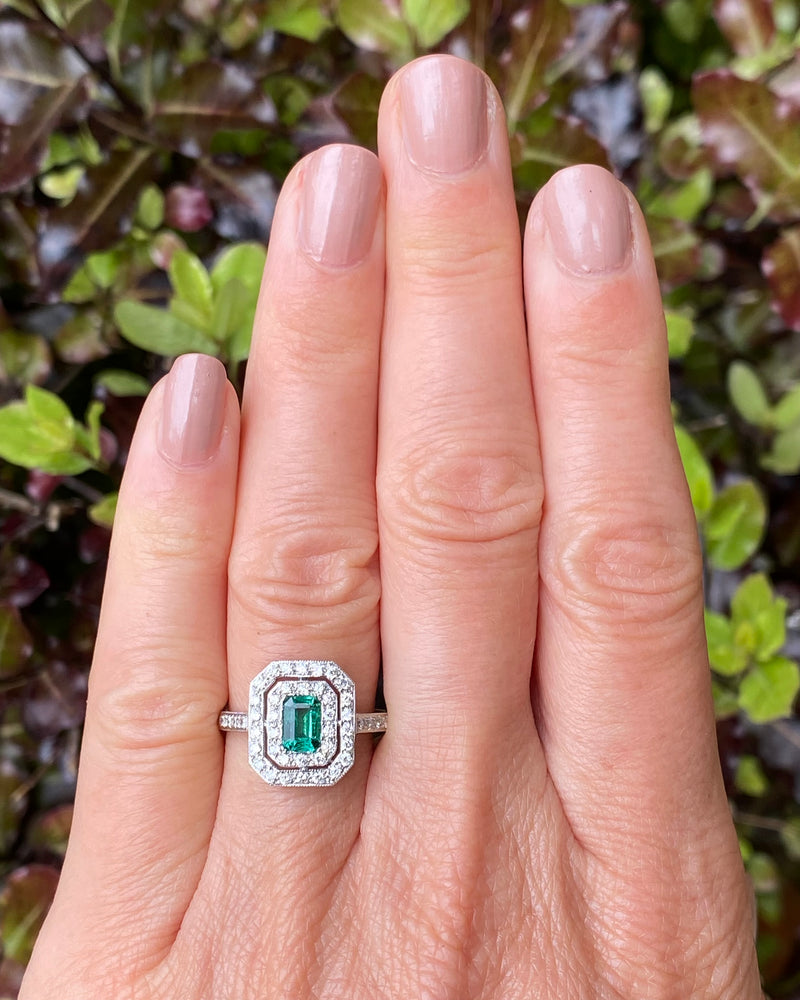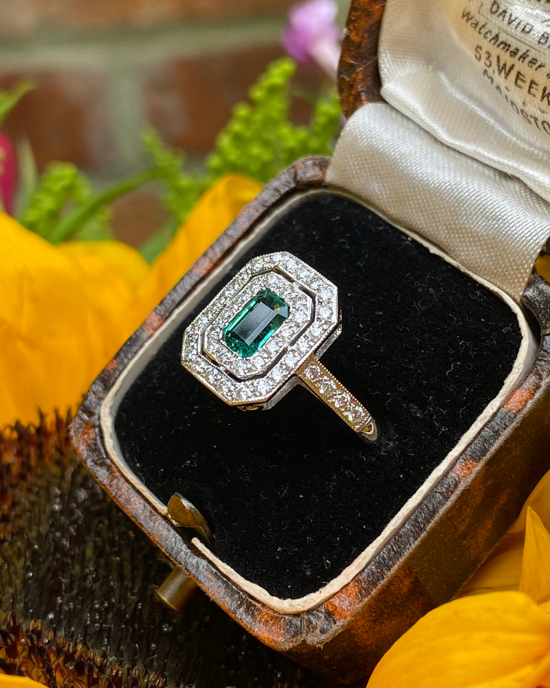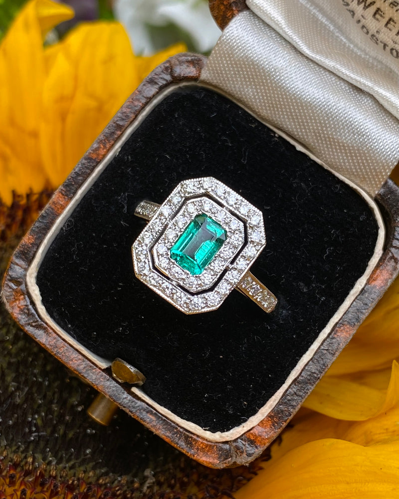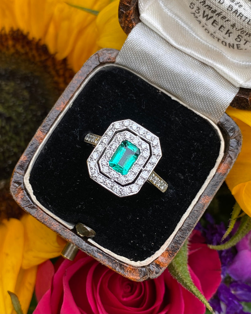 A fabulous Art Deco style Emerald and Diamond Ring with a gorgeous central Emerald Cut Emerald set in a rub over setting and surrounded by two rows of Brilliant Cut Diamonds. The 0.60ct Emerald measures 6mm x 4mm and is a wonderful clear, vibrant green, beautifully offset by the surrounding Pave set Diamonds in two octagonal shapes of increasing size. The dazzling Diamonds are bright and lively stones, of a fine H/I colour and VS/SI clarity. In addition to this, there are a further four Brilliant Cut Diamonds set on each shoulder of the ring within the shank, coming to a total of 0.60ct in Diamond weight.