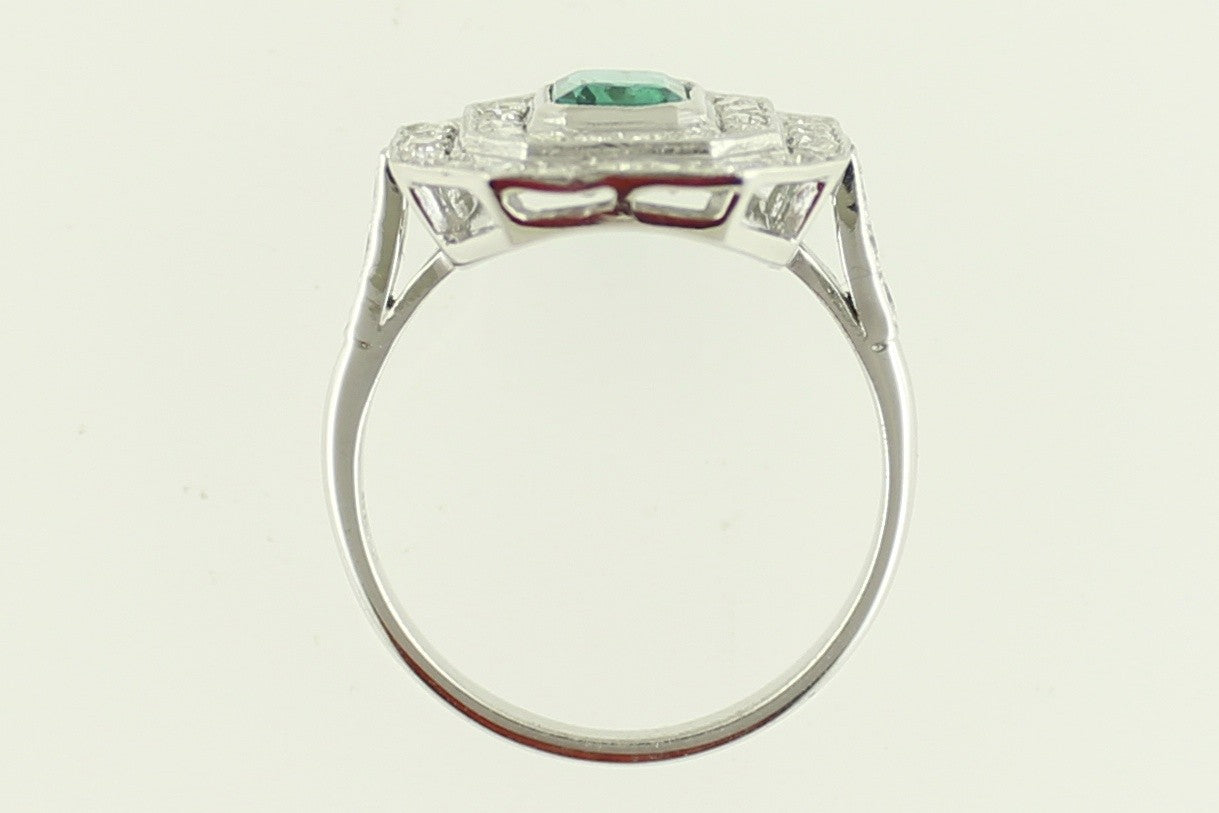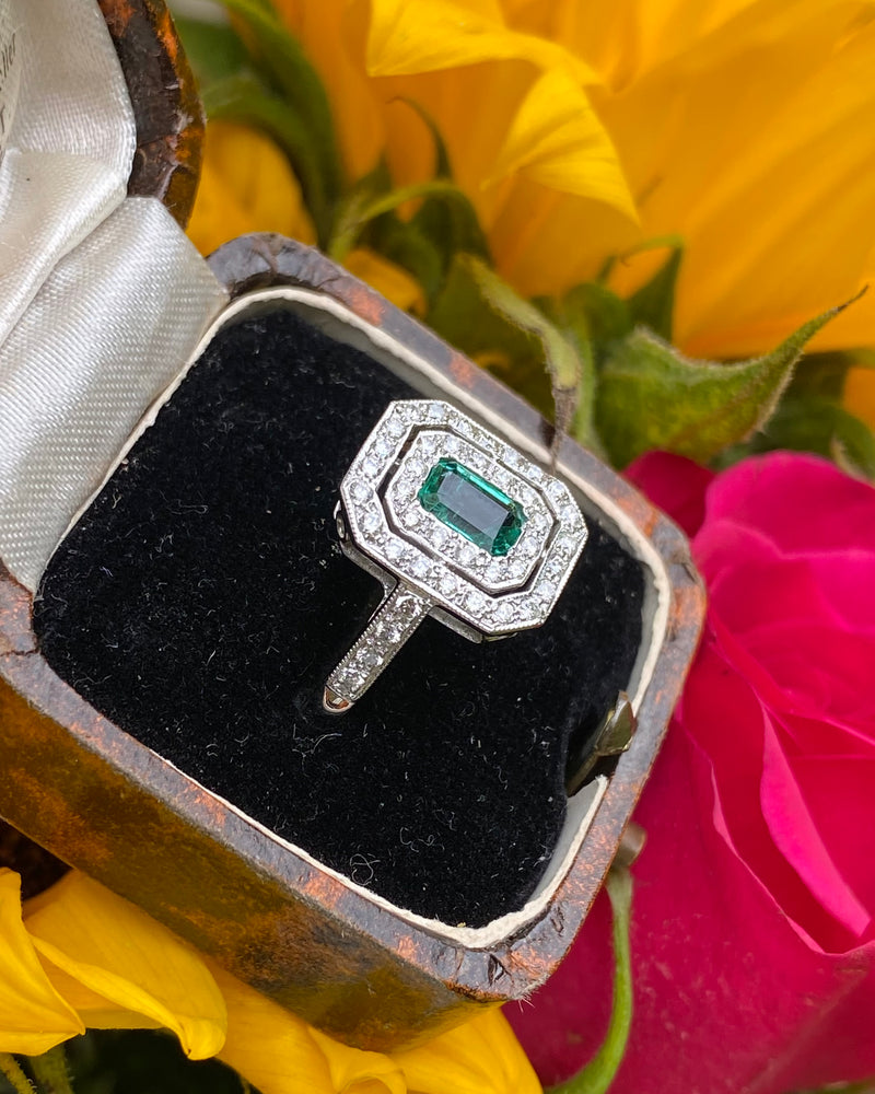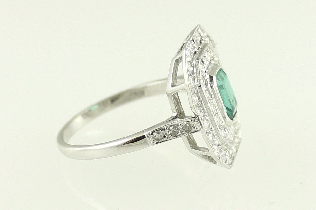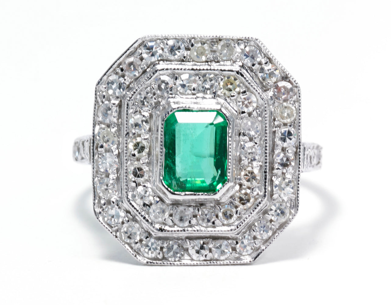 Art Deco Emerald and Diamond Platinum Ring 0.60ct + 0.60ct