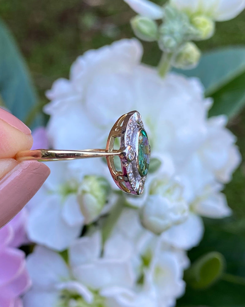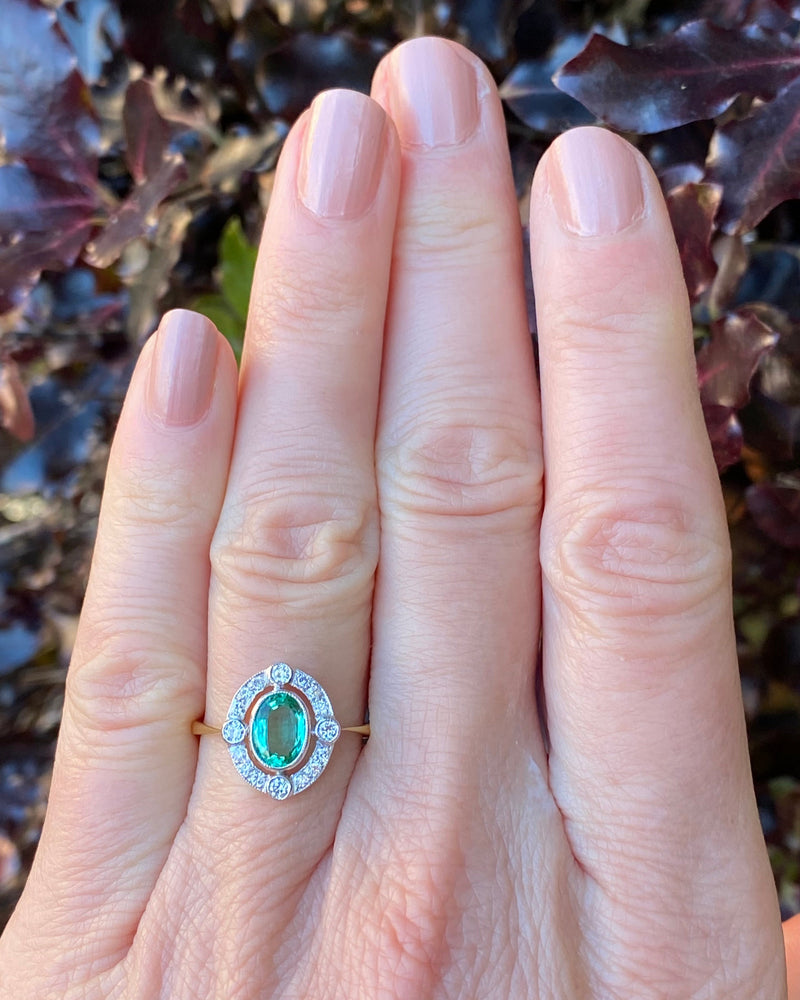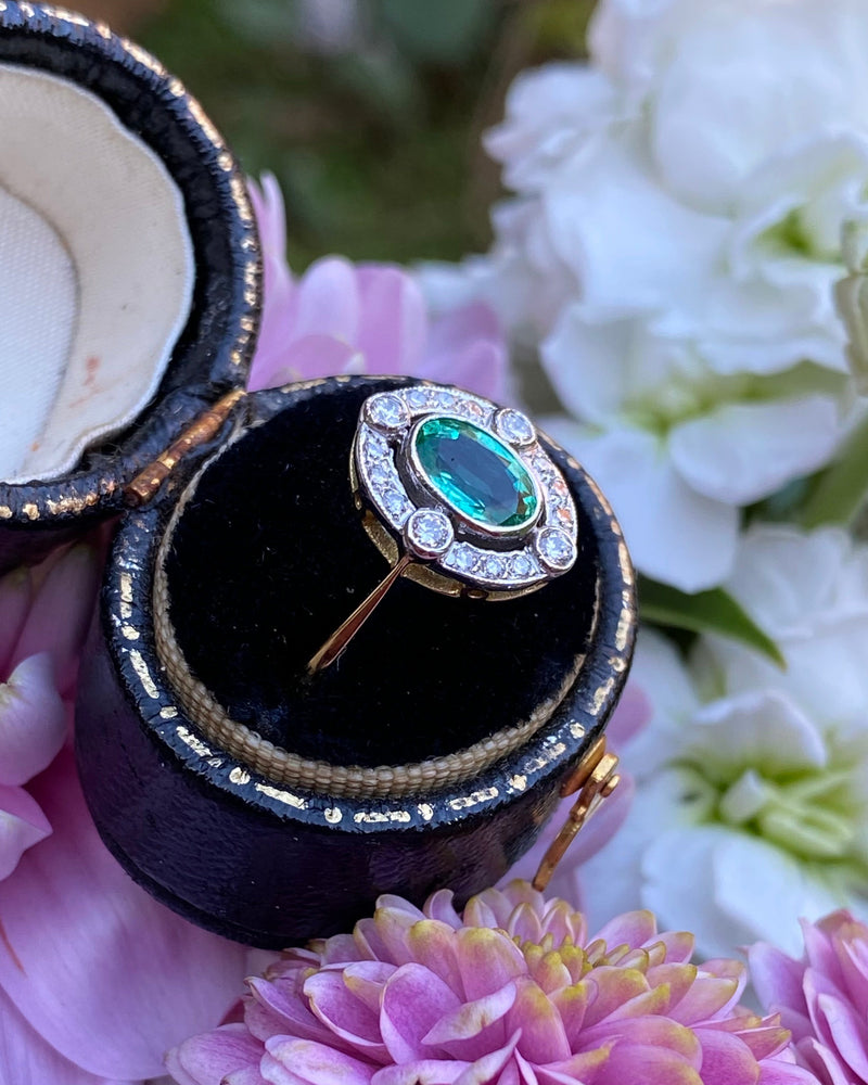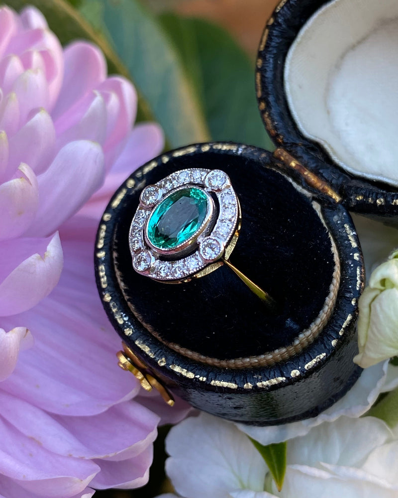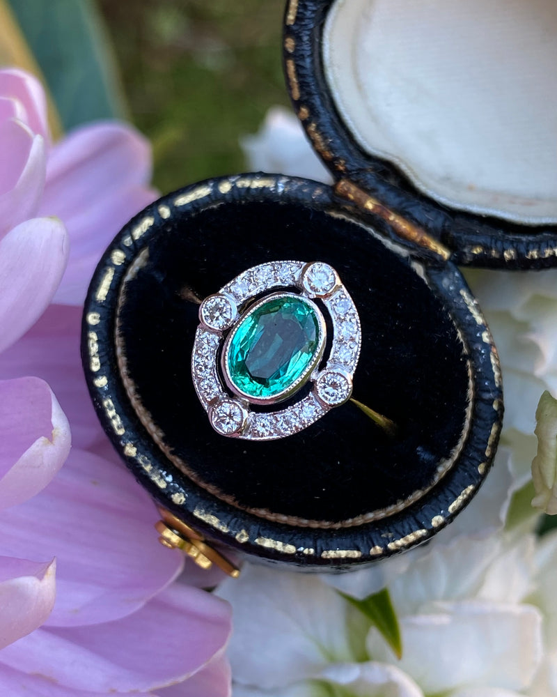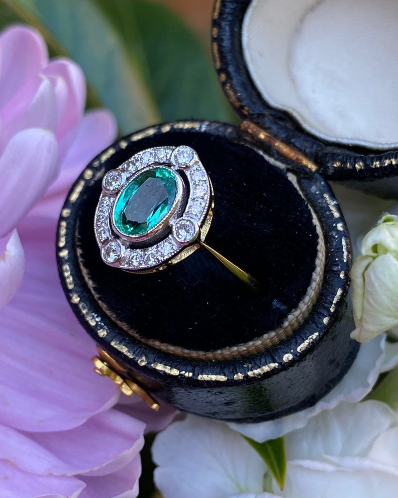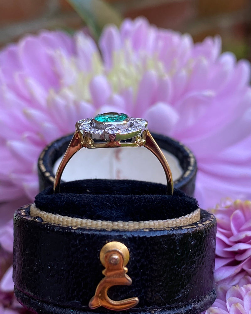 This is a beautifully unique Emerald and Diamond Cluster ring! The Central Oval Cut Emerald is a lovely grassy green colour and is set in a rub over setting finished with a fine milgrain edging. This stunning stone weighs 0.70ct and measures 7mm x 5mm. In addition, there are rub over set Brilliant Cut Diamonds set North, South, East and West in the ring, joined with a row of Pave set Diamonds, all finished with a fine milgrain edging. The total Diamond weight is 0.30ct and they are bright and lively stones of a fine H/I colour and VS/SI clarity. The ring is set in 18ct Yellow Gold, with the head of the ring being set in heavy, high quality Platinum, giving a fabulous overall appearance when worn!