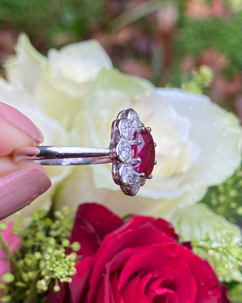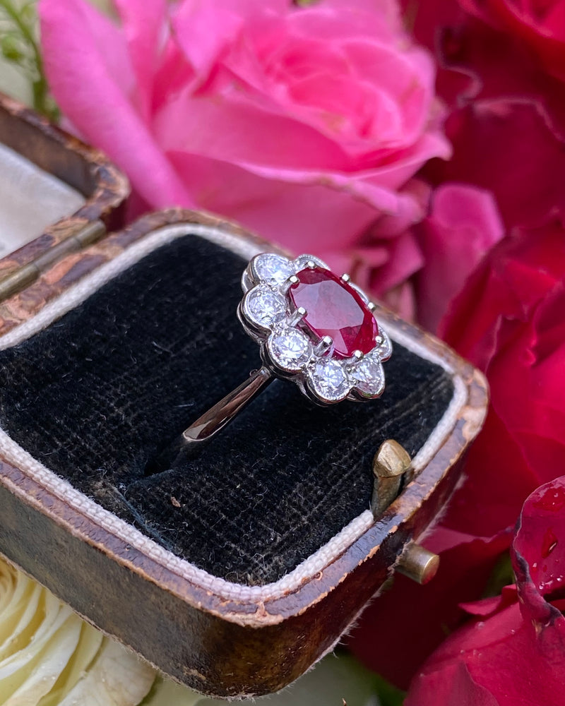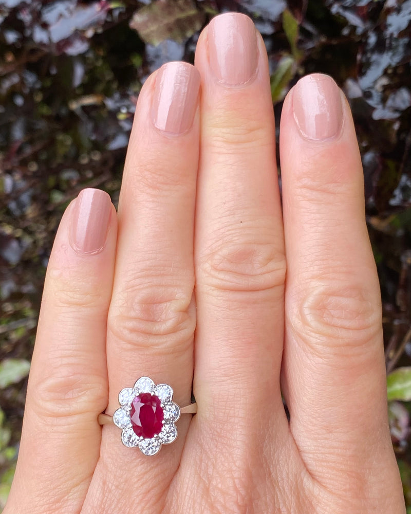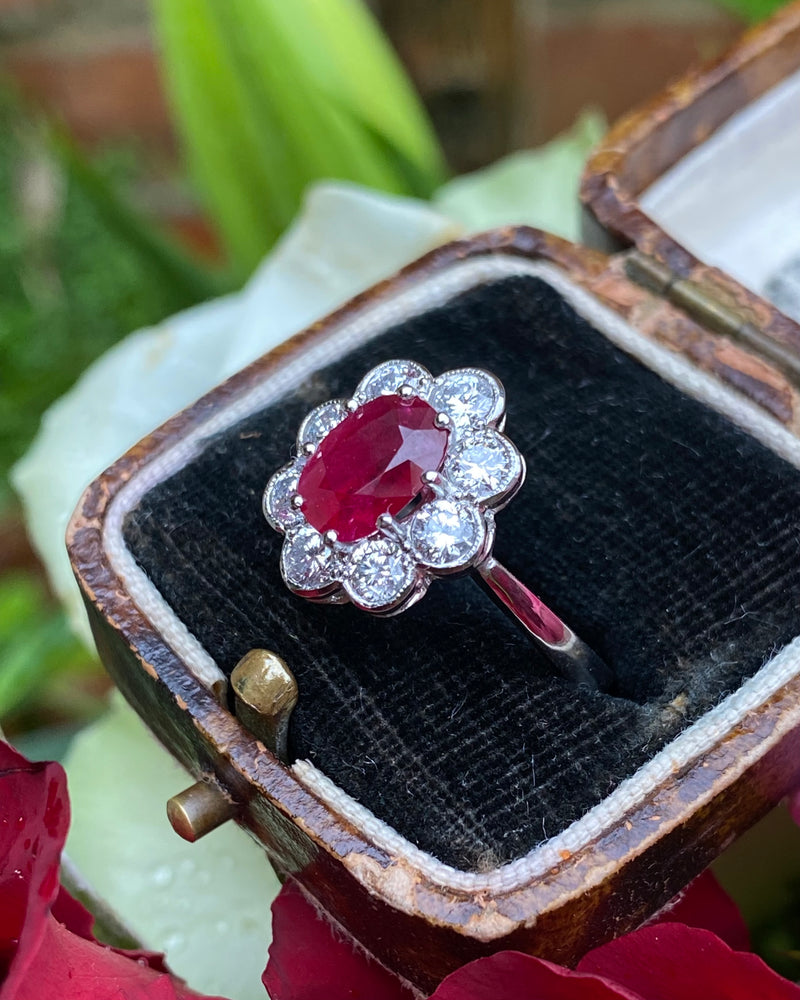 A fine quality Ruby and Diamond Cluster Ring with a beautiful 1.65ct central Claw set Oval Cut Ruby of a lovely blood red colour and clarity measuring 8 x 6mm. The Ruby is surrounded by substantial sized round brilliant cut diamonds of a fine H colour and VS/SI clarity and are Rubover set. The Diamonds total approximately 0.90ct in diamond weight. The ring is set in high quality Platinum. This is a truly stunning ring, perfect for any occasion!