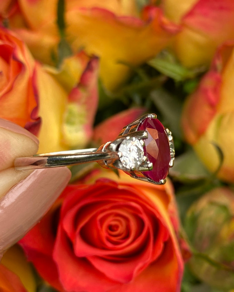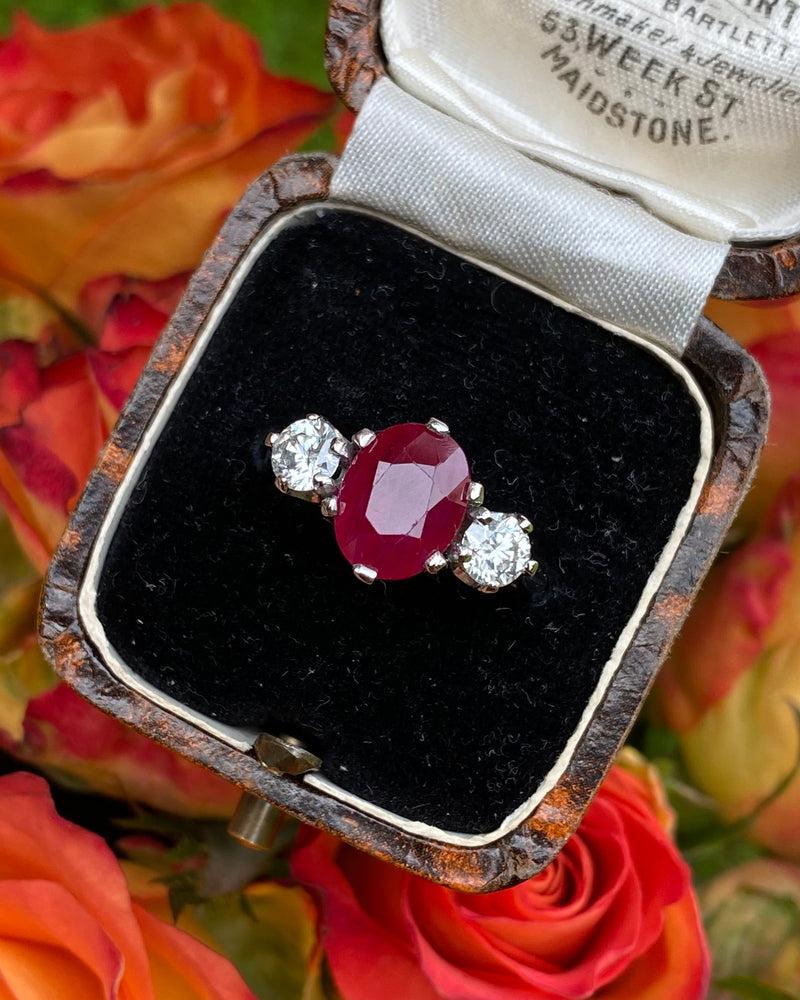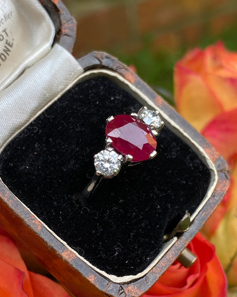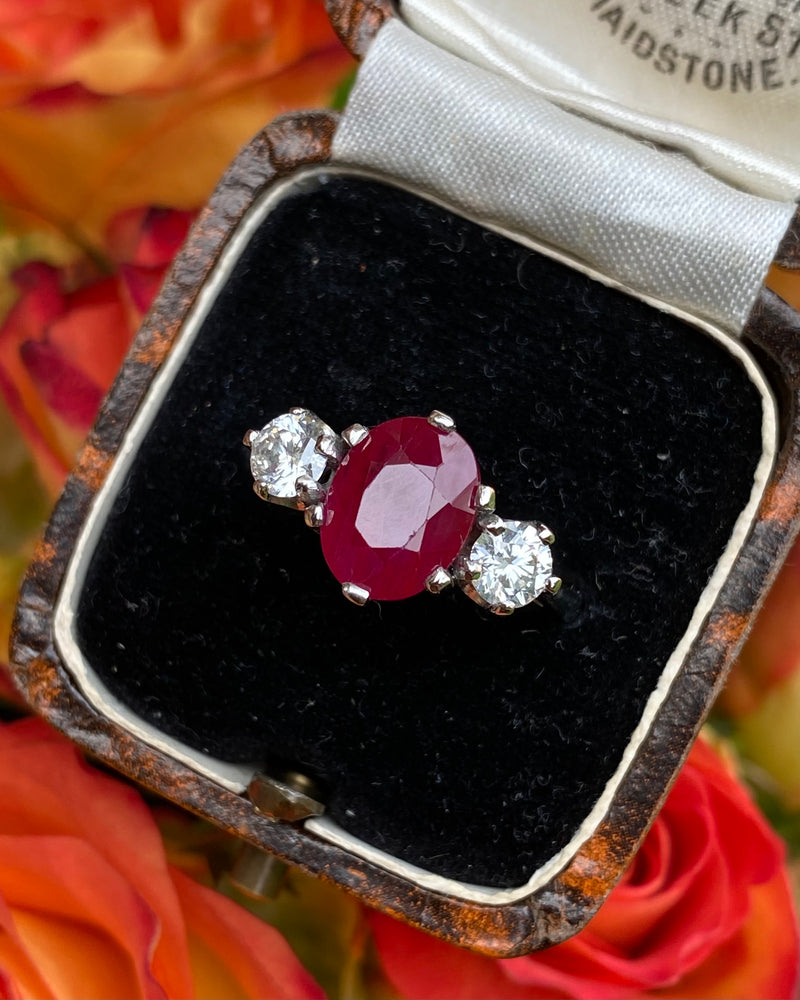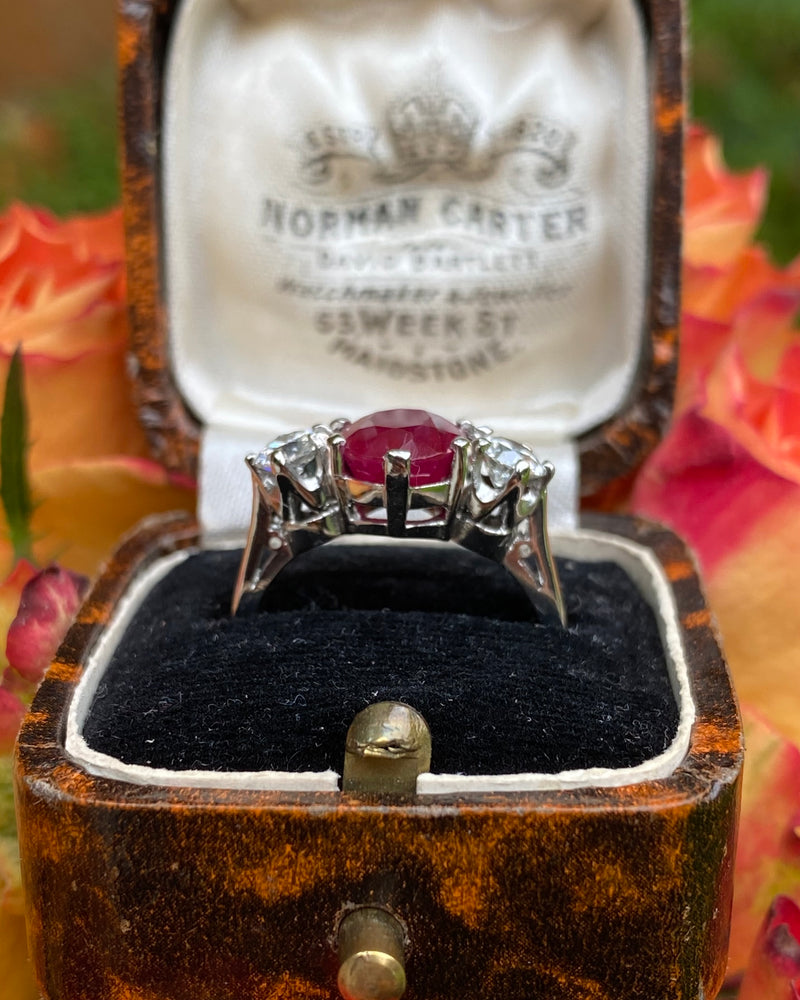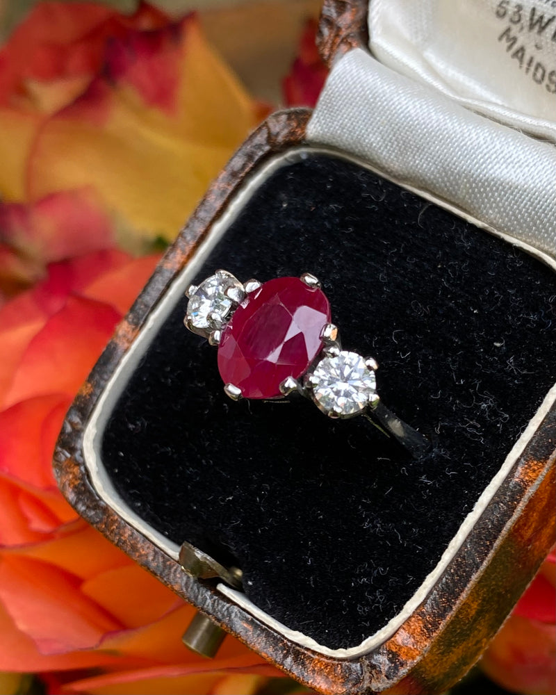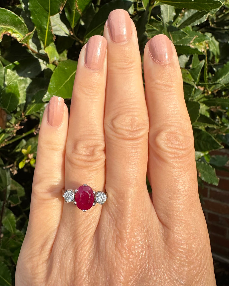 Ruby and Diamond Three Stone Platinum Ring 0.62ct + 2.10ct