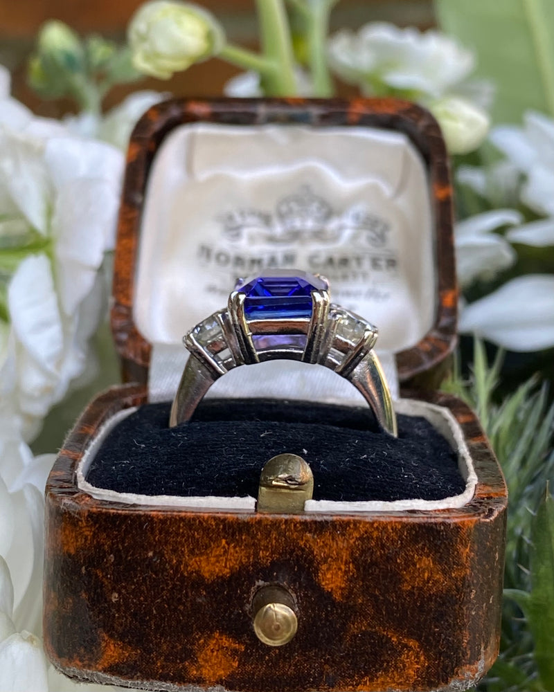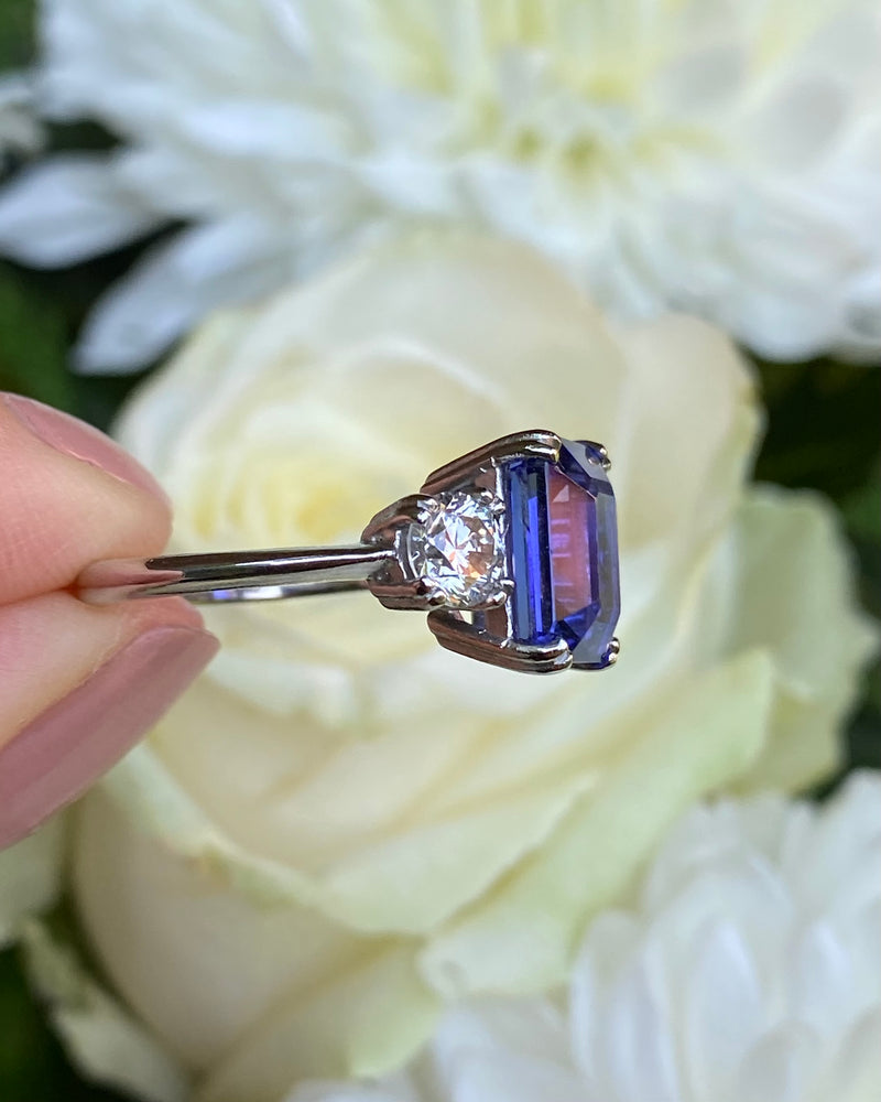 This is a simply stunning Tanzanite and Diamond three stone ring! The central Tanzanite is a beautiful purple blue colour and is extremely clean with no marks whatsoever and weighs an impressive 3.45ct. It is an attractive Emerald Cut, measuring 10mm x 8mm and is set with four double claws. The bright and lively Brilliant Cut Diamonds set either side, perfectly offset the colour of the Tanzanite, are I/J colour, VS/SI clarity and weigh a total of 0.90ct. These are also set in a four double claw setting.