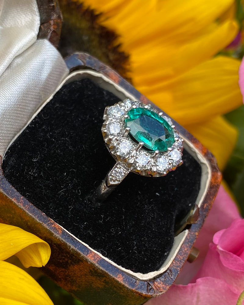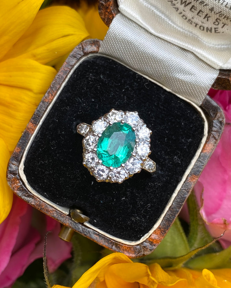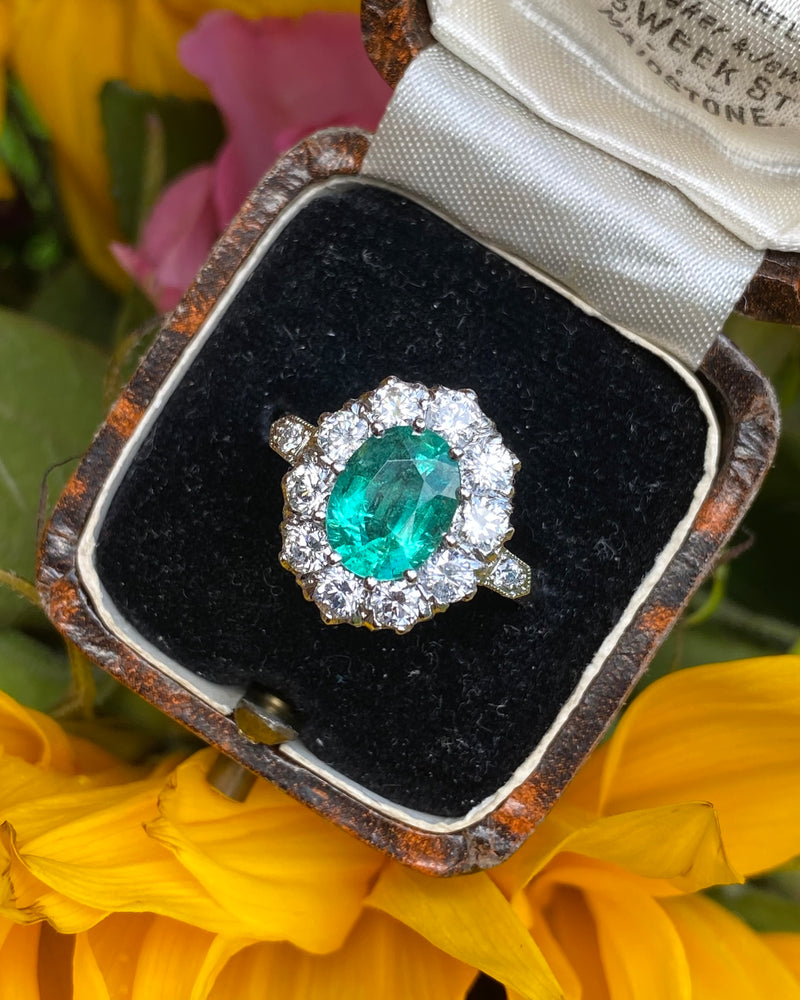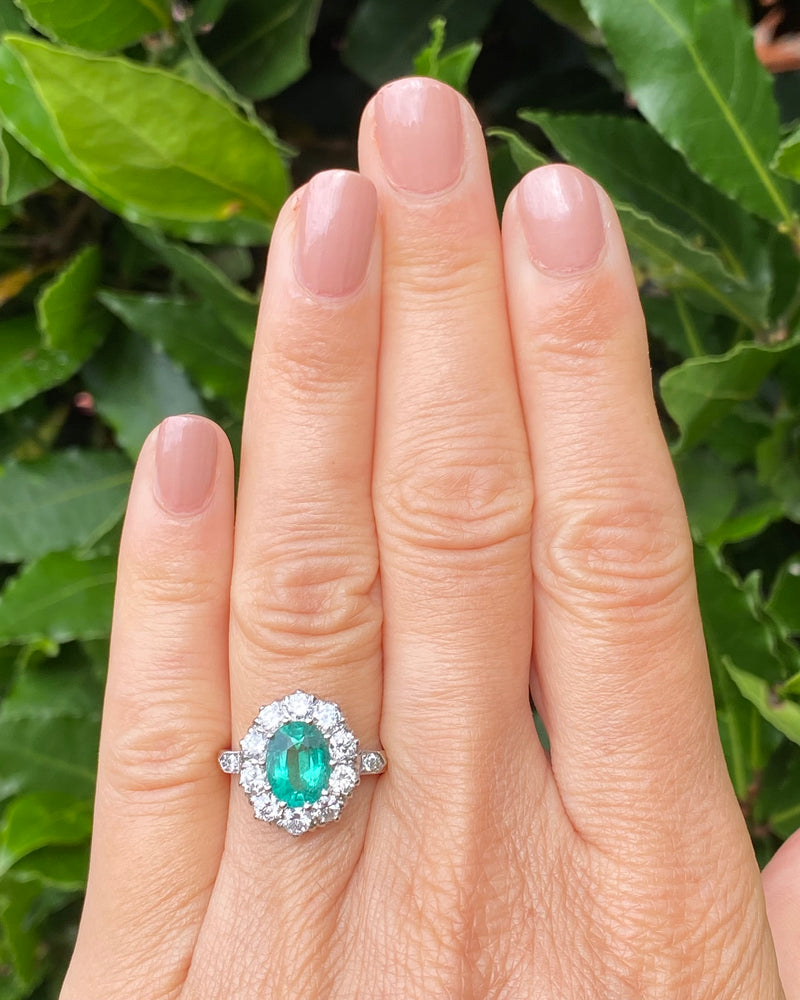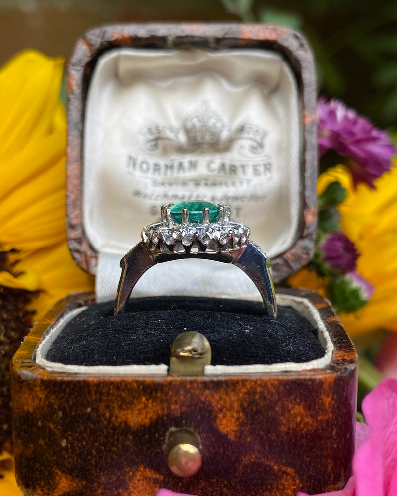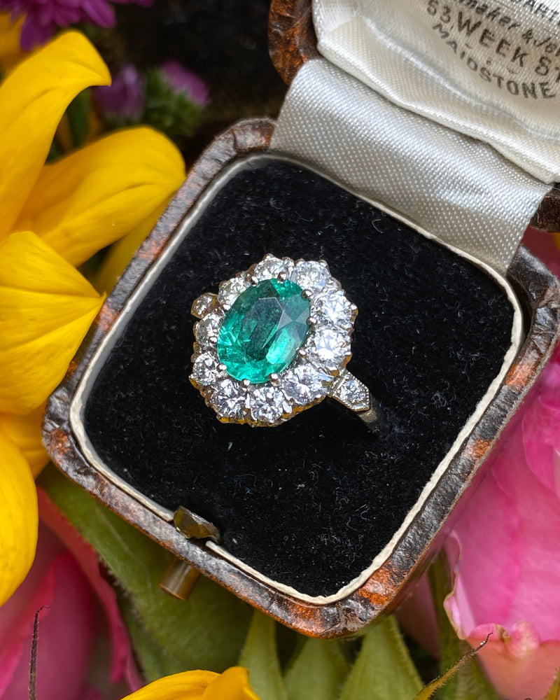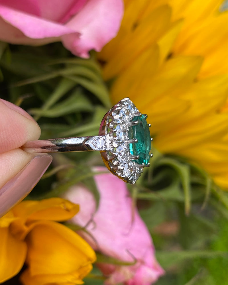 Victorian Emerald and Diamond Platinum Cluster Ring 1.35ct + 1.50ct