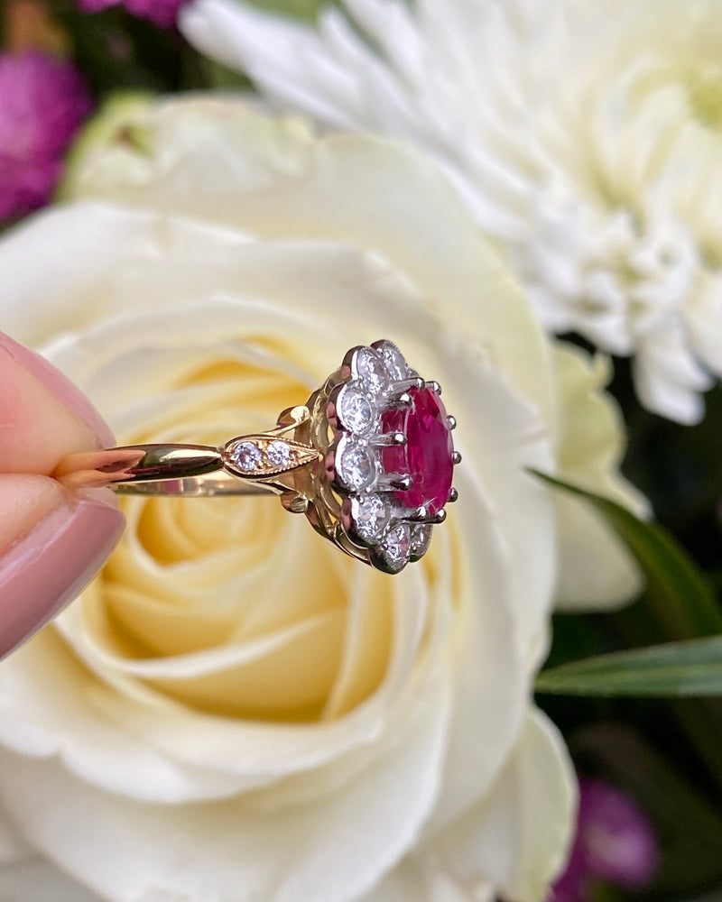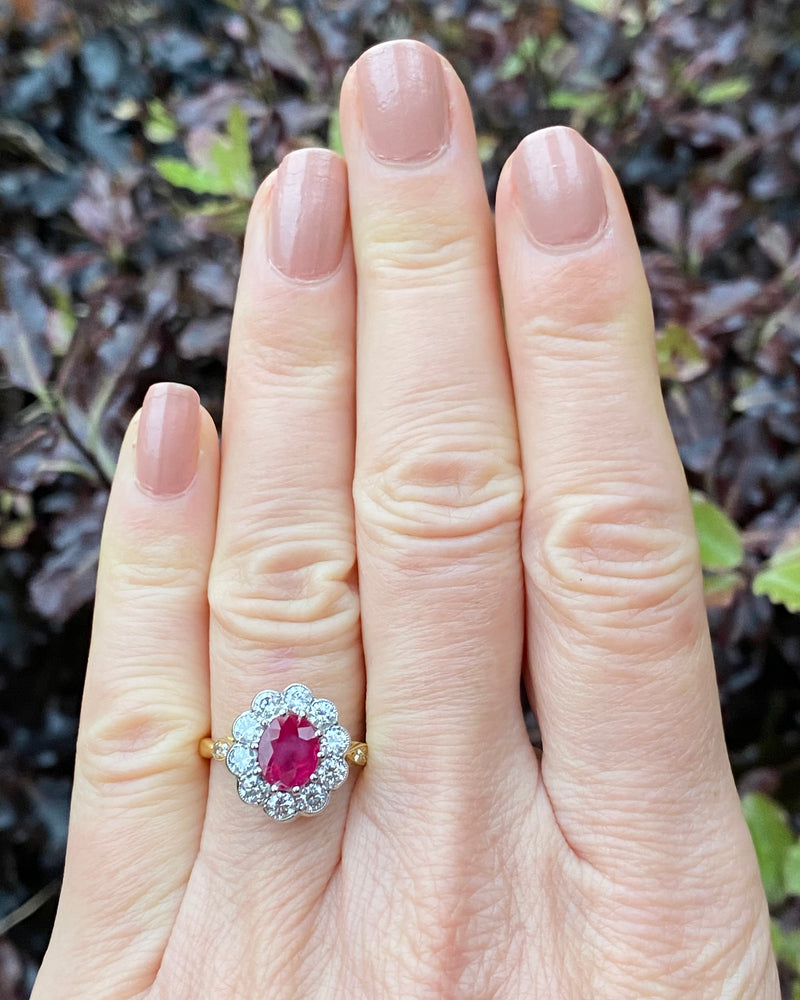 A lovely Victorian style Ruby and Diamond Cluster Ring. The Ruby is great colour and clarity, measures 8mm x 6mm and weighs 1.90ct. Ten Brilliant Cut Diamonds surround the Ruby, with additional Diamonds Pave Set in the shoulders of the ring. The Diamonds are nice and bright and weigh 0.95ct, H/I colour and VS/SI clarity. The Ruby is claw set and the Diamonds are set in a traditional Rubover style setting with fine milgrain edging. The dazzling Diamonds in the shoulders of the ring are pave set. The ring is made in 18ct Yellow Gold, with the head of the ring being set in heavy, high quality Platinum. This ring is unique and sparkling, the perfect ring for any occasion!