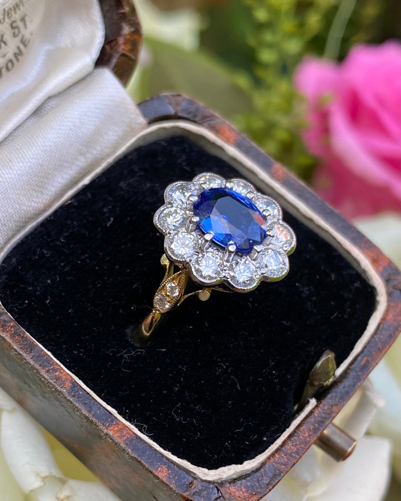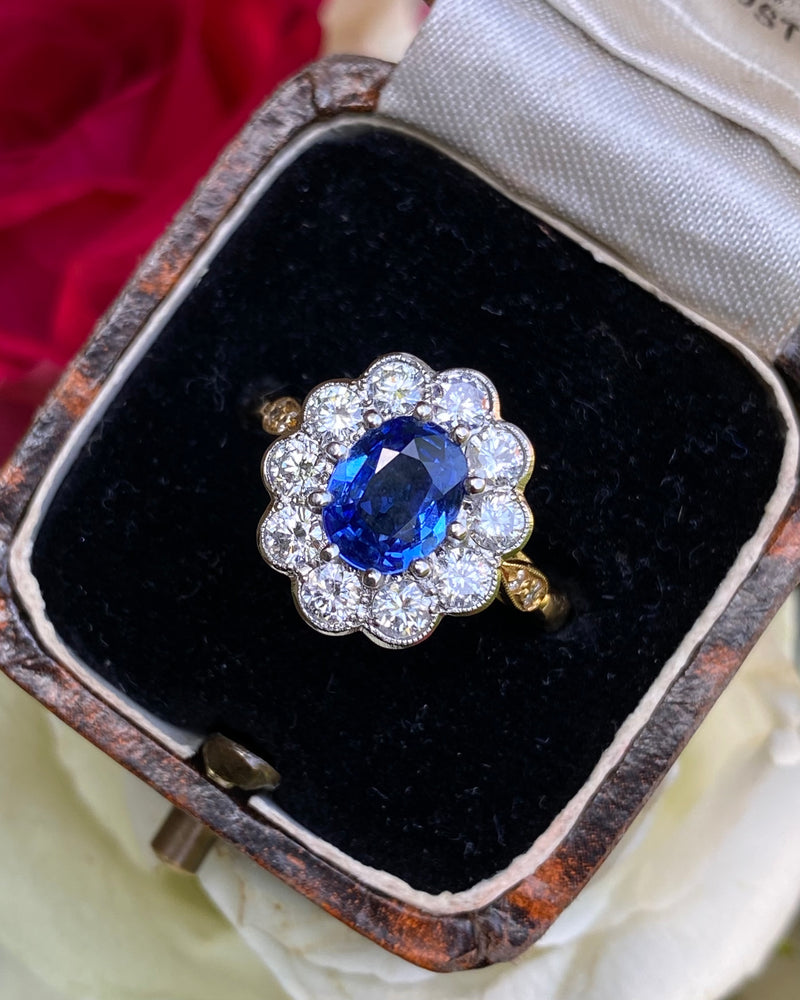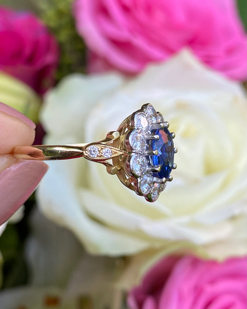 A gorgeous Victorian Style Sapphire and Diamond Cluster Ring! The beautiful Central Oval Cut Sapphire is claw set, weighs 1.55ct and measures 8mm x 5.5mm. It is a lovely sought-after vibrant rich blue colour and is surrounded by ten Old Cut Diamonds set in a fine claw setting with a unique addition of a two Diamonds Pave set either side in a pretty petal shaped design leading down in to band of the ring. The ring is made entirely in 18ct Yellow gold, with the head of the ring being set in heavy, high quality Platinum - this ring is really unusual and really compliments the Sapphire and Diamond cluster! The Diamonds are bright stones with no marks visible to the naked eye, approximately H/I colour VS/SI clarity and sparkle beautifully and have a total weight of 0.95ct. The under bezel is an attractive basket shape and sits nice and low on the finger.