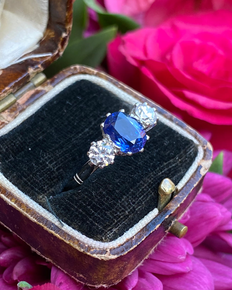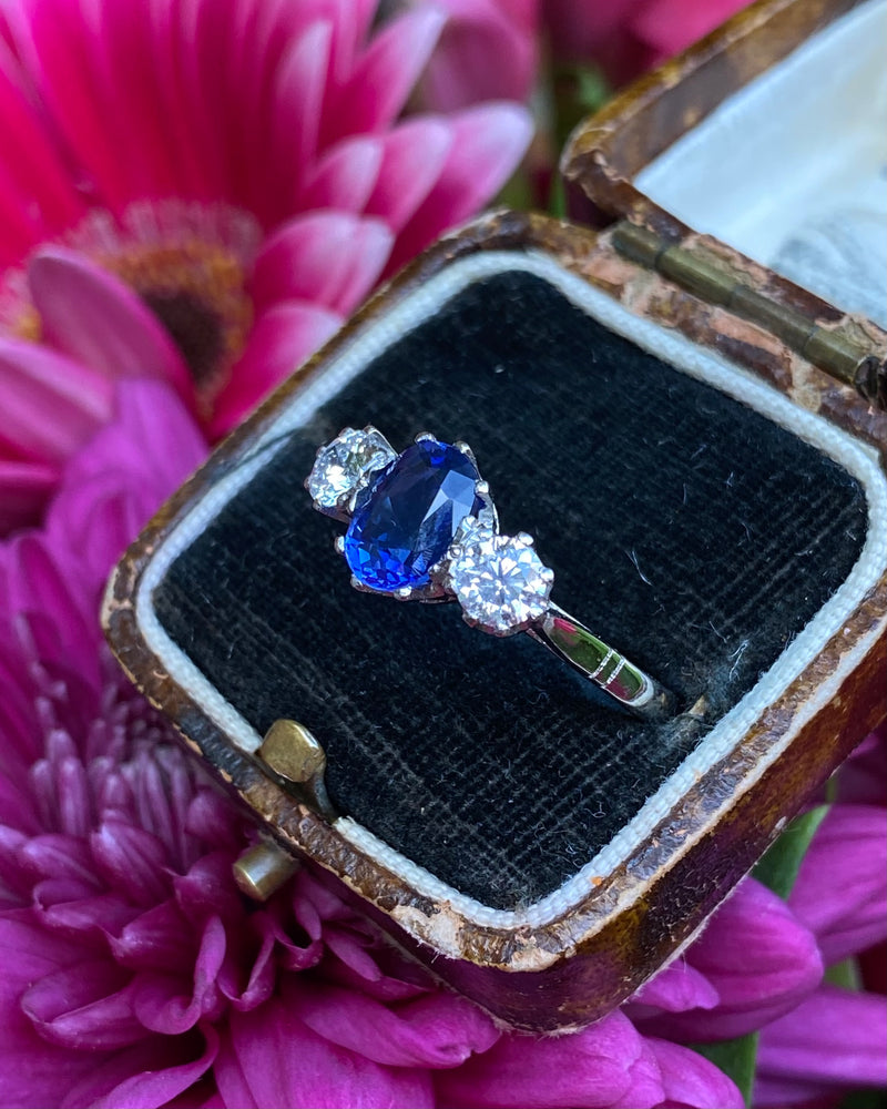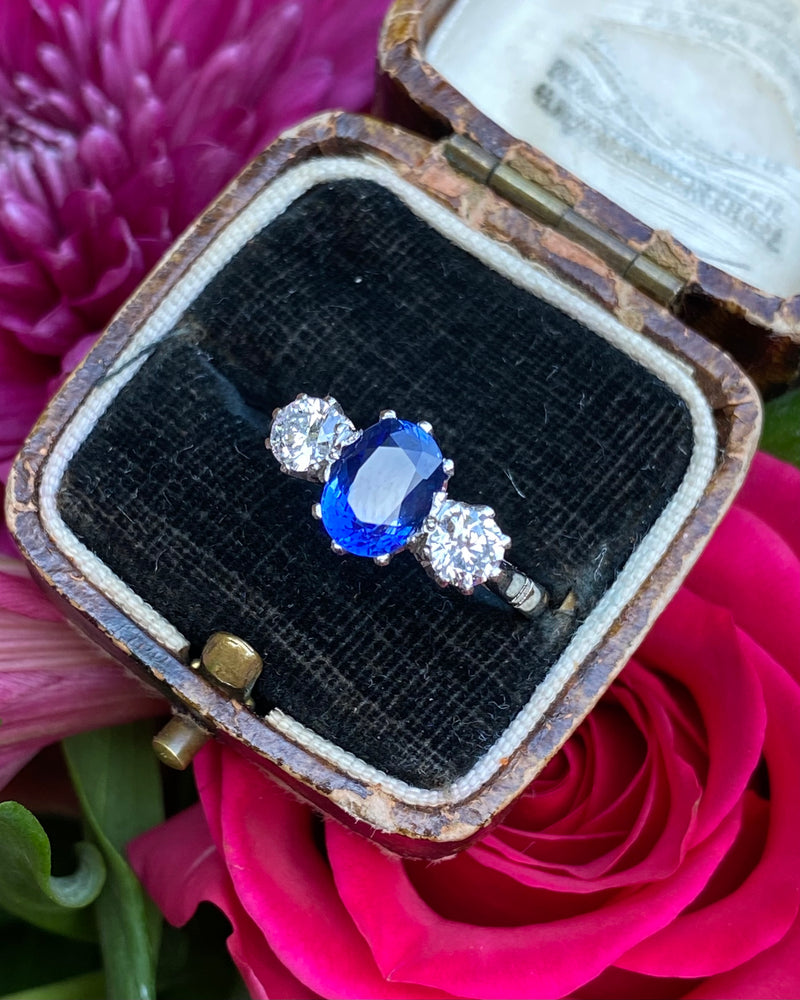 Victorian Sapphire and Old Cut Diamond Three Stone Platinum Ring 0.55ct + 1.20ct