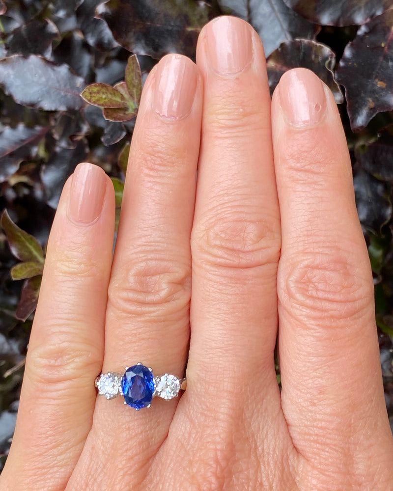 A stunning Victorian style Sapphire and Diamond Three Stone ring set Platinum, featuring a rich royal blue, Oval Cut Central Sapphire. The stunning Sapphire weighs 1.20ct and measures 8mm x 5mm and is claw set in a tradition Rex style. In addition to the central stone, there are two dazzling Round Old Cut Diamonds claw set either side of the Sapphire. The total Diamond weight is 0.55ct and the dazzling stones are a lovely H/I colour and VS/SI clarity. This ring is simply elegant and eye catching!