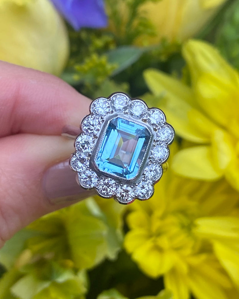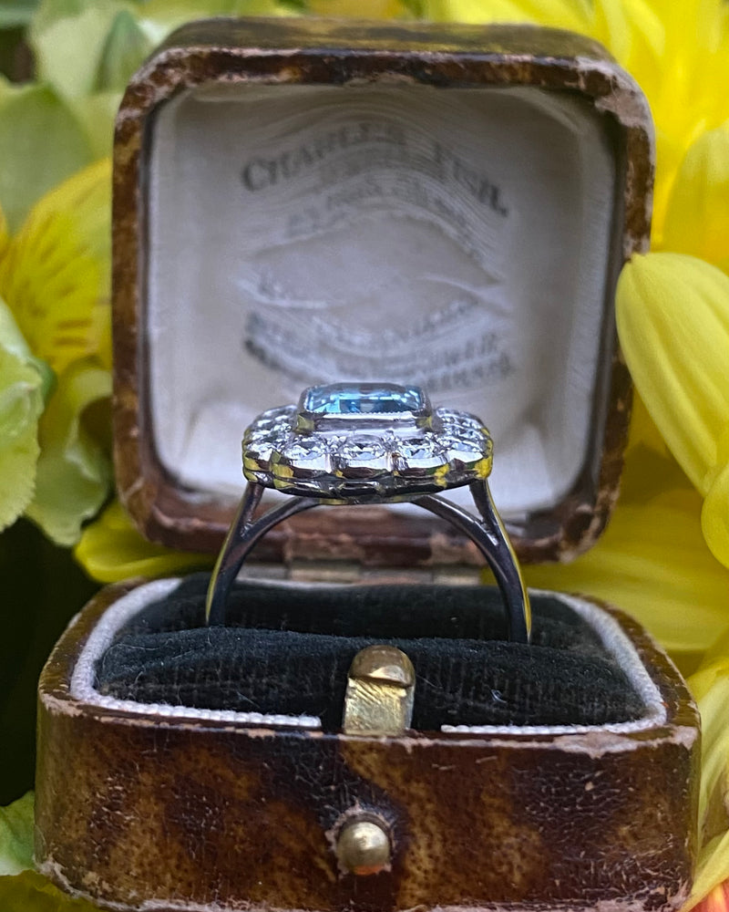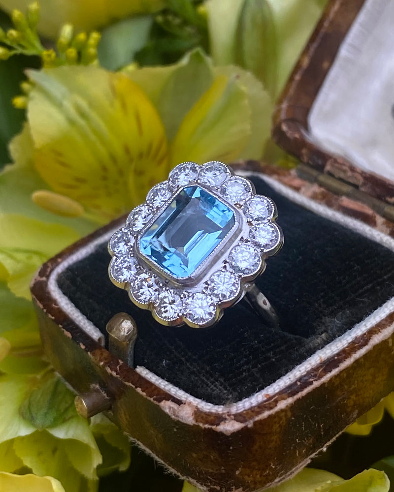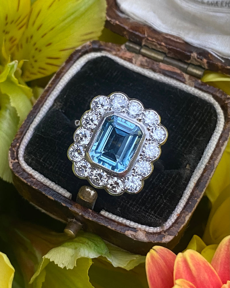 Victorian Aquamarine and Diamond Cluster Platinum Ring 1.40ct + 2.10ct
