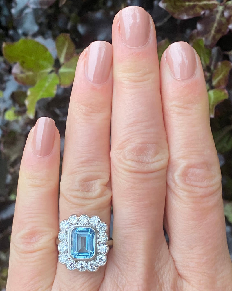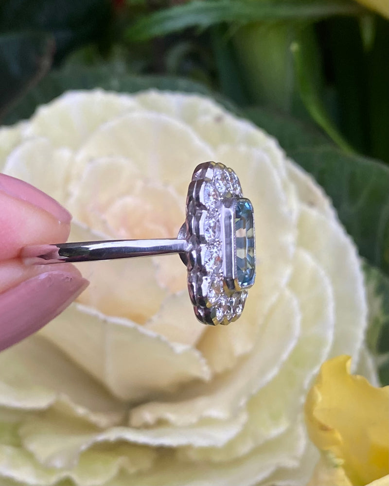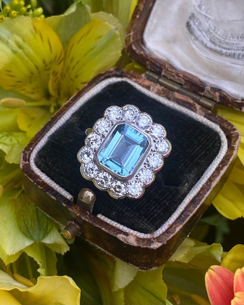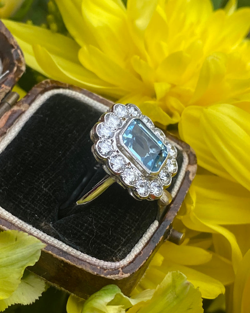 Victorian Aquamarine and Diamond Cluster Platinum Ring 1.40ct + 2.10ct