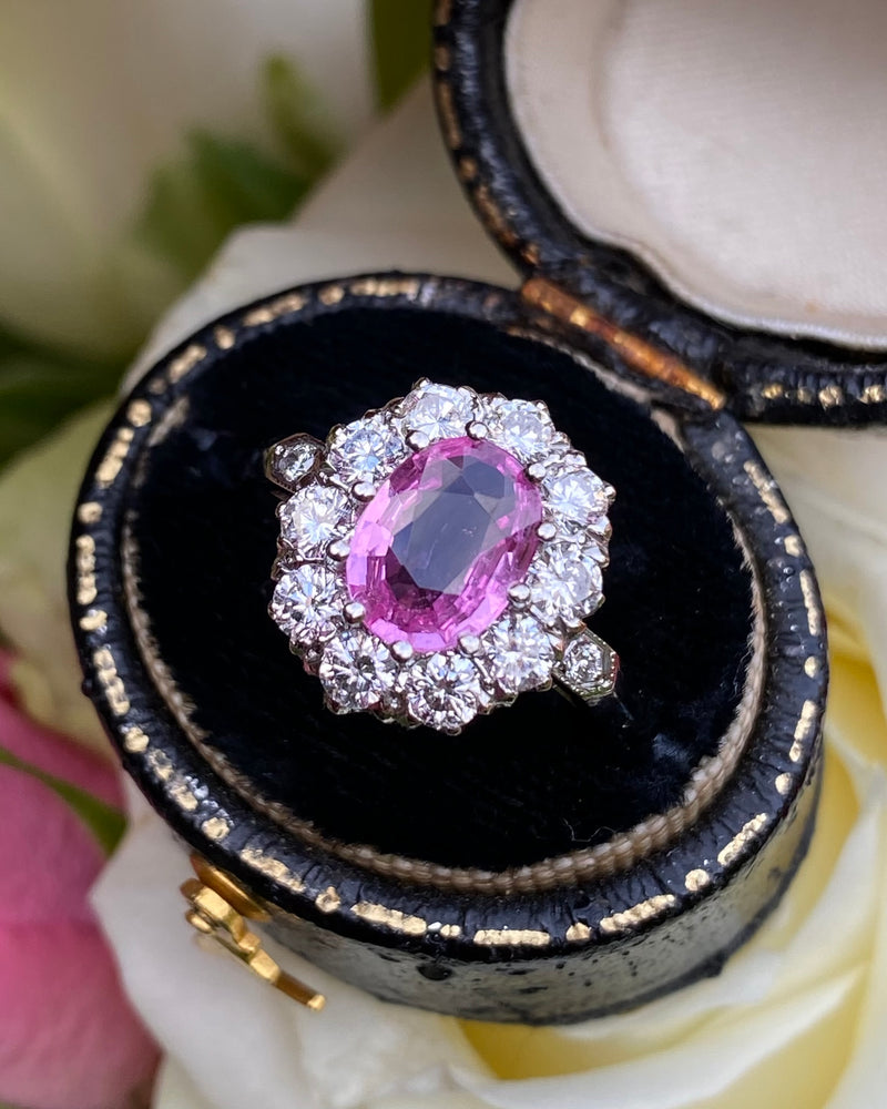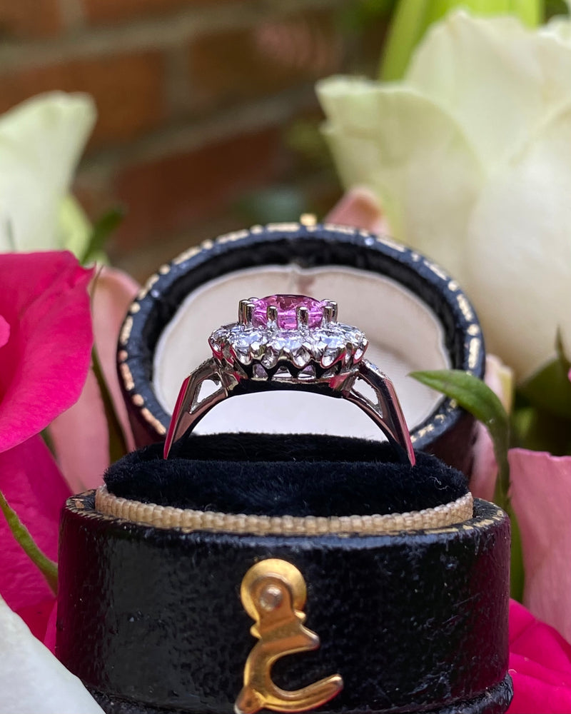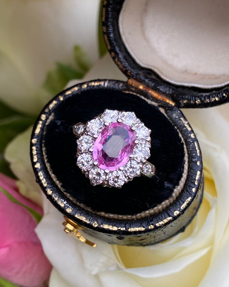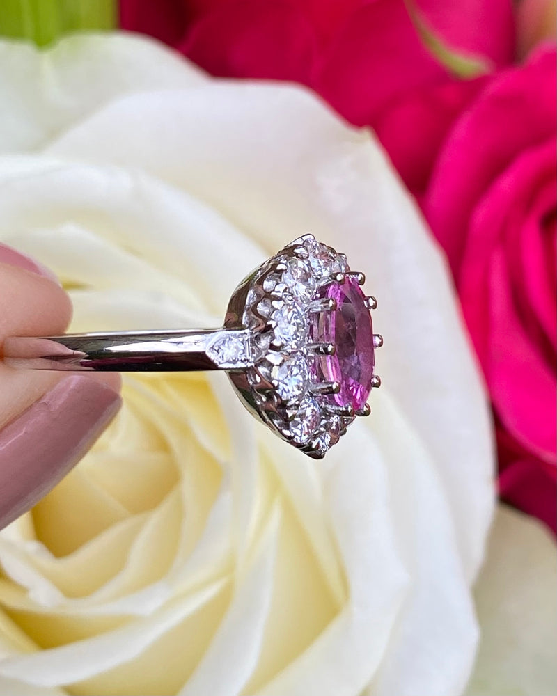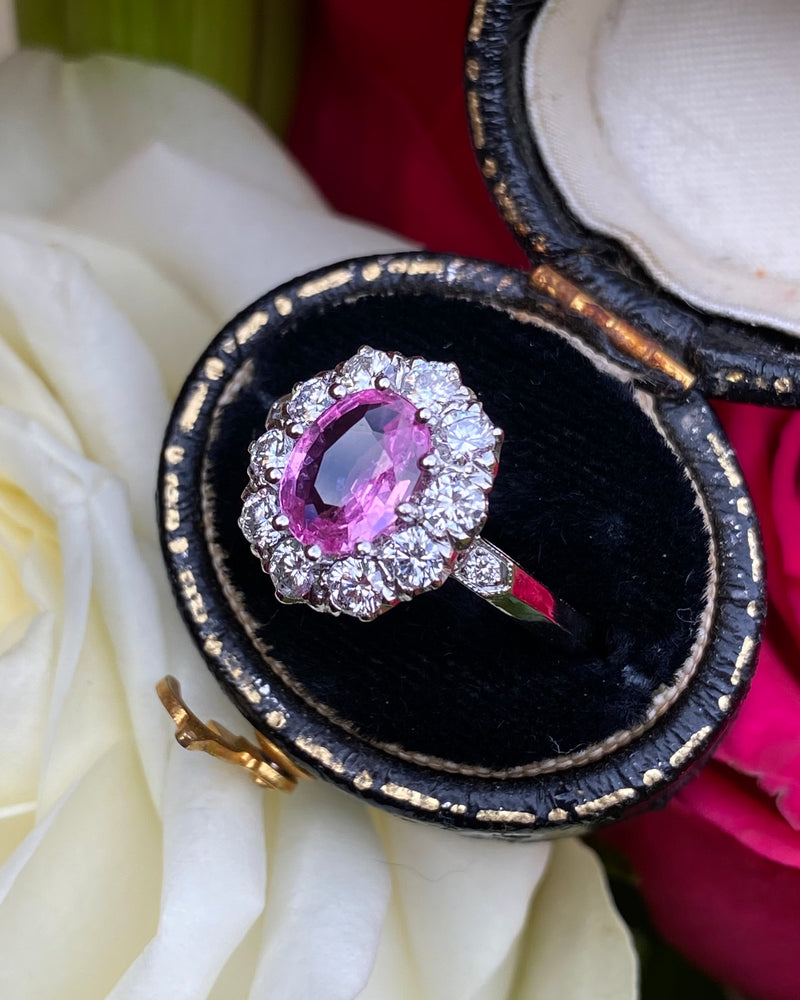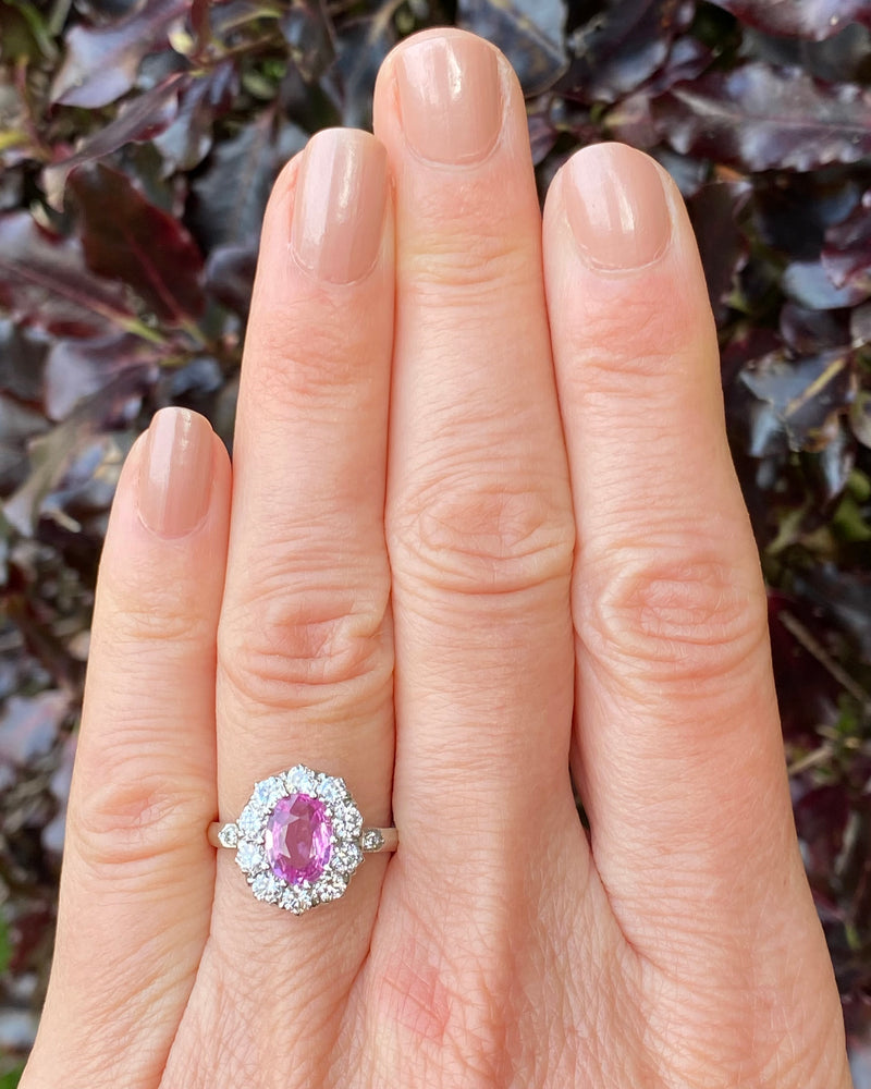 A gorgeous Victorian style Pink Sapphire and Diamond Cluster Ring. The Oval Cut Pink Sapphire in the centre of the ring is a pretty playful pink colour and set in a fine claw setting. The Pink Sapphire measures 8mm x 6mm and weighs 1.60ct. Surrounding the Pink Sapphire are ten Brilliant Cut Diamonds and an additional smaller Brilliant Cut Diamond Pave set in either shoulder of the ring. The ring contains 0.95ct of Brilliant Diamonds, H/I colour, VS/SI quality and are clean, bright and catch the light beautifully. The ring is made entirely in heavy, high quality Platinum and sits nice and low on the finger, and is easy to wear - such a stunning ring!