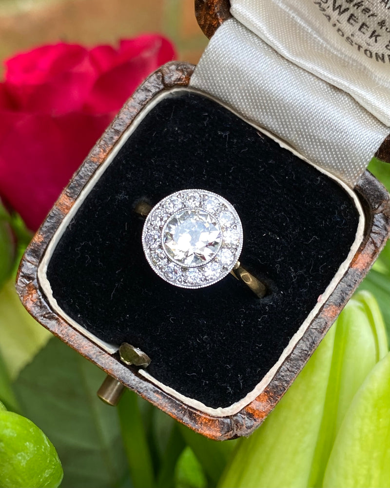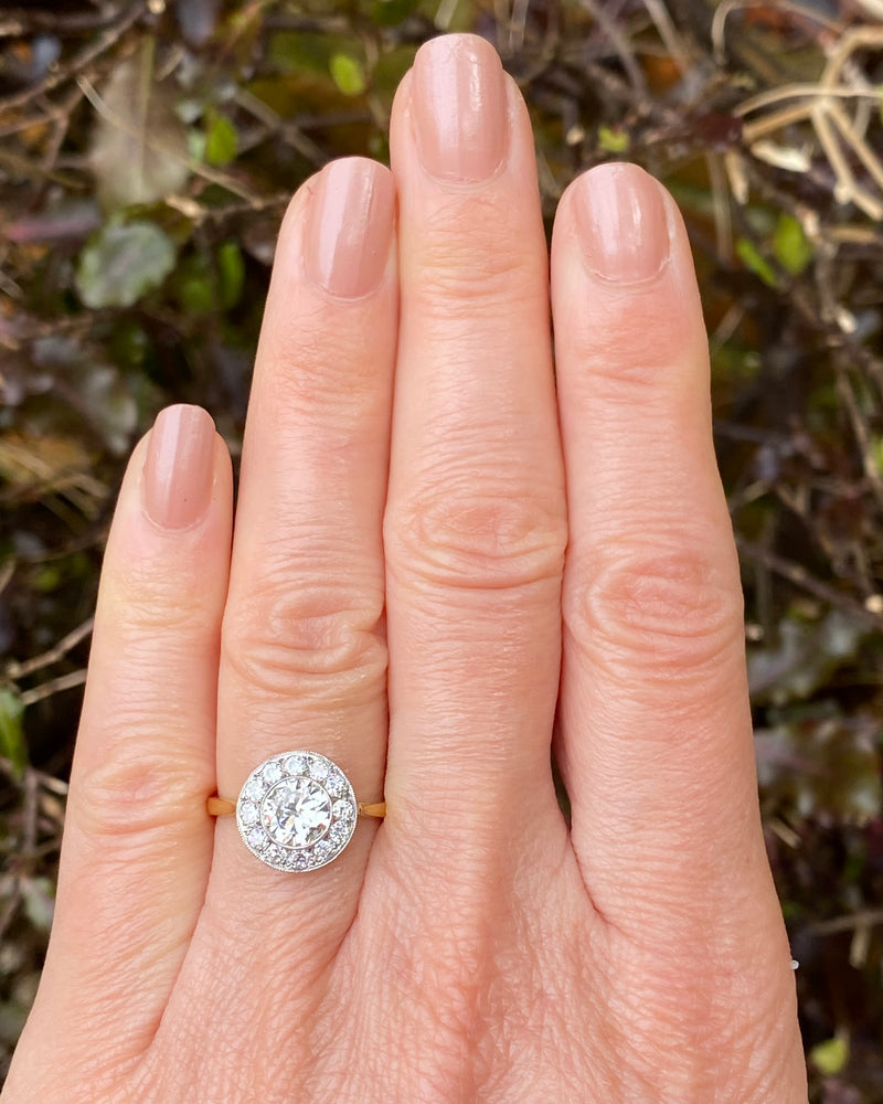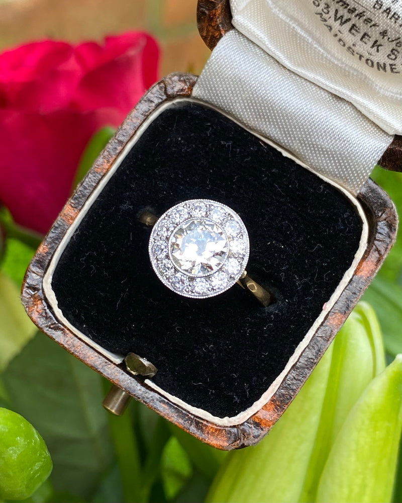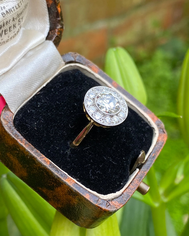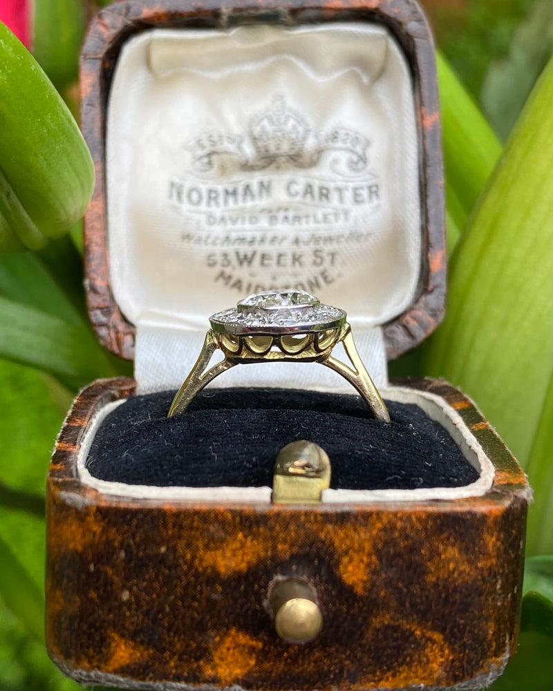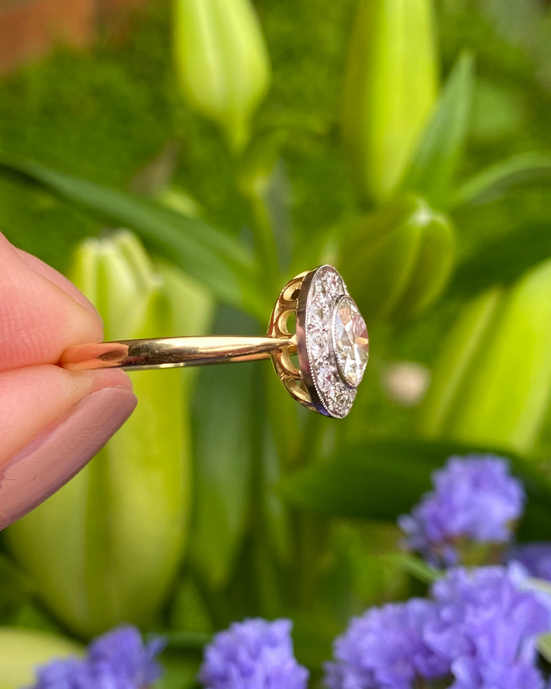 This is a beautiful Art Deco style ring containing a central Old Cut Diamond weighing approximately 0.85ct. The central Diamond is surrounded by further Brilliant Cut Diamonds weighing an additional 0.40ct. The central diamond is lovely and sparkly and is approximately J colour, VS2 clarity and is rub over set and finished with a fine millgrain edging. The surrounding Diamonds are pave set, weigh 0.40ct and are approximately I/J colour and VS/SI clarity coming to a total Diamond weight of 1.25ct in the ring. The under bezel has an attractive scalloped detail and the ring sits nice and low on the finger and is easy and comfortable to wear. The ring is set in 18ct Yellow Gold, with the head of the ring being set in heavy, high quality Platinum