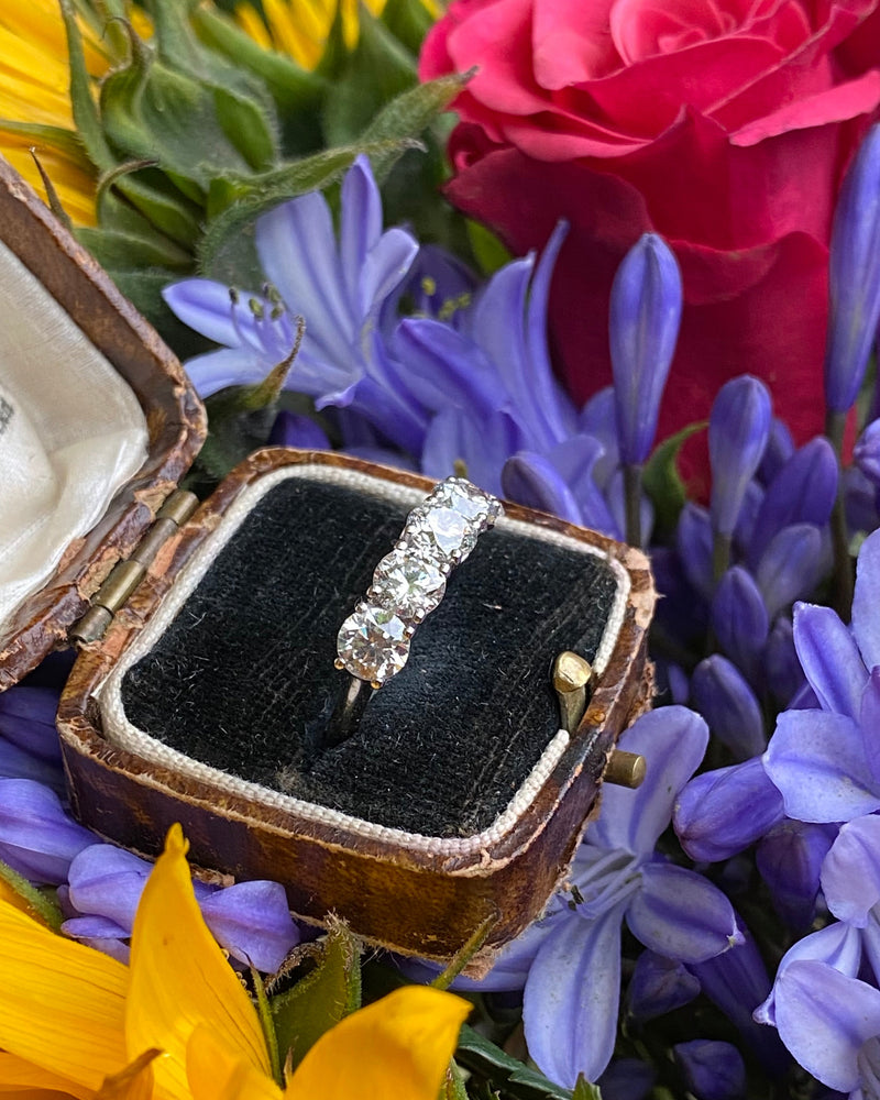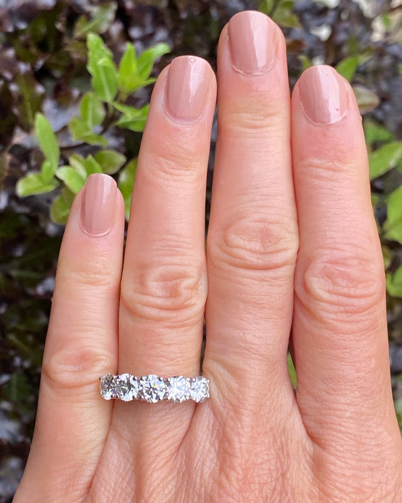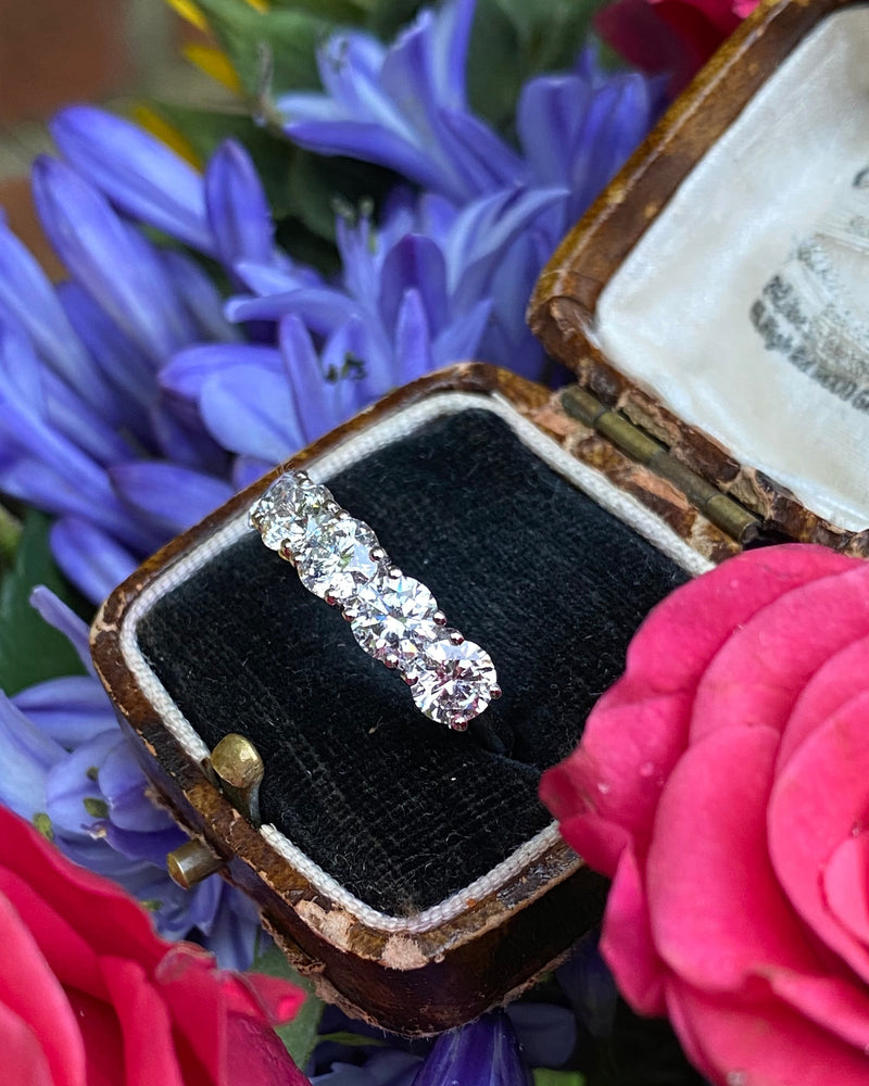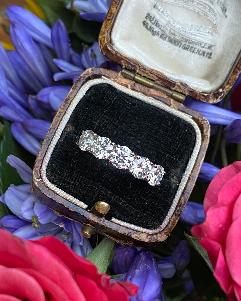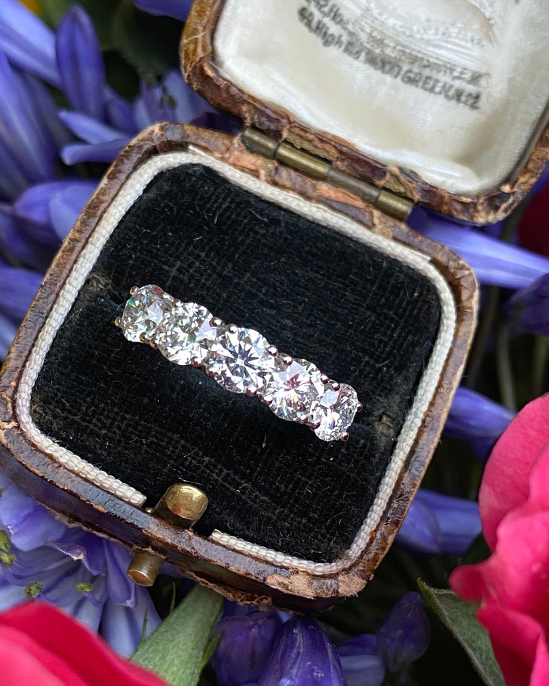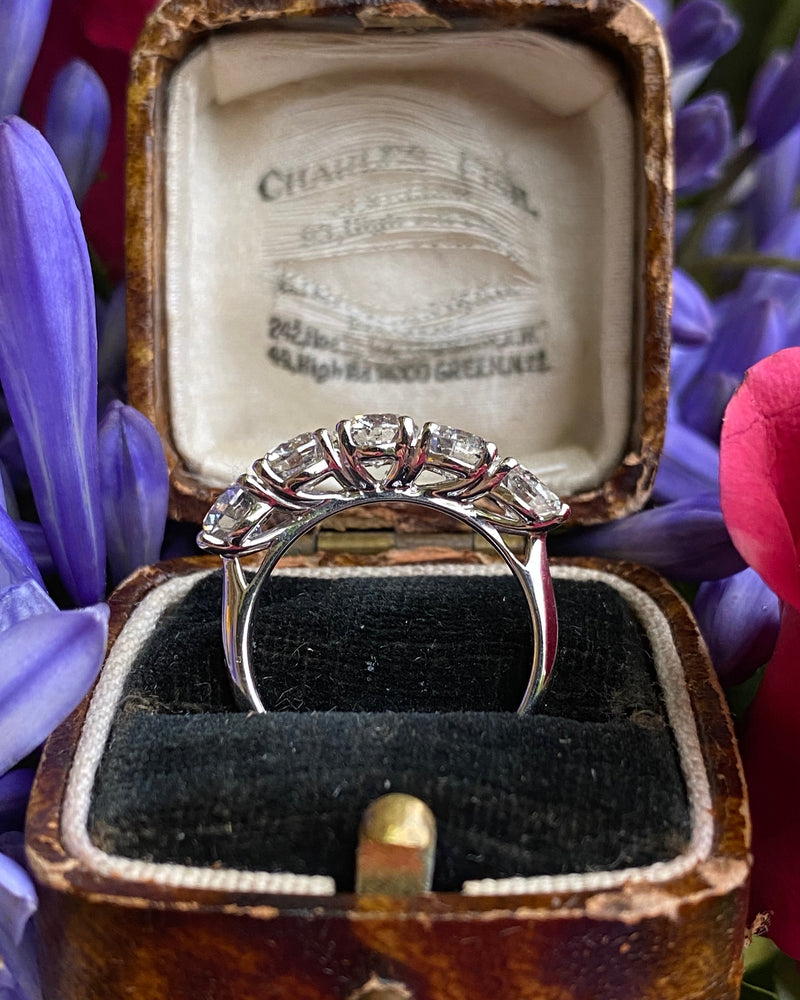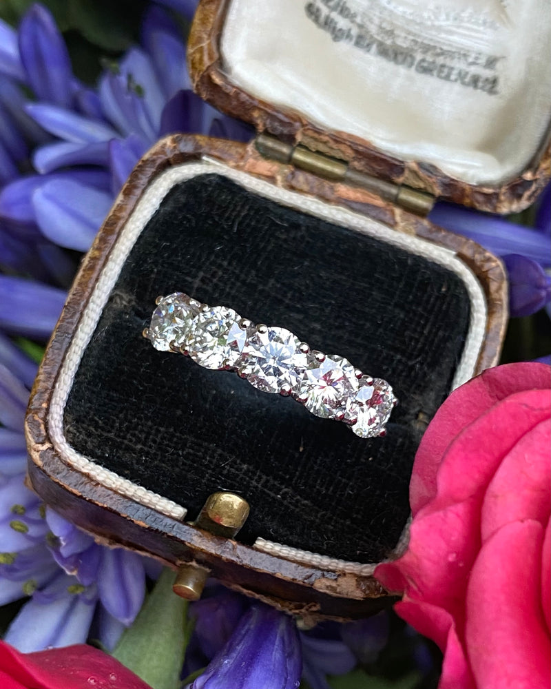 This is a stunning large Five Stone Ring with plenty of dazzling drama! Containing five equal sized Brilliant Cut Diamonds the ring fills your finger with sparkle. The Brilliant Cut Diamonds are fine claw set with scalloped open gallery work, letting the light flow through. The Diamonds are of a good colour and clarity, I colour, VS/SI clarity and weigh a substantial 2.70ct in total. This ring is made entirely in 18ct White Gold. Glamorous yet elegant, this ring would make a beautiful addition to any jewellery lovers collection.