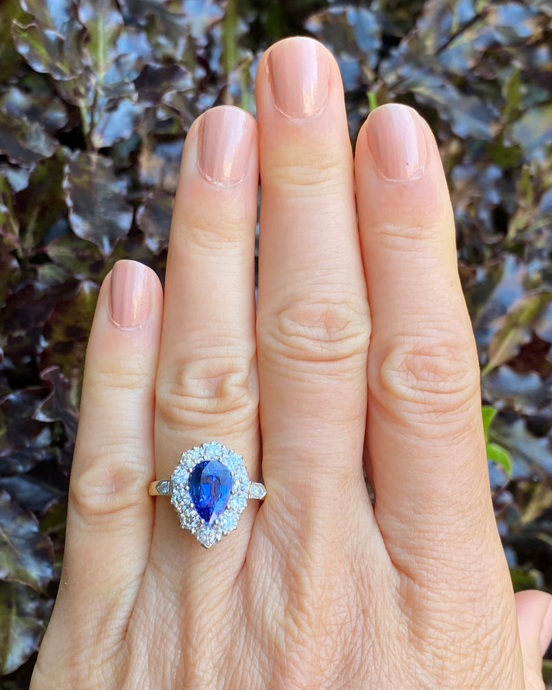 A stunning Victorian style Sapphire and Diamond Cluster Ring! The Pear Cut Sapphire is an unusual and attractive shape, weighing 2.60ct and measures 10mm x 8mm. It is a lovely sought-after rich luxurious blue colour and is surrounded by ten substantial sized Round Brilliant Cut Diamonds, with an additional Old Cut Diamond pave set either side. Both the Sapphire and the surrounding Diamonds are set in a traditional claw setting, and the total Diamond weight in the ring is 1.25ct. The Diamonds are bright stones with no marks visible to the naked eye, approximately H/I colour VS/SI clarity and sparkle beautifully.
