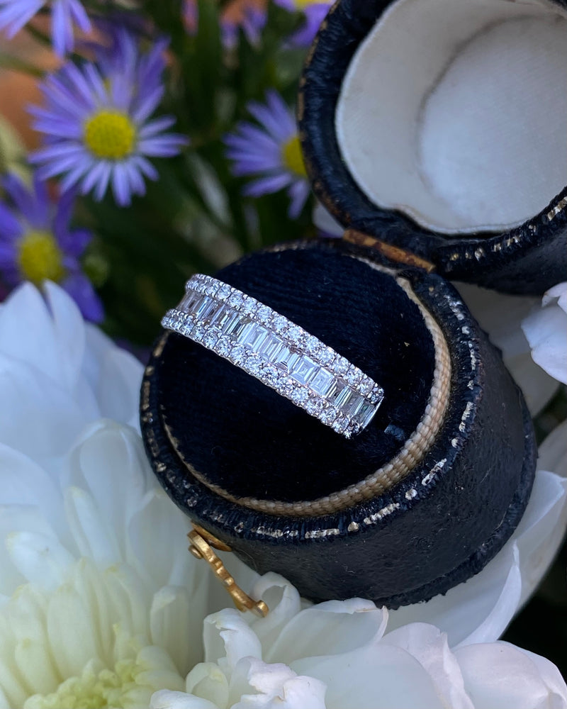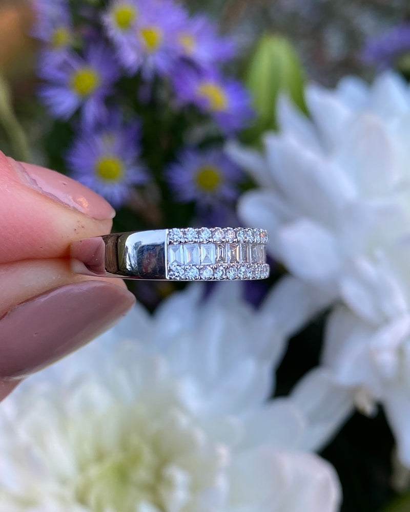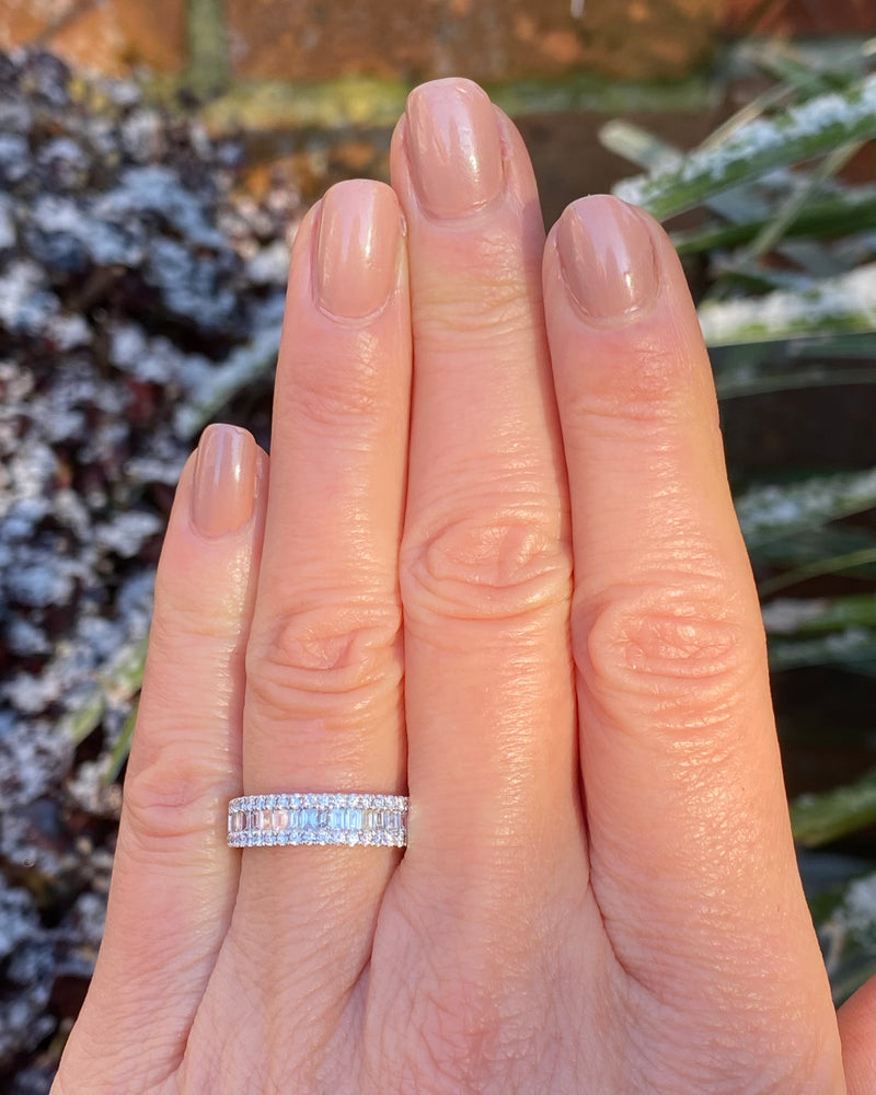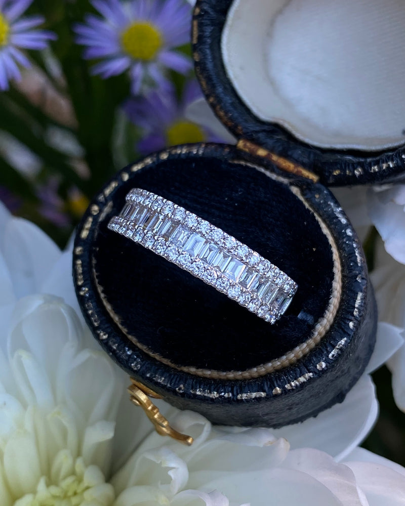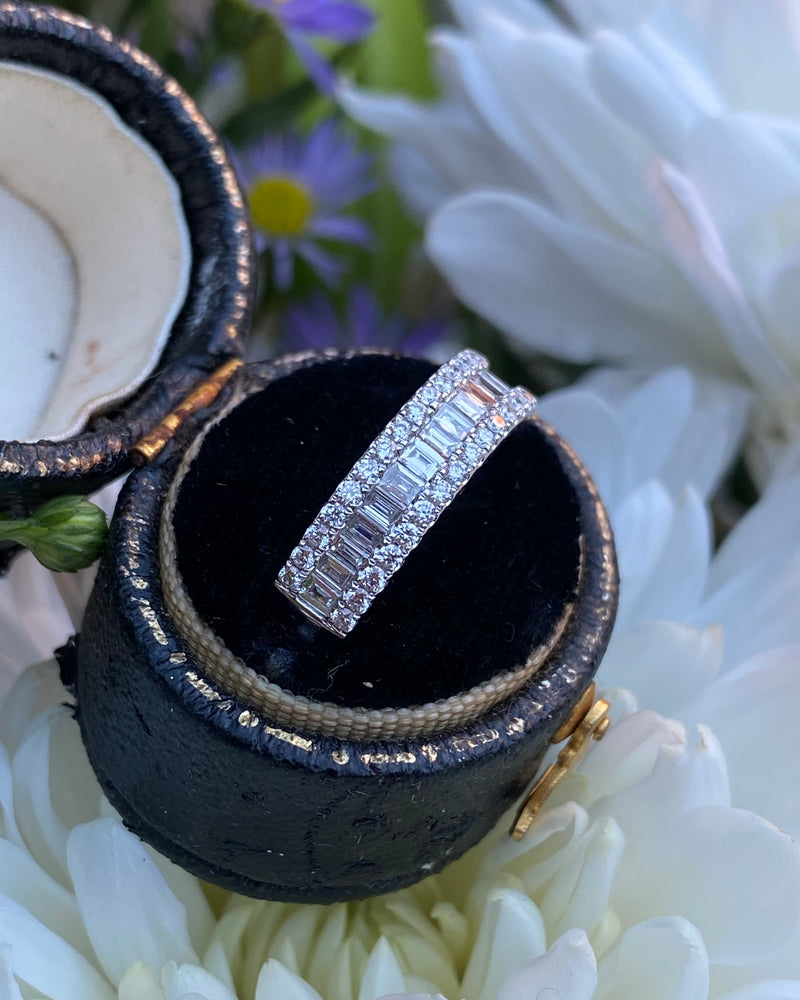 A gorgeous contemporary style Half Eternity Dress ring set with a seamless row of nineteen rubover set Baguette Cut Diamonds across the centre with a further two rows of claw set Brilliant Cut Diamonds set above and below - adding to the overall elegance of this design. The Diamonds are great quality, weighing 0.87ct in total, are of a fine ‘G/H’ colour and ‘VS/SI’ clarity and set in a wide contemporary soft Court Shape, slightly tapered at the back, giving a modern and stylish look. The two setting styles along with the two different cuts of Diamonds compliment each other perfectly and the under bezel of the ring has an attractive cut out design which lets in the maximum amount of light which equals, maximum glitter!