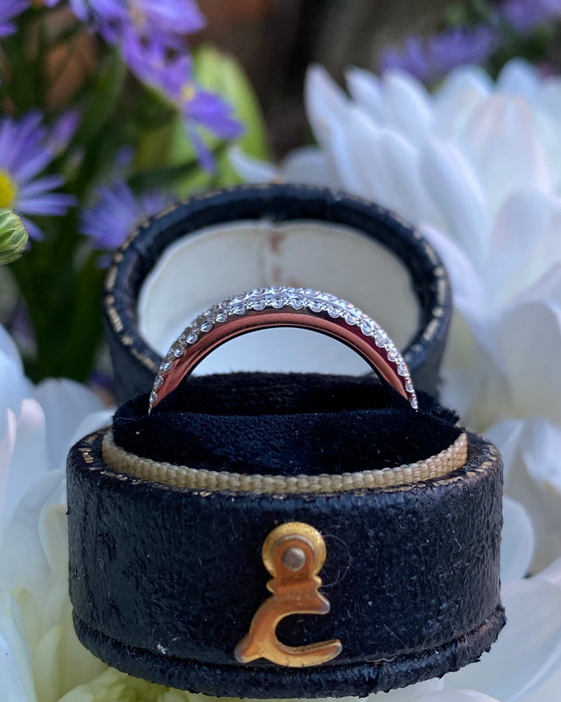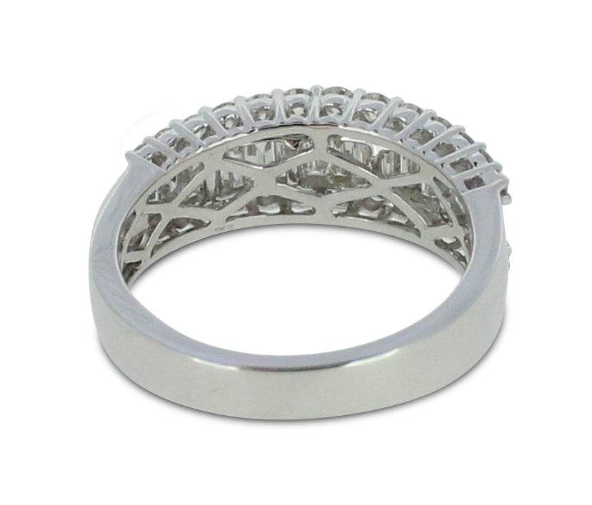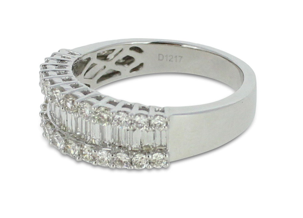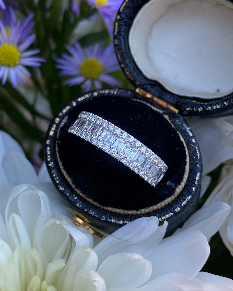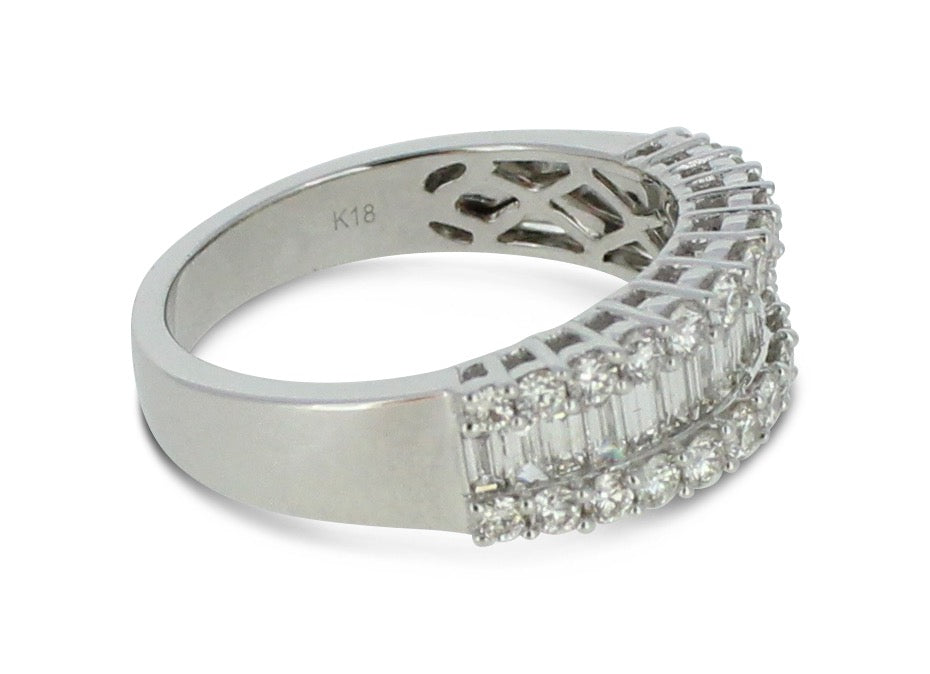 A gorgeous contemporary style Half Eternity Dress ring set with a seamless row of nineteen rubover set Baguette Cut Diamonds across the centre with a further two rows of claw set Brilliant Cut Diamonds set above and below - adding to the overall elegance of this design. The Diamonds are great quality, weighing 0.87ct in total, are of a fine ‘G/H’ colour and ‘VS/SI’ clarity and set in a wide contemporary soft Court Shape, slightly tapered at the back, giving a modern and stylish look. The two setting styles along with the two different cuts of Diamonds compliment each other perfectly and the under bezel of the ring has an attractive cut out design which lets in the maximum amount of light which equals, maximum glitter!