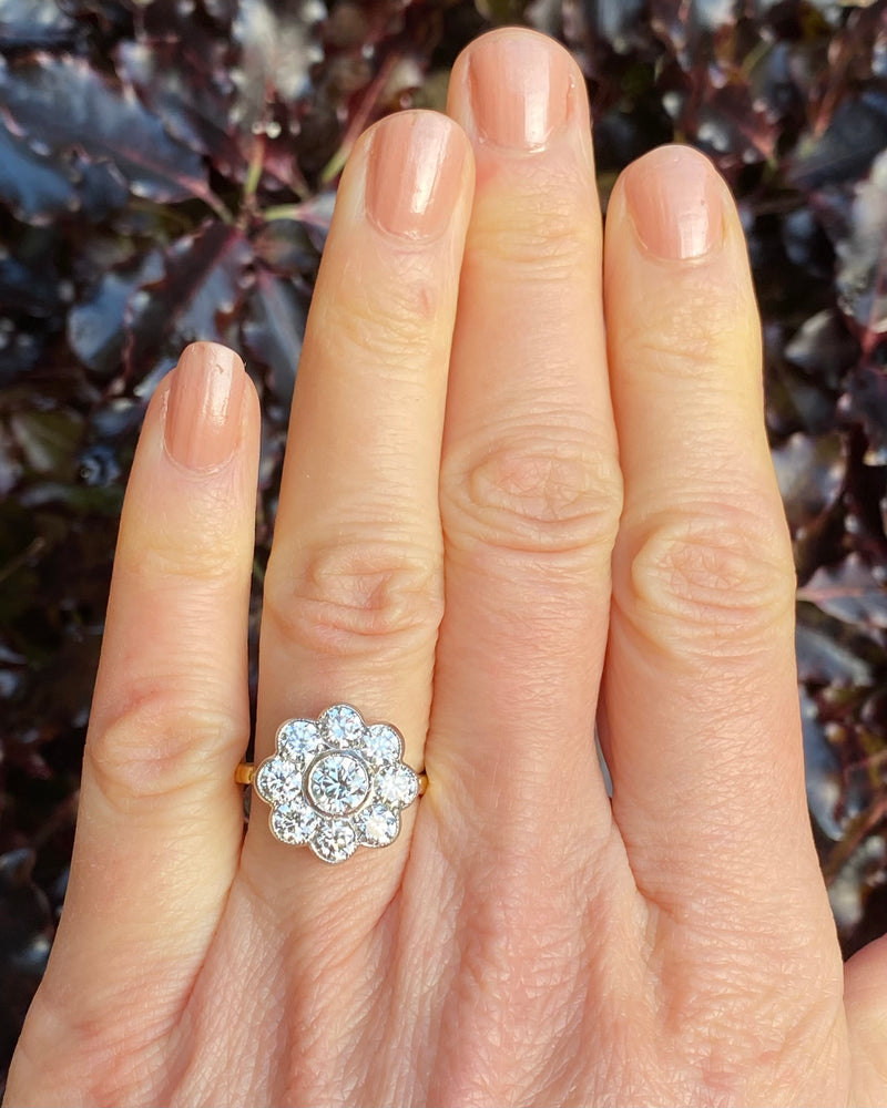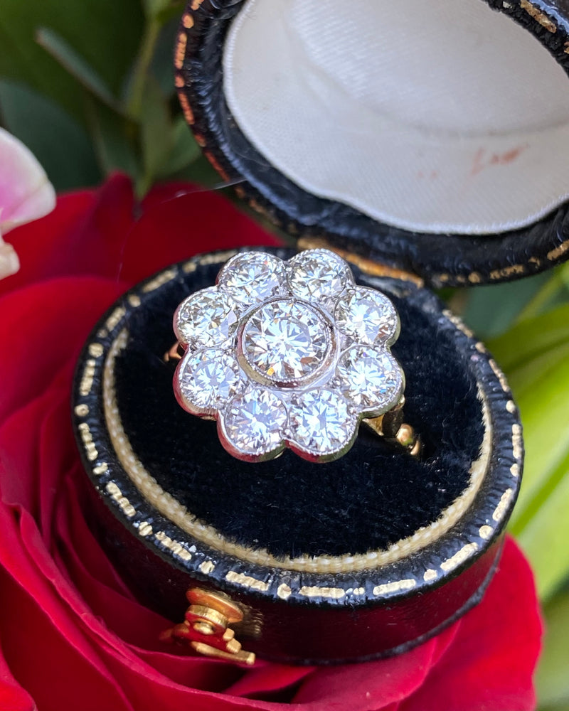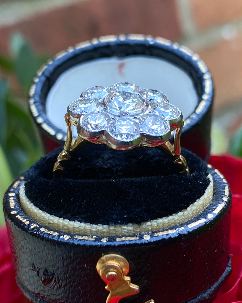 This is a gorgeous ring! A classically designed Diamond Daisy Cluster Ring with nine Brilliant Cut Diamonds set extremely close together to give a fabulous overall appearance when worn. All the Diamonds are very bright and clean, I colour VS/SI clarity and are Pave set and finished with a fine milgrain edging. The total Diamond weight is an impressive 2.20ct and the ring has a very attractive under gallery work which allows lots of light through and the Diamonds to sparkle immensely. This ring is set in 18ct Yellow Gold, with the head of the ring being set in heavy, high quality Platinum.