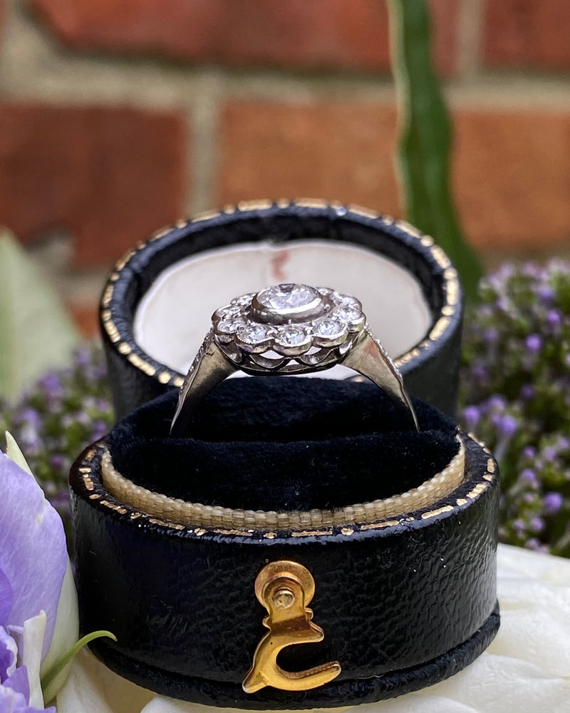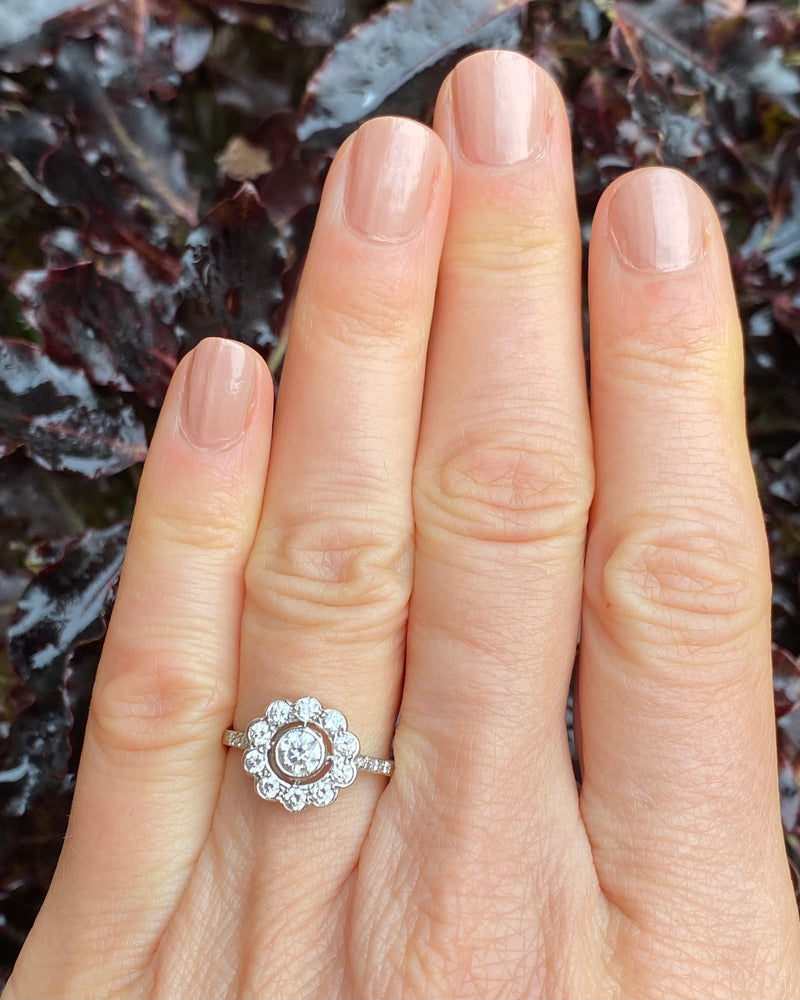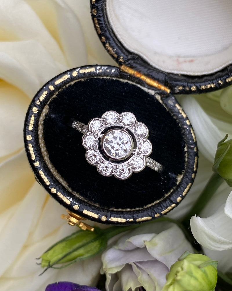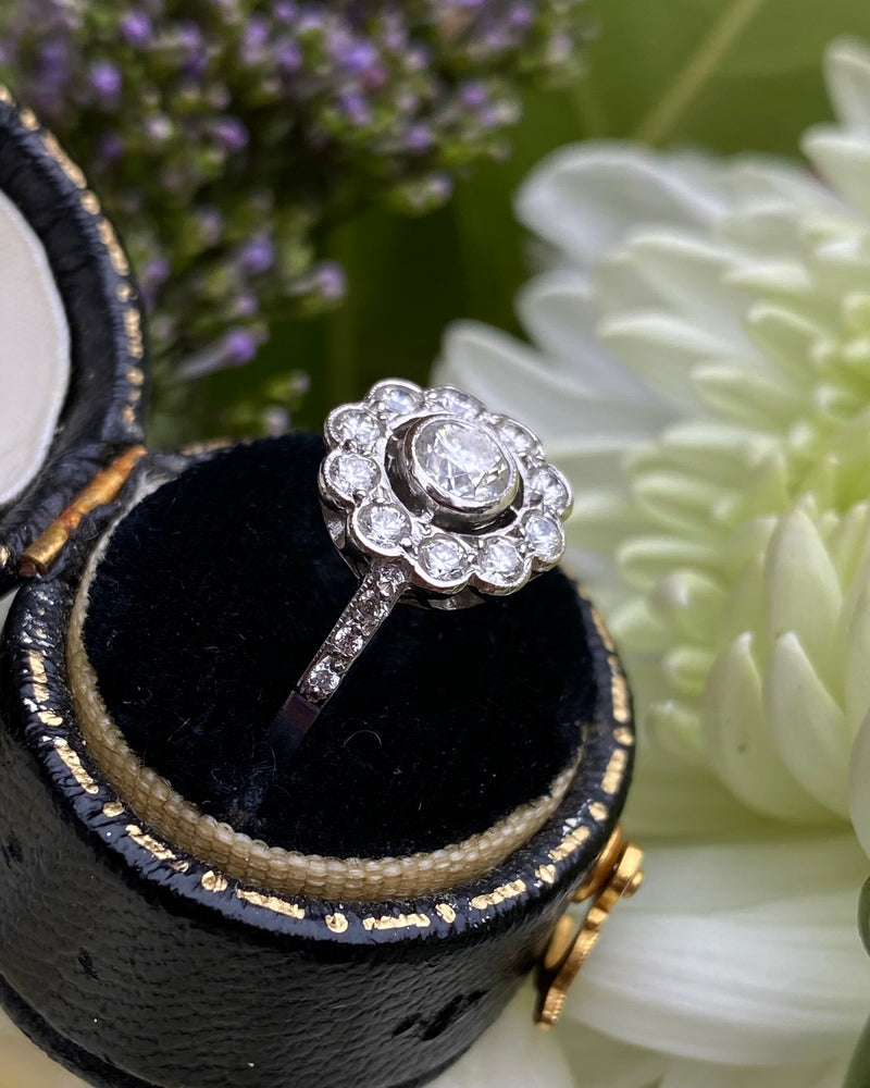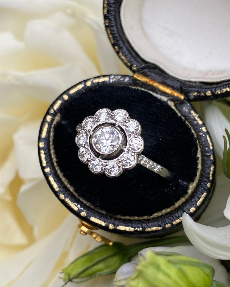 What a gorgeous design! This is a traditional style Diamond Daisy Cluster ring containing a larger central Brilliant Cut Diamond. In addition to this, there are ten smaller Brilliant Cut Diamonds surrounding the dazzling central stone that are set rubover style with fine milgrain edging, with a further three Diamonds pave set down the shoulders of the ring! All of the Diamonds are a bright H/I colour and VS/SI clarity and weigh a total of 0.80ct in Diamond weight. This is an exceptionally pretty ring!