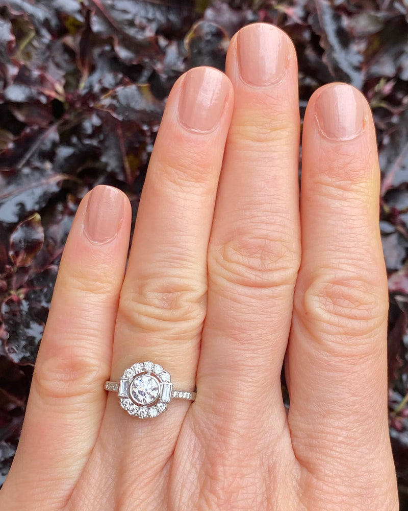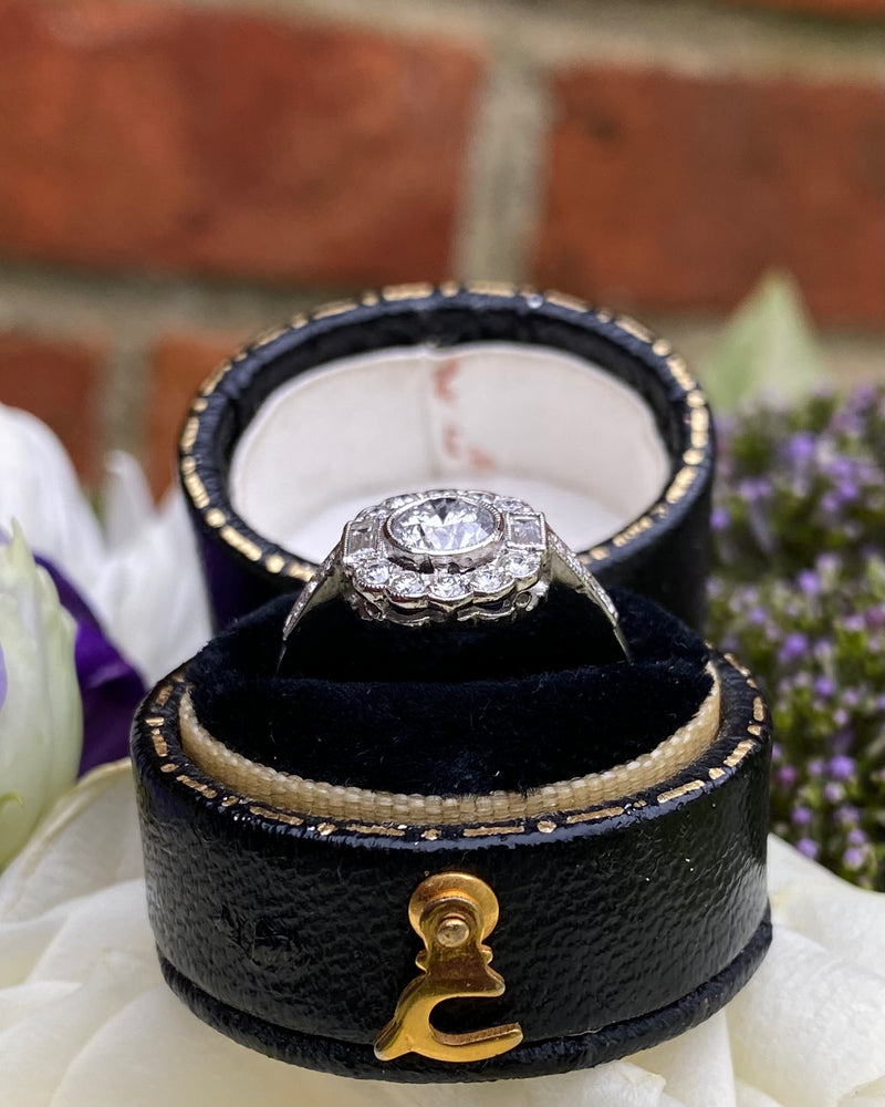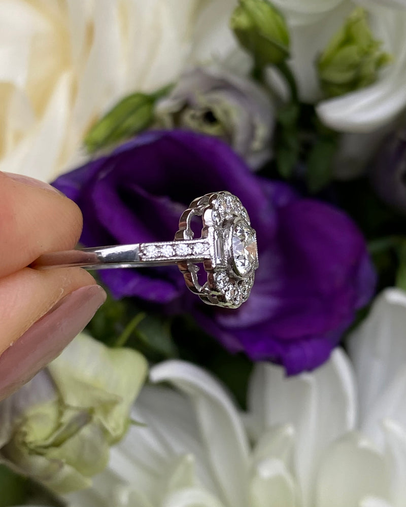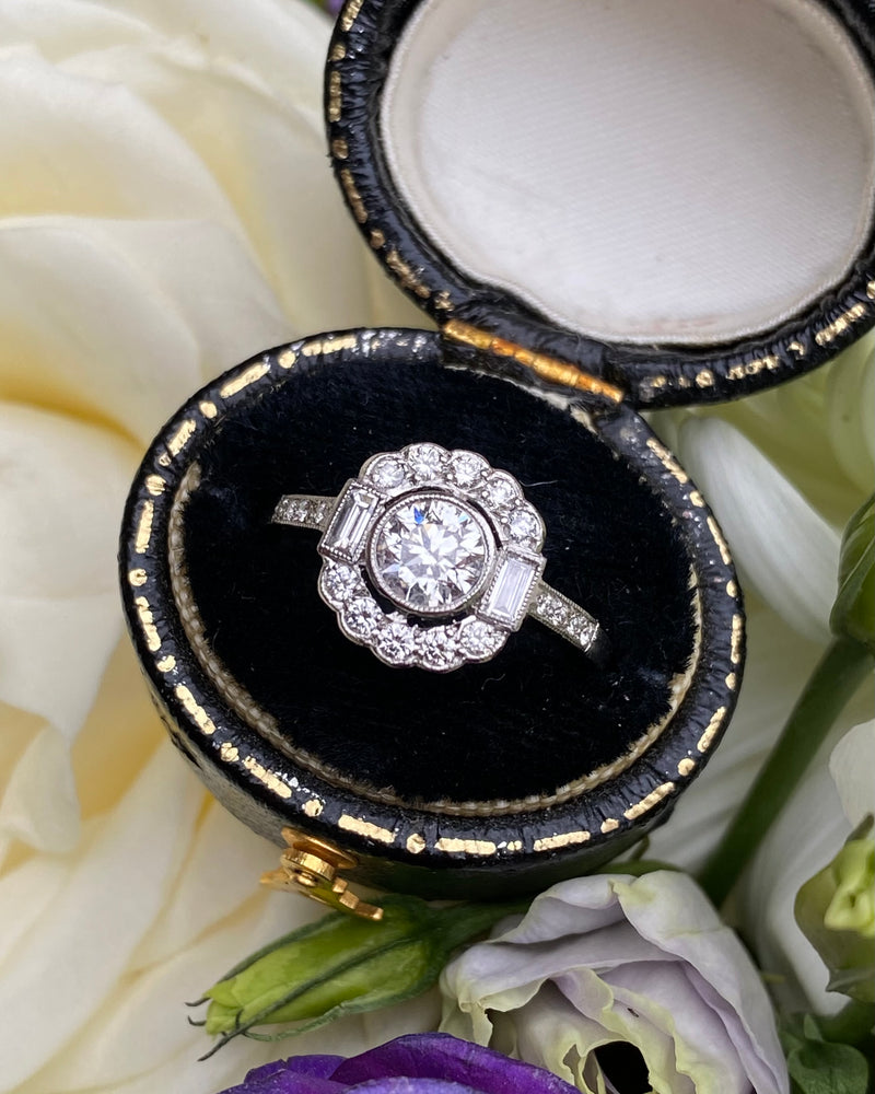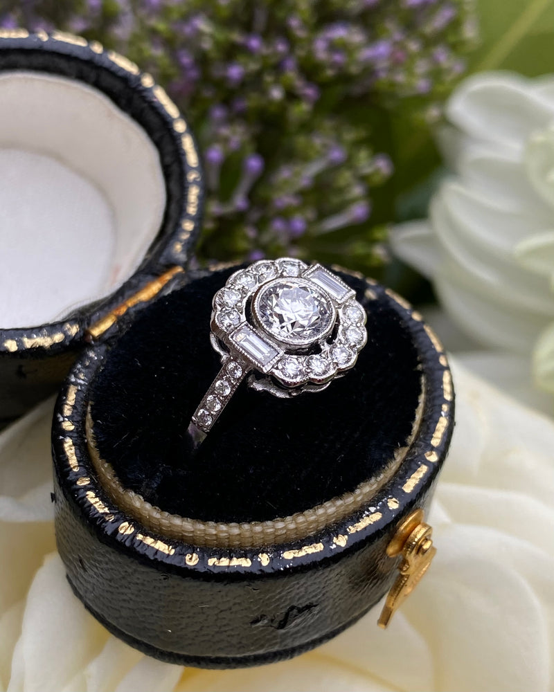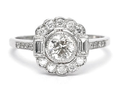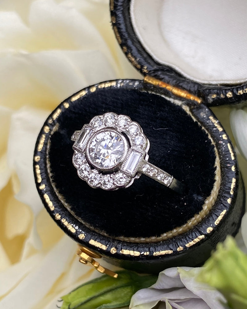 A pretty Vintage style Diamond Daisy Cluster Ring with beautiful combination of Brilliant and Baguette Cut Diamonds with a total Diamond weight of 0.85ct. The central Round Brilliant Cut Diamond is a lovely stone, of fine quality and set in a rub over setting. Either side of the central stone are Baguette Cut Diamonds in a rub over setting and a surround of further Brilliant Cut Diamonds all of a fine H/I colour and VS/SI clarity. There are an additional four Brilliant Cut Diamonds pave set in the shoulders, bringing the total Diamond weight in the ring to 0.85ct. This ring sits low on the finger and is lovely to wear and is made entirely in Platinum and is fully hallmarked. It would be a stunning engagement ring, right-hand ring or, any excuse ring!