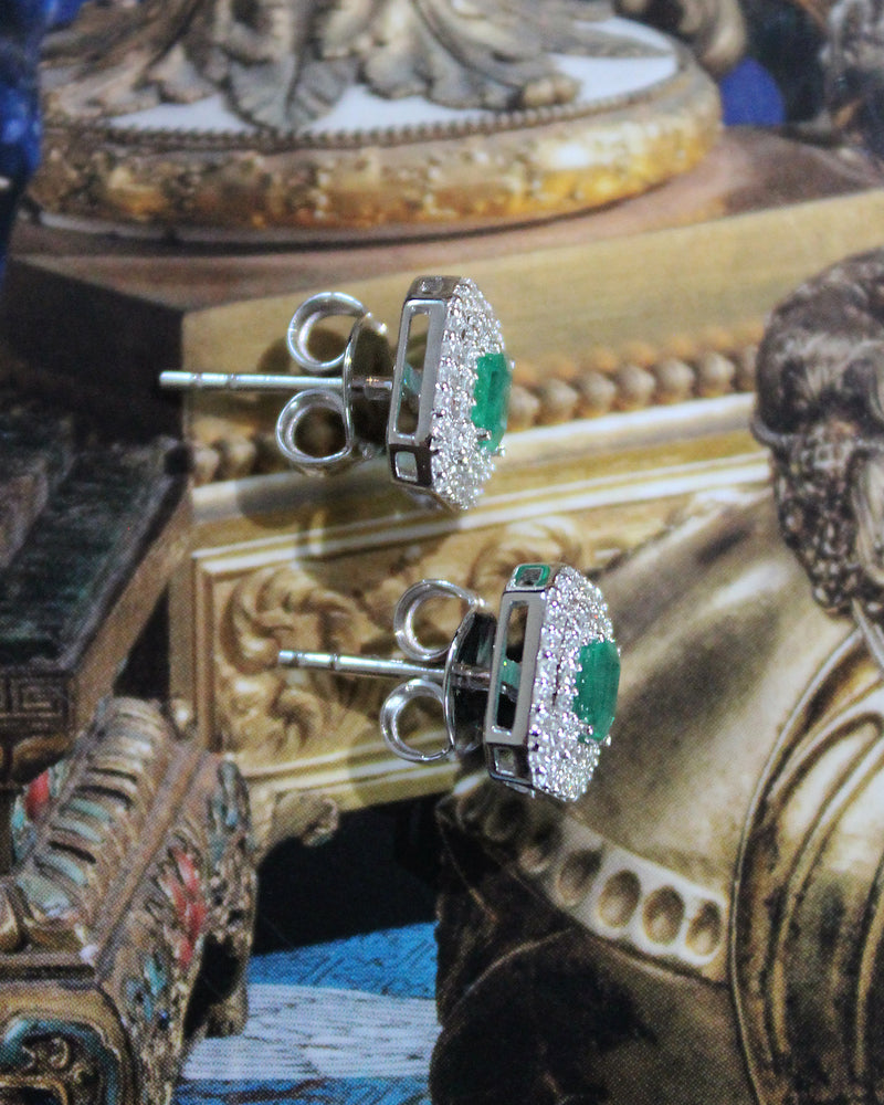 Art Deco Emerald and Diamond Halo Cluster Earrings 18ct White Gold 0.30ct + 0.41ct