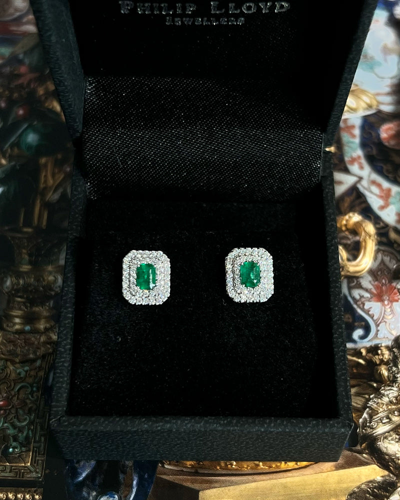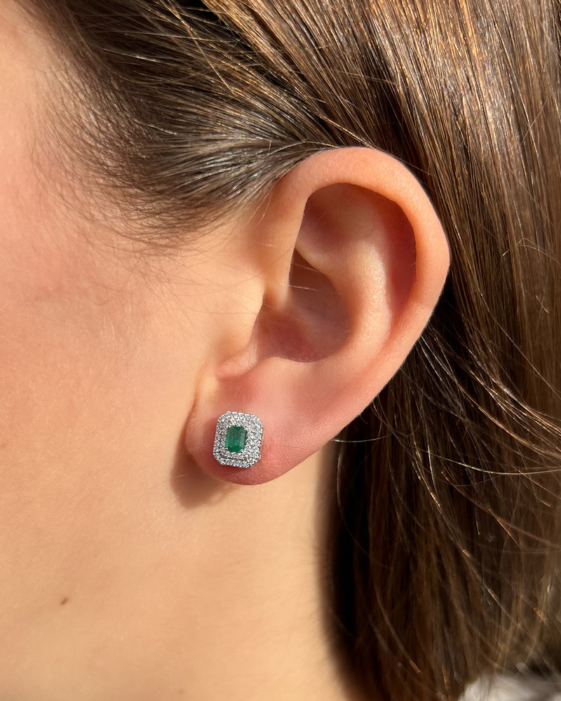 An absolutely stunning pair of Art Deco Style Emerald and Diamond Cluster Earrings, set in 18ct White Gold. The central Emerald Cut Emerald measuring 4mm x 3mm and weighing 0.41ct, with a vibrant, sought after grassy green colour. Surrounding the Emerald are two rows of Pavé set Round Brilliant Cut Diamonds, creating a unique and eye-catching halo effect that looks fabulous when worn. The total Diamond weight is 0.30ct, and are bright and lively stones of a fine 'G' colour and 'VS' clarity. The earrings have butterfly back fastenings back fastenings and are perfect for adding a touch of elegance to any outfit!