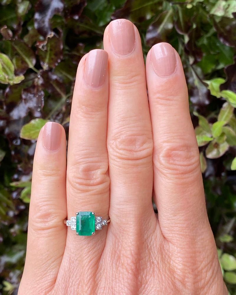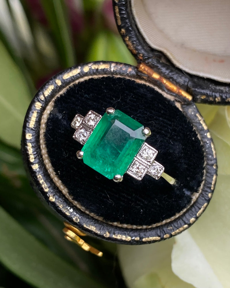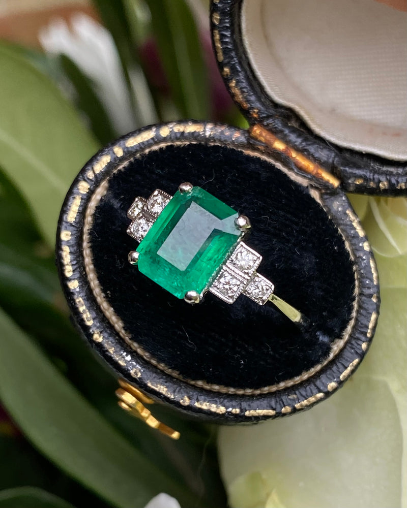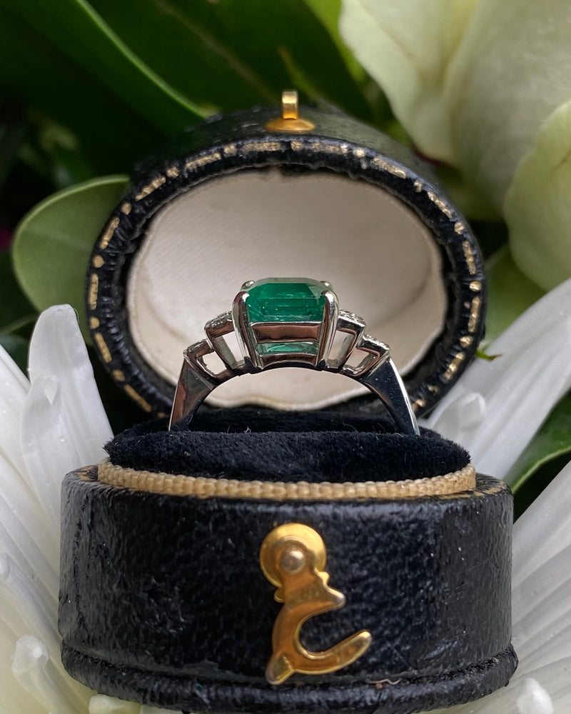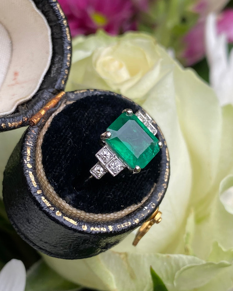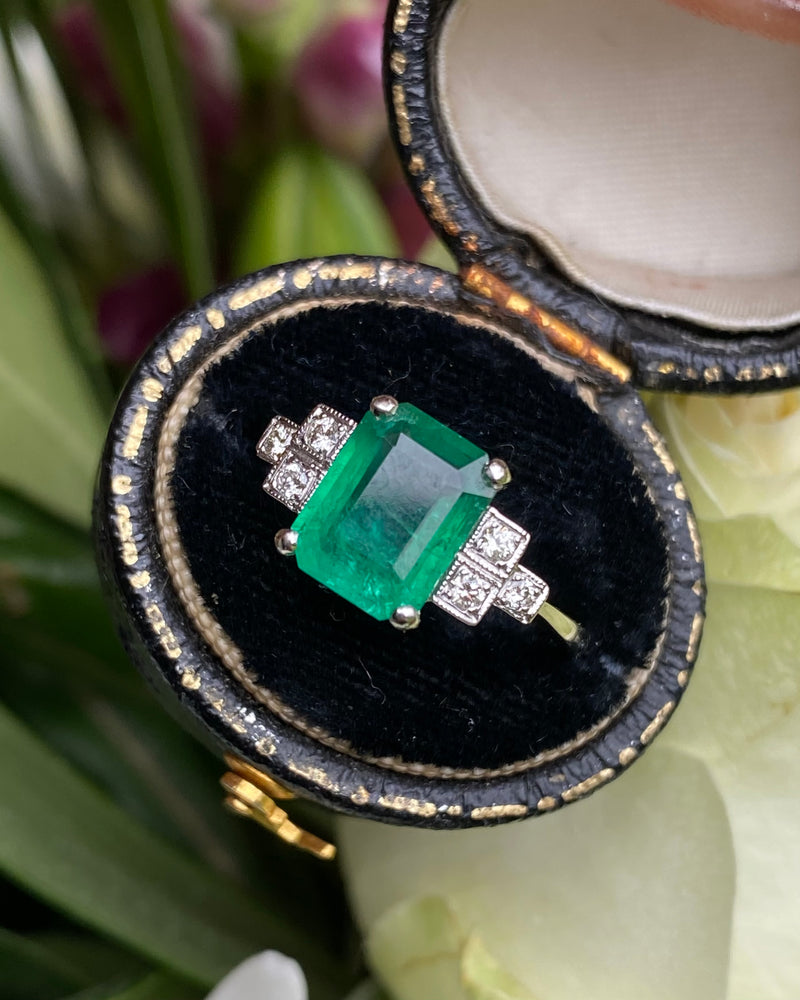 Art Deco Emerald and Diamond Platinum Ring 0.18ct + 1.85ct