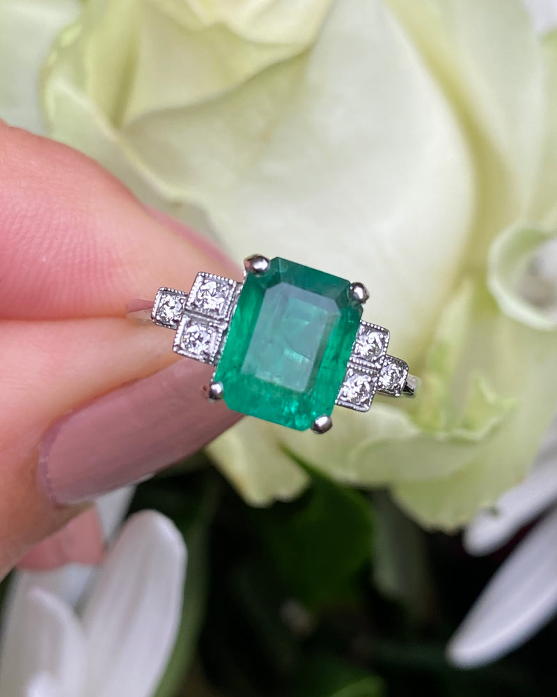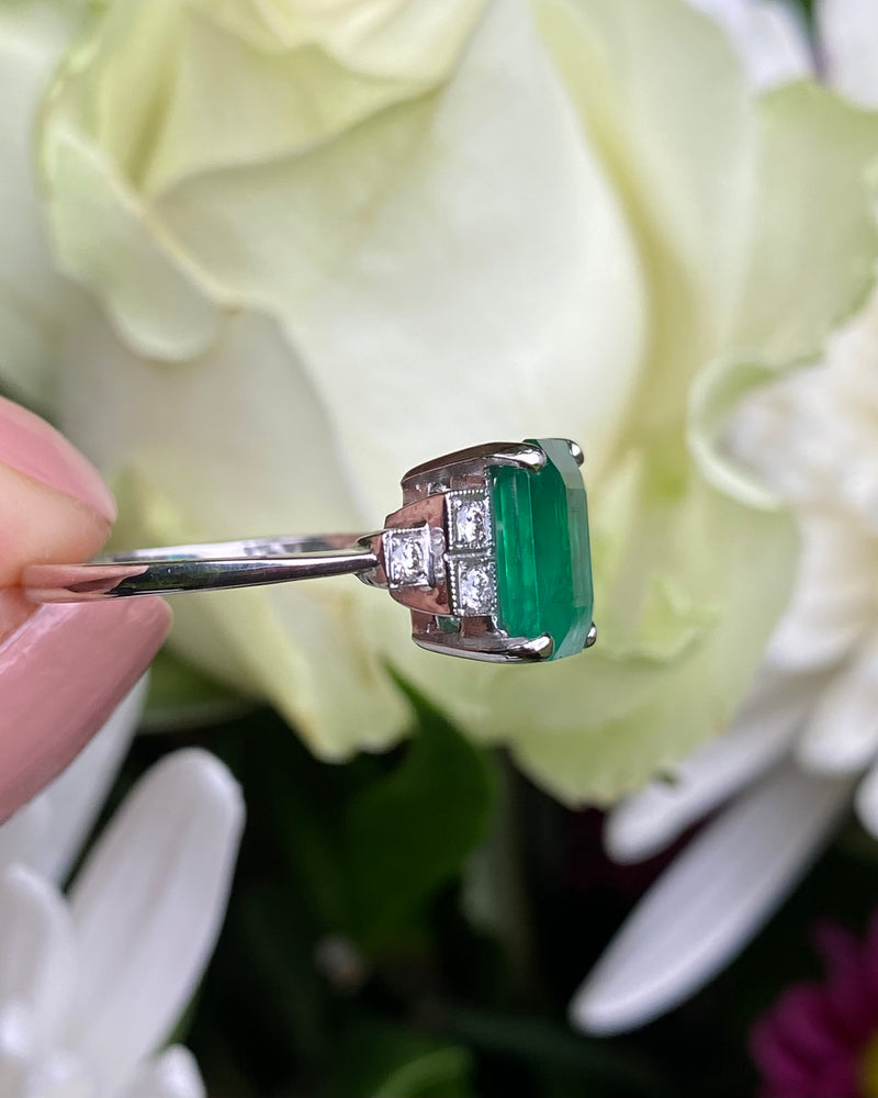 A lovely Art Deco style Emerald and Diamond Ring, set in Platinum. The Emerald is a lovely vibrant green colour, measures 8.5mm x 6.5mm, and is Emerald Cut with a good overall colour and clarity. The Emerald weighs 1.85ct and is set with four claws with three graduating box pave set Brilliant Cut Diamonds set either side, finished with a fine milgrain edging. The total Diamond weight is approximately 0.18ct and are lovely quality H/I colour and VS/SI clarity stones. This ring is sophisticated and eye catching and sits nice and low on the finger.