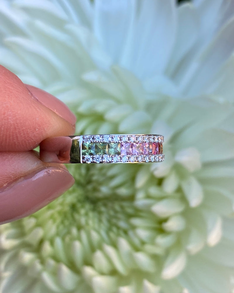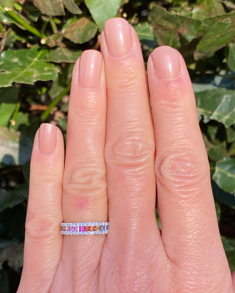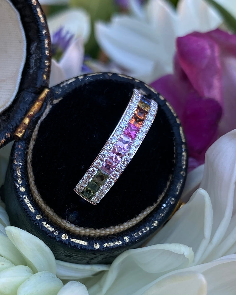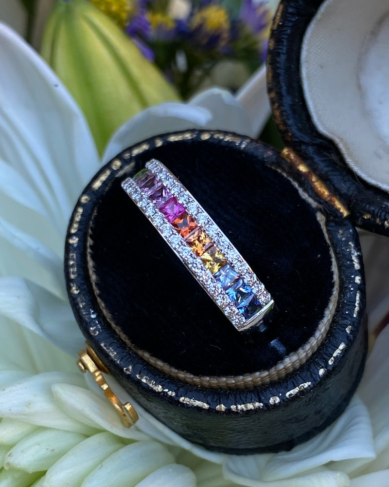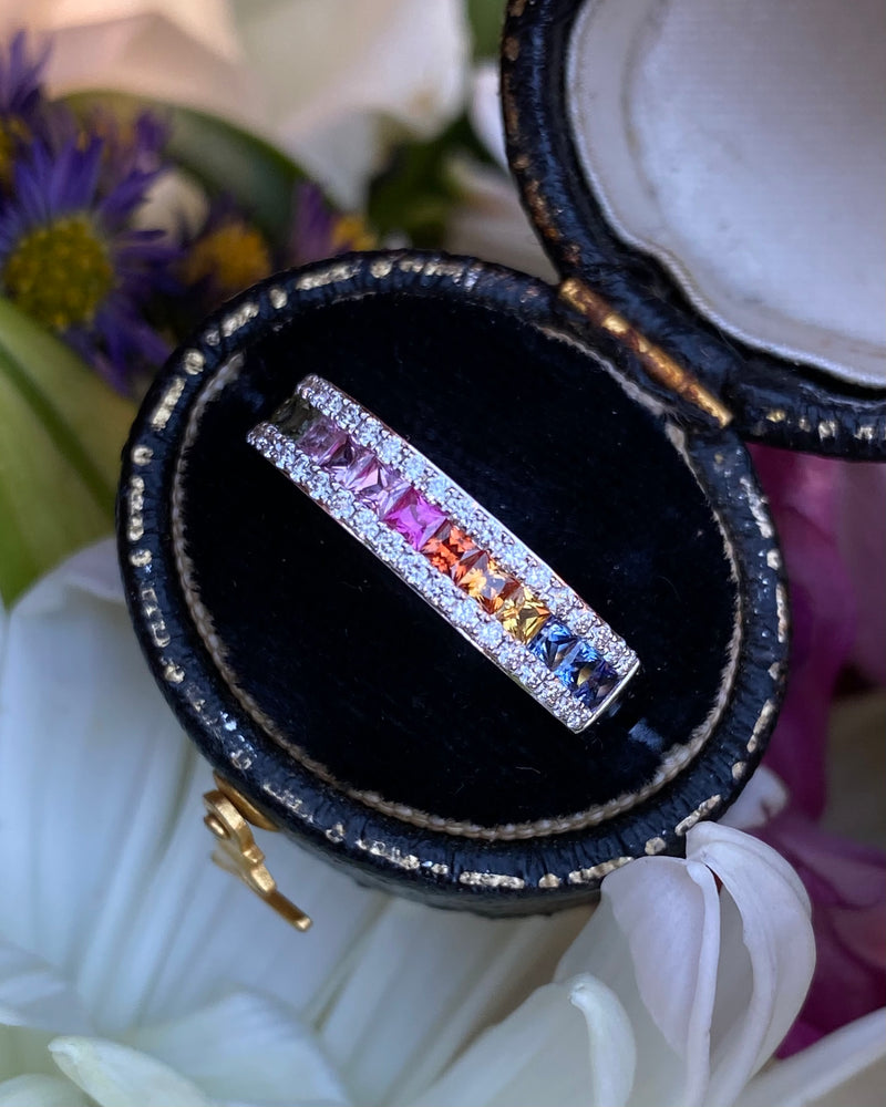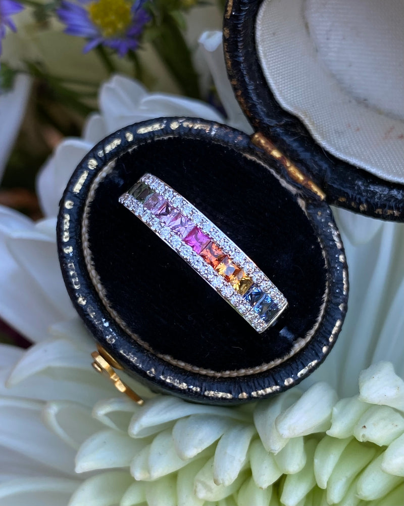 A fine quality 18ct White Gold Half Eternity Diamond ring featuring a vibrant rainbow of thirteen multi-coloured Sapphires, perfectly offset by a row of sparkling Diamonds set above and below. The Sapphires are Square Cut, including blue, yellow, orange, pink and green colours, and weigh a total of 0.52ct. The Round Brilliant Cut Diamonds are set in two rows above and below the Sapphires, approximately 'G' colour and 'VS' clarity, with no visible marks whatsoever to the naked eye and come to a total of 0.25ct in Diamond weight. The ring is made entirely in 18ct White Gold and sits beautifully with another ring or simply on its own - perfect for a special occasion or as an everyday accessory, this ring will add a touch of elegance to any look!
