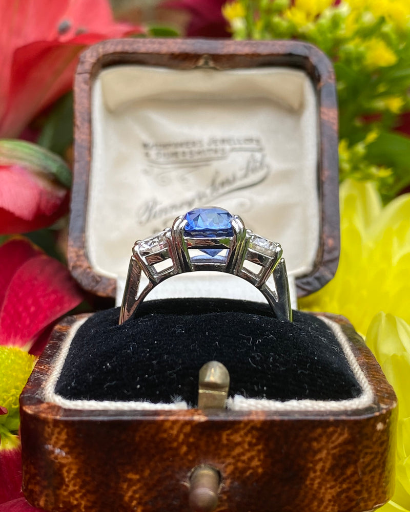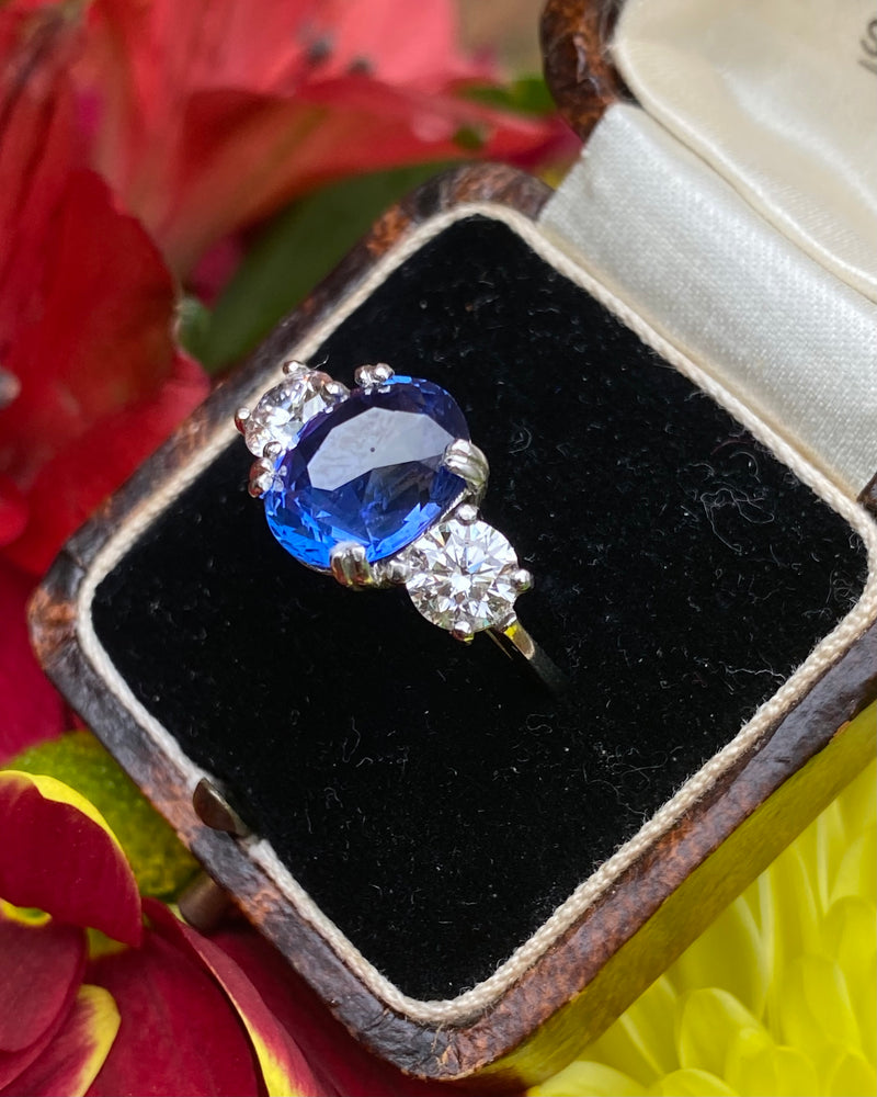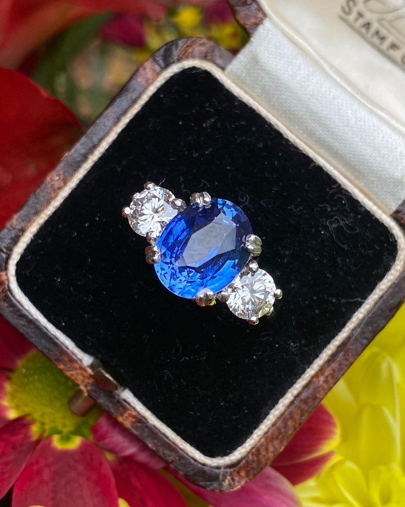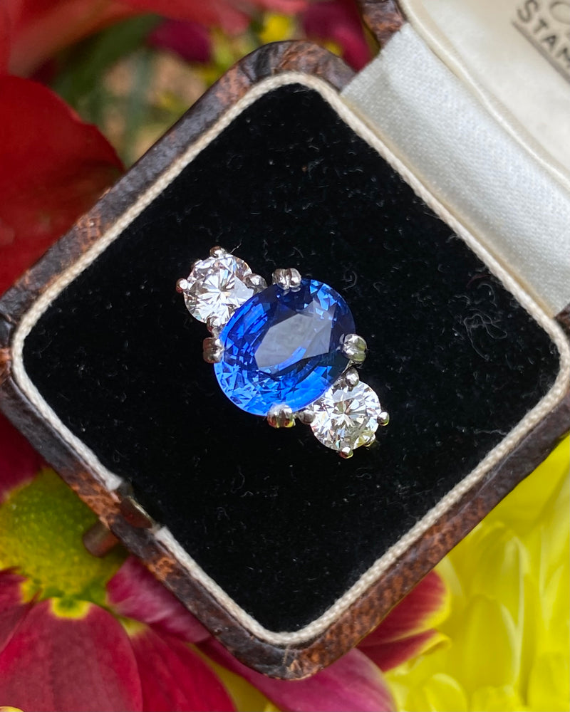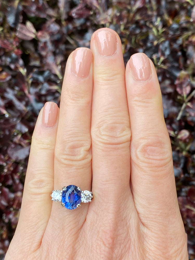 A stunning Sapphire and Diamond Three Stone ring. The Central Sapphire is set in an elegant four claw setting, and is perfectly offset by the sparkling Brilliant Cut Diamonds set either side. The Sapphire is very good quality, clean and a lovely sought after, cornflower blue colour and is Oval Cut, measuring 10mm x 8mm, and weighing a whopping 3.97ct! The Diamonds are Brilliant Cut, also set in a four claw setting, and are a bright I colour and VS/SI clarity, with a total of 1.01ct in Diamond weight. The ring has an attractive double under gallery and sits nice and low on the finger and is easy to wear. This is a gorgeous ring.
