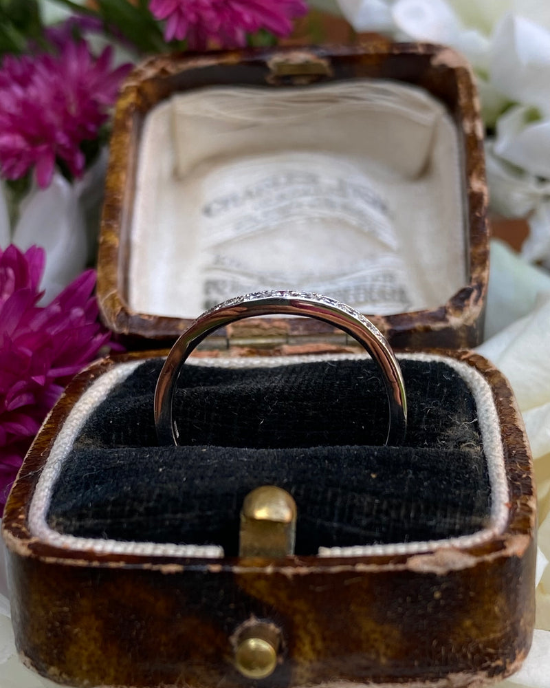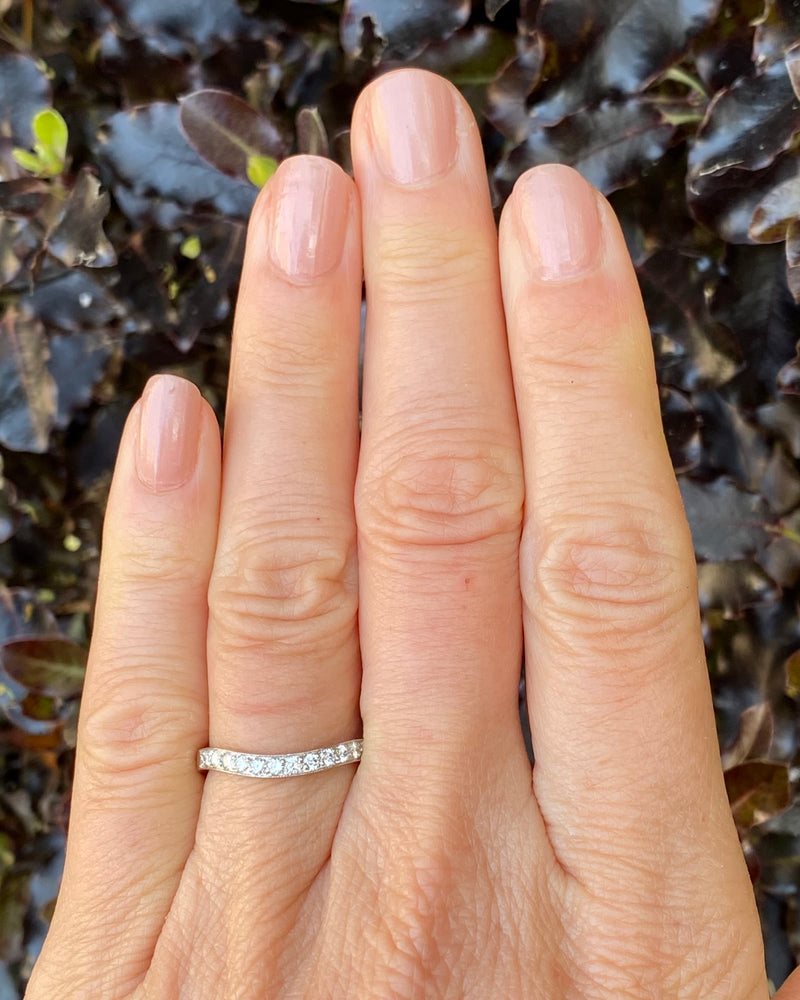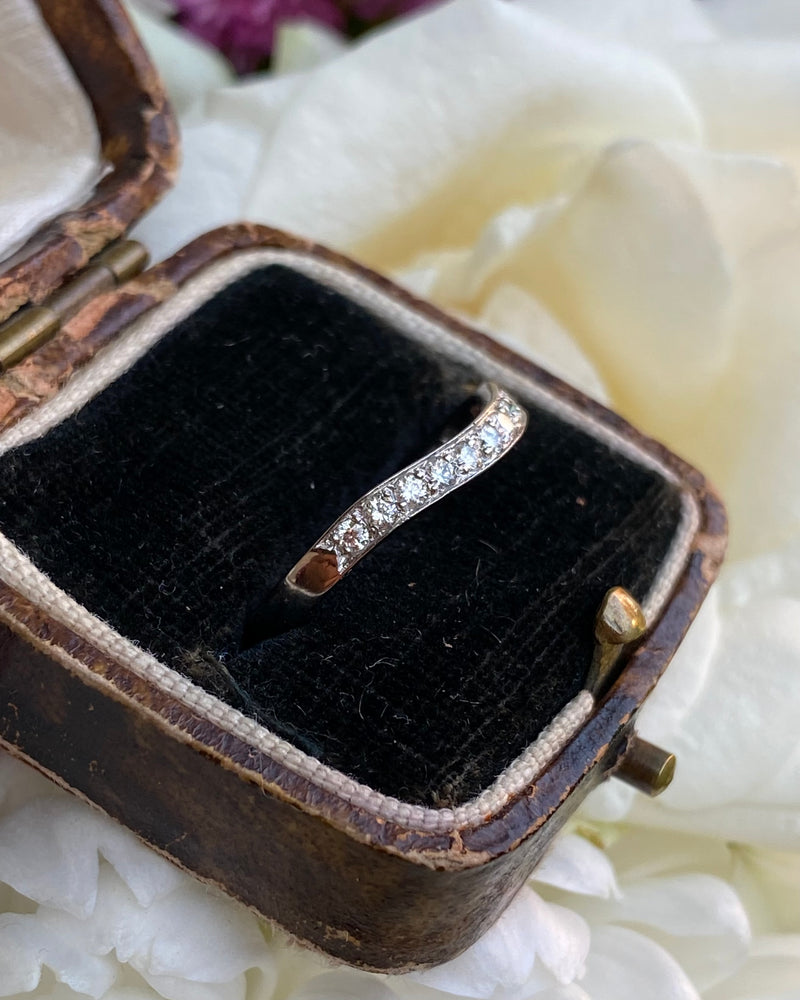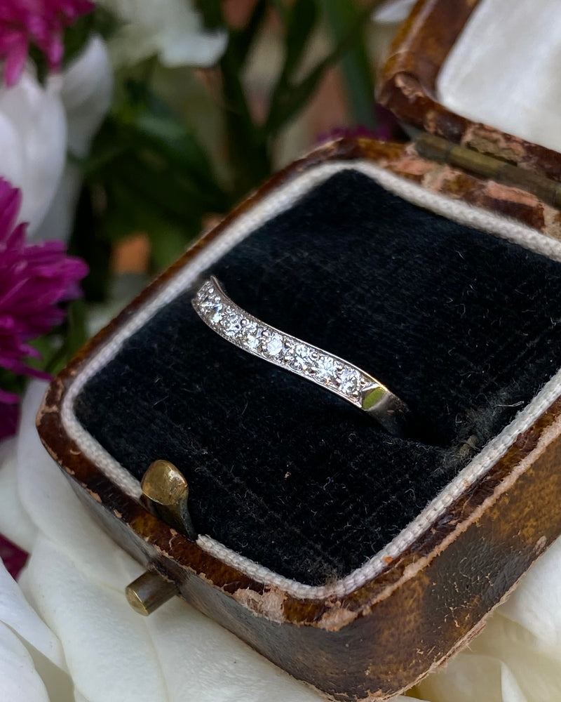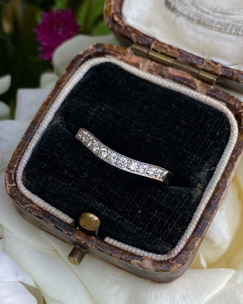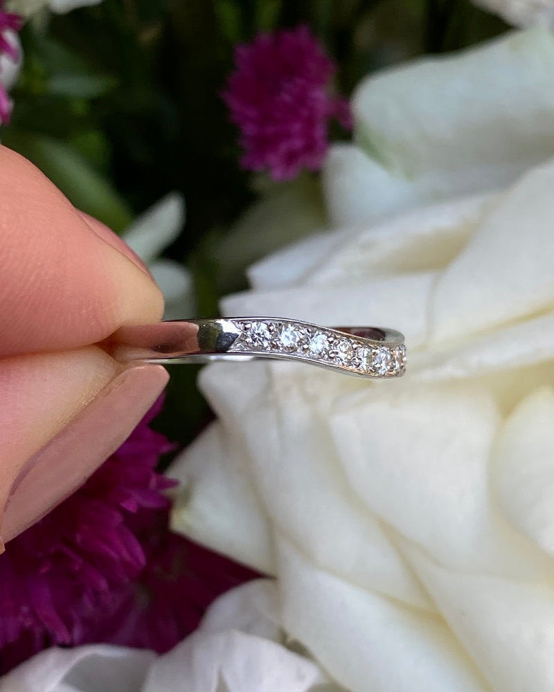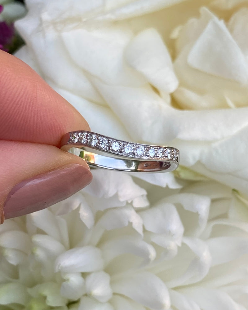 A fine quality slightly shaped Half Eternity Diamond ring containing twelve Brilliant Cut Diamonds each individually Pave set. This ring sits beautifully with many of the other rings in our collection and can be worn as a Wedding Ring or Eternity Ring. It can also be made to order in 18ct Yellow Gold, White Gold or Platinum. The Diamonds are approximately H/I colour and VS/SI clarity, with no visible marks to the naked eye and weigh 0.30ct in total. The ring is made entirely in Platinum and is fully Hallmarked.