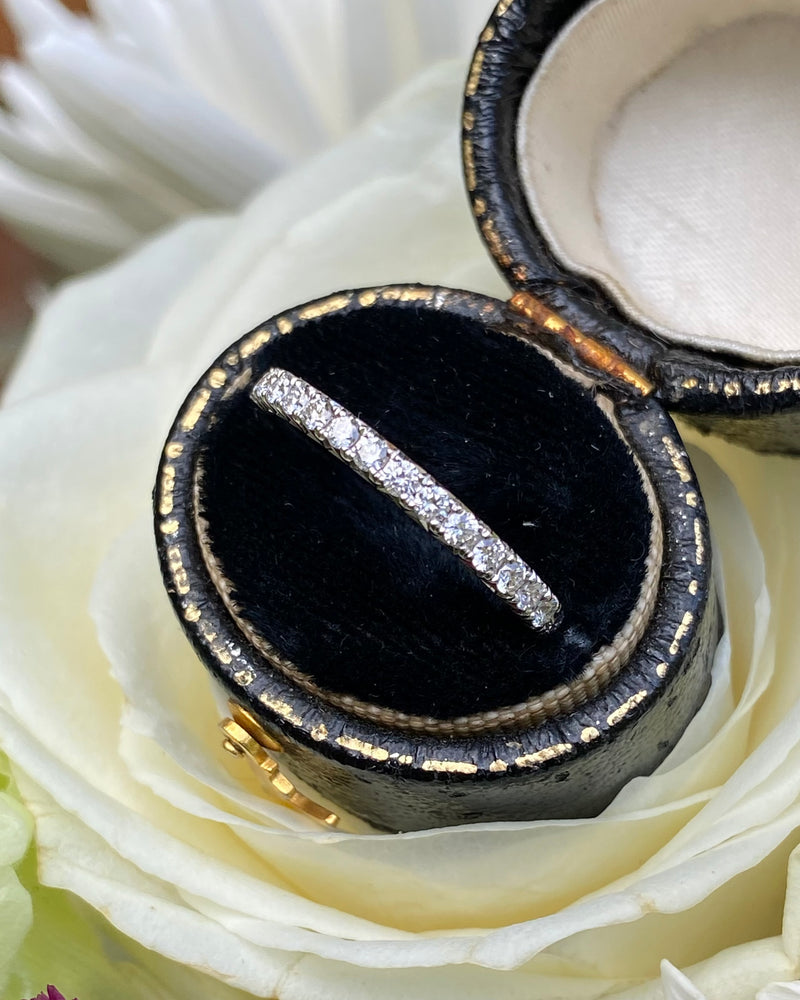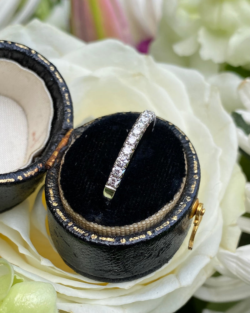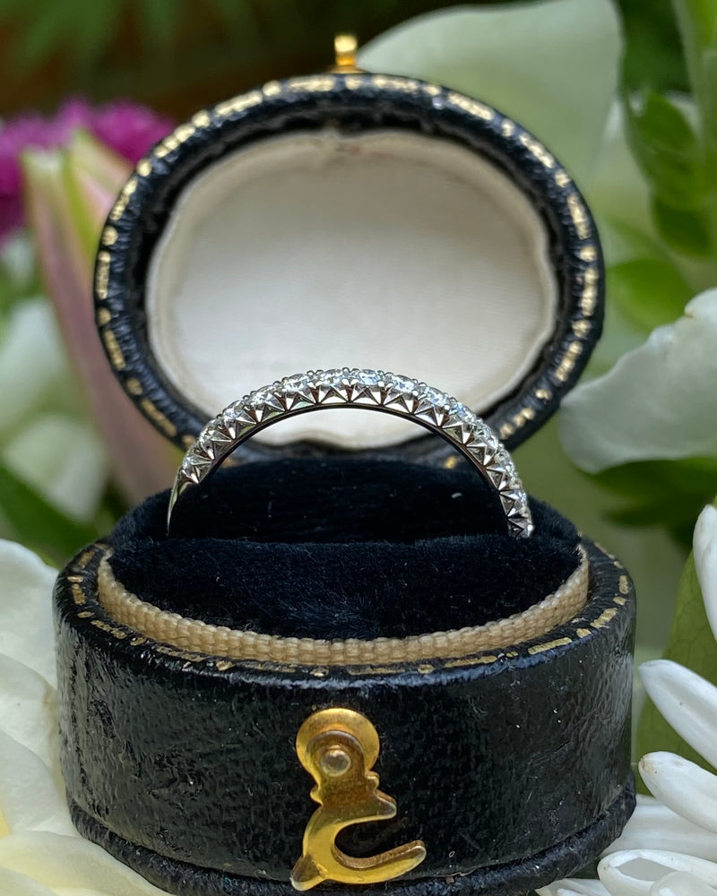 A fine quality Half Eternity Diamond ring containing seventeen Brilliant Cut Diamonds each individually set in a fine claw setting. The Diamonds are approximately 'G' colour and VS/SI clarity, no visible marks whatsoever to the naked eye. The Diamonds weigh approximately 0.36ct in total. This ring sits beautifully with another ring or simply on its own and is perfect for a special occasion, the diamonds will sparkle for a lifetime. The ring is made entirely in 18ct White Gold, is fully Hallmarked and is size 'N’ and could be easily sized up or down.