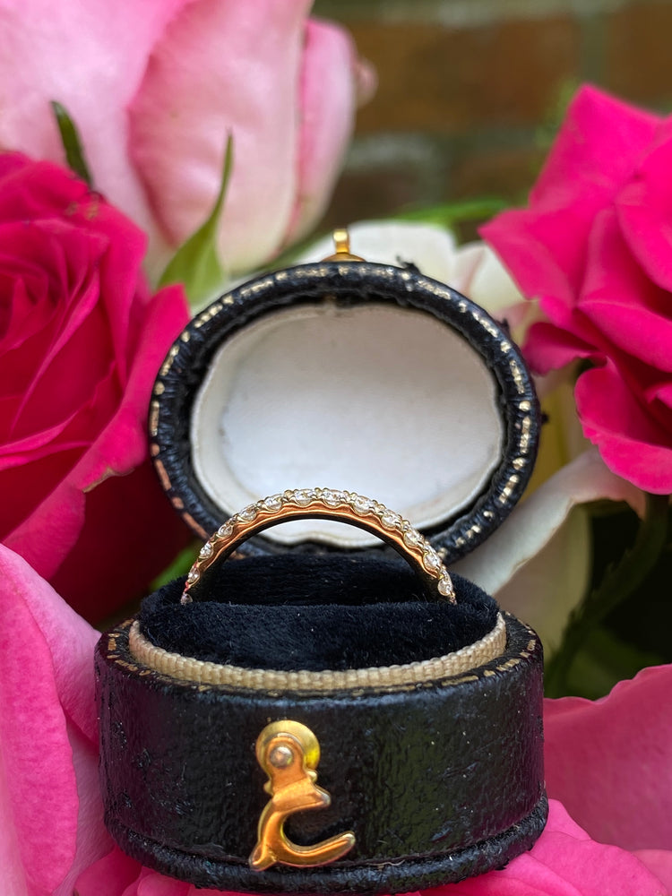 A fine quality Half Eternity Diamond ring containing fifteen Brilliant Cut Diamonds each individually set in a fine claw setting. The Diamonds are approximately 'G' colour and VS/SI clarity, no visible marks whatsoever to the naked eye. The Diamonds weigh approximately 0.46ct in total. This ring sits beautifully with another ring or simply on its own. The ring is made entirely in 18ct Yellow Gold, is fully Hallmarked and is size 'N' and could be easily sized up or down.