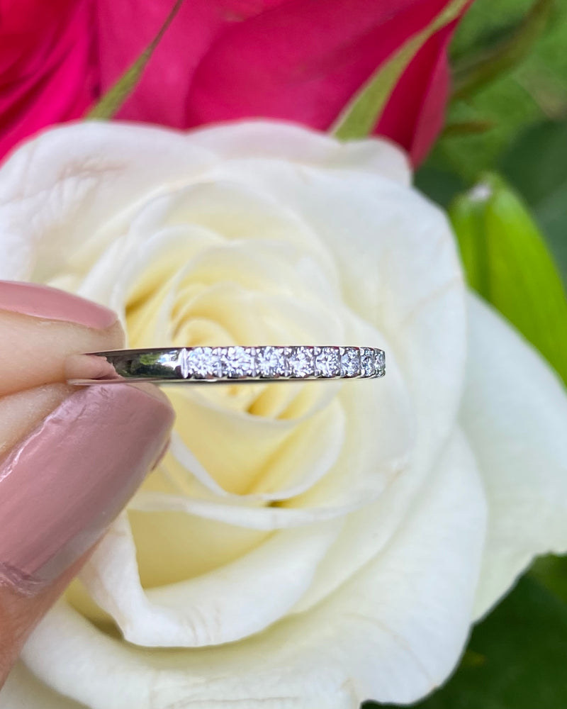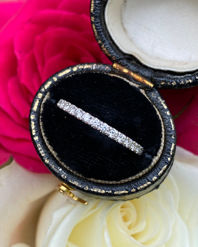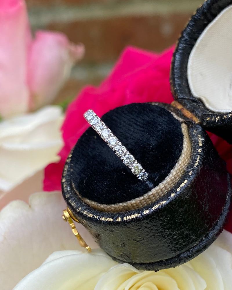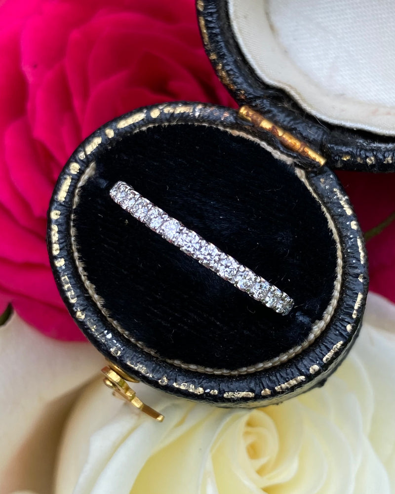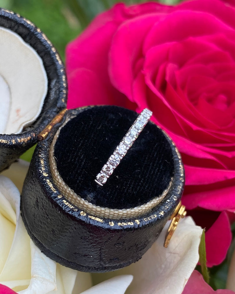 A fine quality Half Eternity Diamond ring containing seventeen Brilliant Cut Diamonds each individually set in a fine claw setting. The Diamonds are approximately 'G' colour and 'VS' clarity, no visible marks whatsoever to the naked eye. The Diamonds weigh approximately 0.36ct in total. This ring sits beautifully with another ring or simply on its own and is set in a classic setting that’s sure to last a lifetime. The ring is made entirely in heavy, high quality Platinum, is fully Hallmarked and is size 'N’ and could be easily sized up or down.