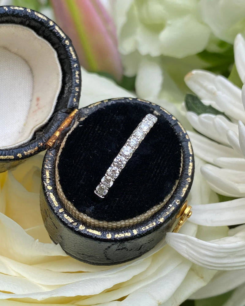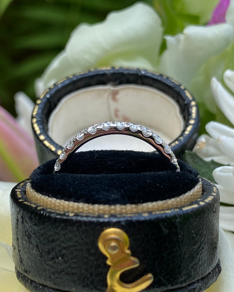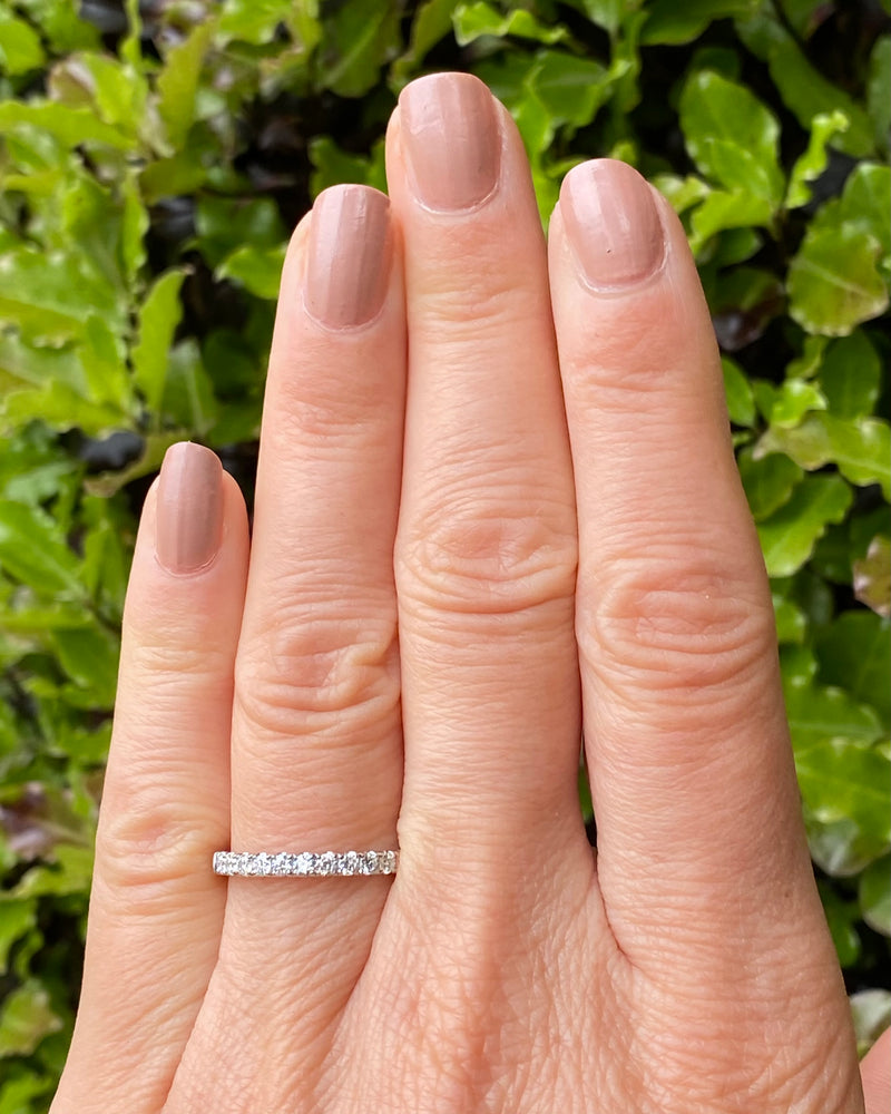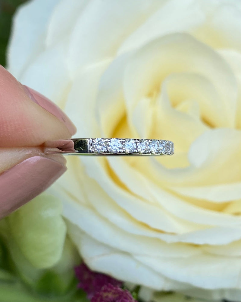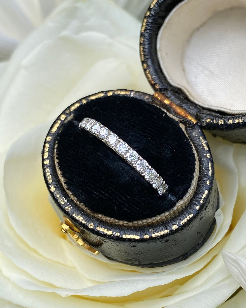A fine quality Half Eternity Diamond ring containing fifteen Brilliant Cut Diamonds each individually set in a fine claw setting. The Diamonds are approximately 'G' colour and 'VS' clarity, no visible marks whatsoever to the naked eye. The Diamonds weigh approximately 0.50ct in total. This ring sits beautifully with another ring or simply on its own. The ring is made entirely in 18ct Platinum, making it the perfect timeless statement piece, is fully Hallmarked and is size 'N’ and could be easily sized up or down.