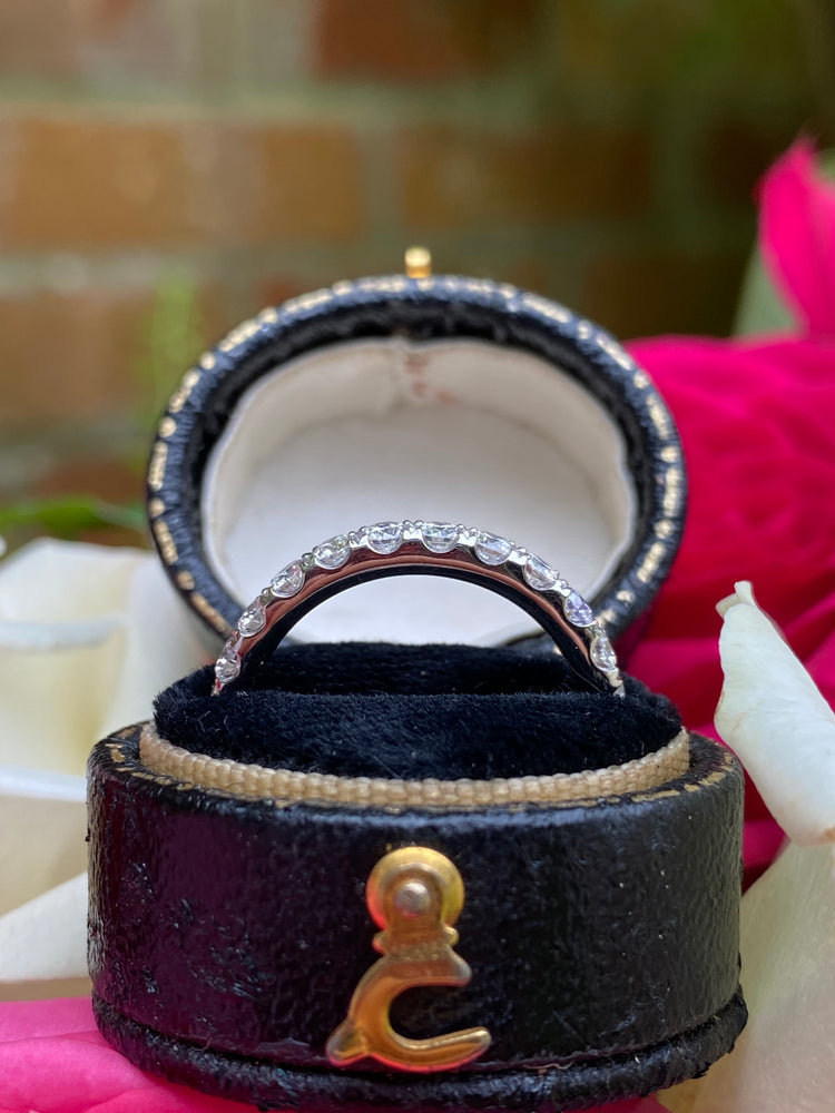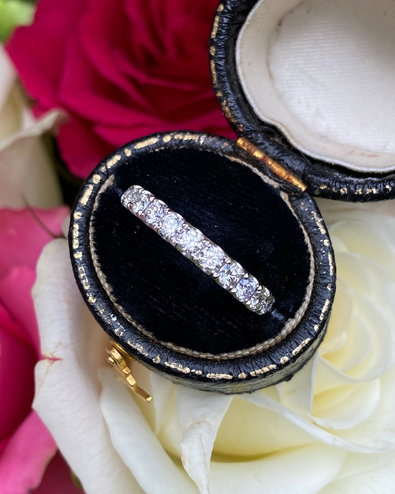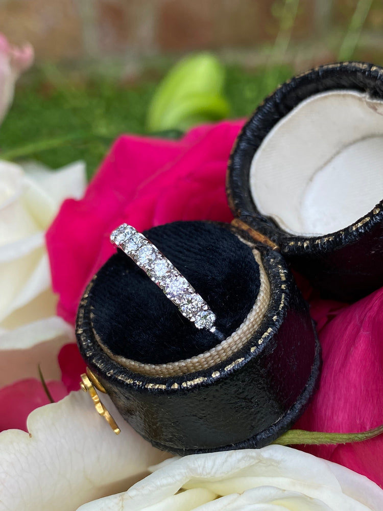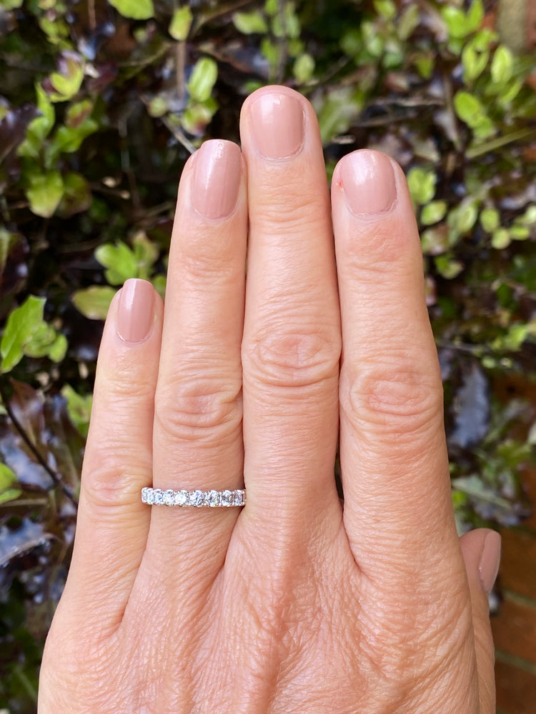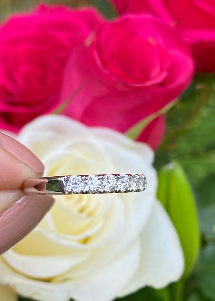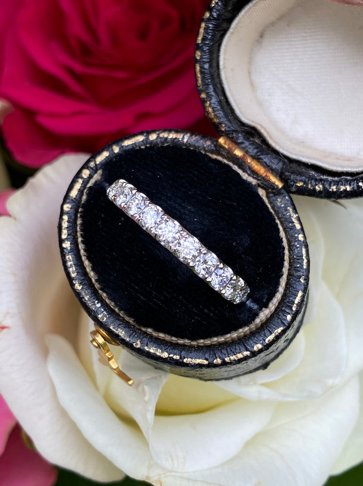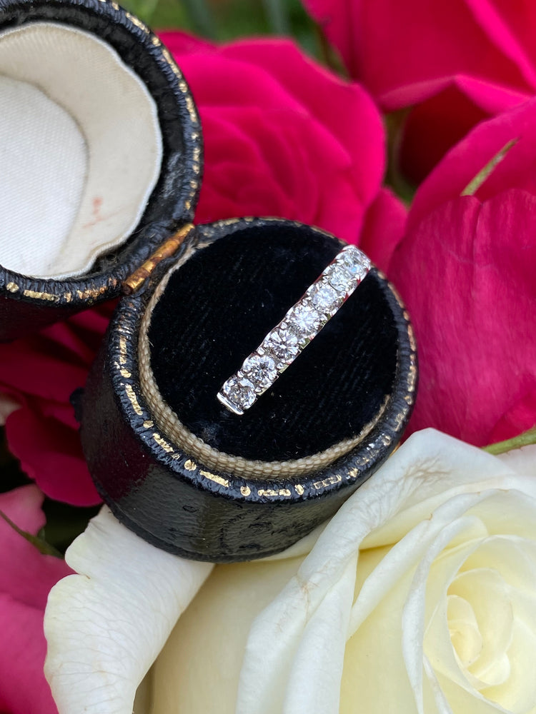 A fine quality Half Eternity Diamond ring containing eleven Brilliant Cut Diamonds each individually set in a fine claw setting. The Diamonds are approximately 'G' colour and 'VS' clarity, no visible marks whatsoever to the naked eye. The Diamonds weigh approximately 0.68ct in total. This ring sits beautifully with another ring or simply on its own, perfect for a special occasion or as an everyday accessory, this ring will add a touch of elegance to any look. The ring is made entirely in heavy, high quality Platinum, with an elegant setting for a luxurious look that will last. It is fully Hallmarked and is size 'N’ and could be easily sized up or down.