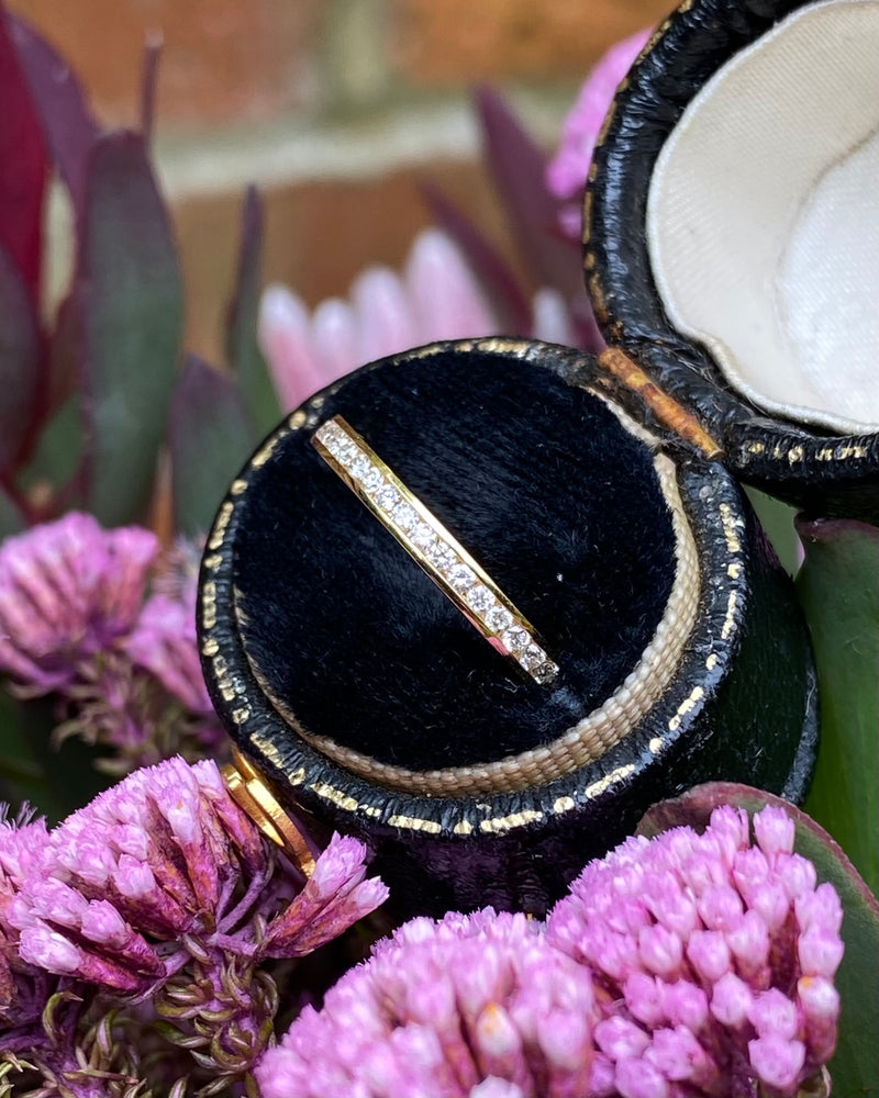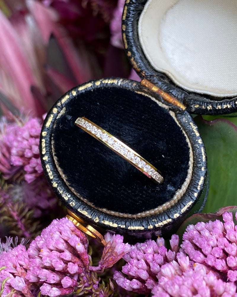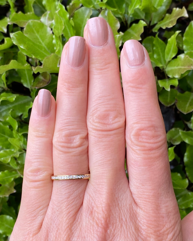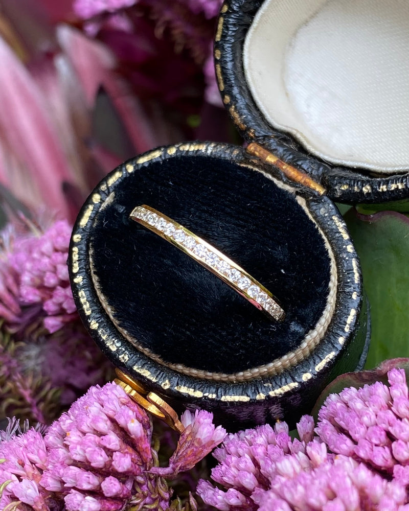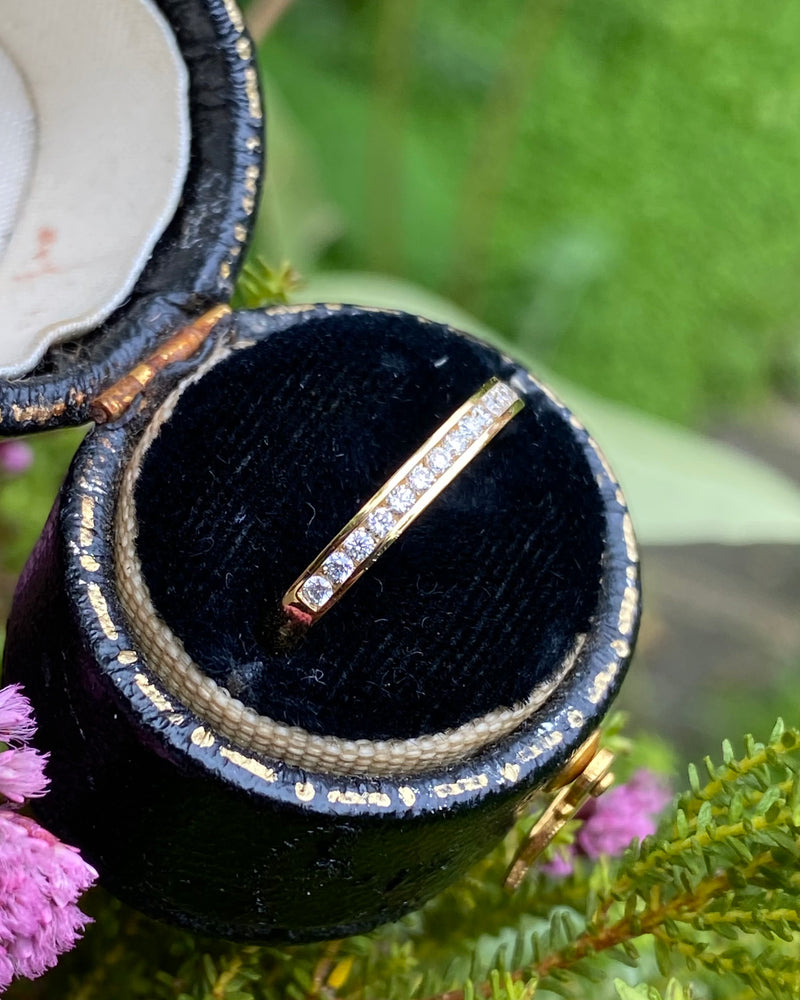 A fine quality half Eternity ring set with a seamless row of twenty three Channel Set sparkling Brilliant Cut Diamonds. The Brilliant Cut Diamonds are great quality, weigh 0.24ct, approximately G colour and VS/SI clarity and are set in a 2.2mm contemporary soft Court Shape 18ct Yellow Gold band. This is a lovely quality half eternity ring perfect for special occasions or everyday wear, or could be a used as a Wedding set band for that special person - at a great price.