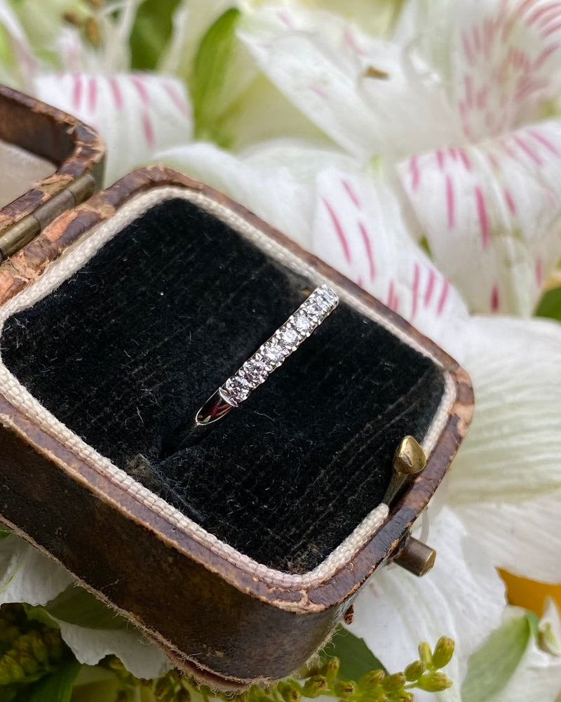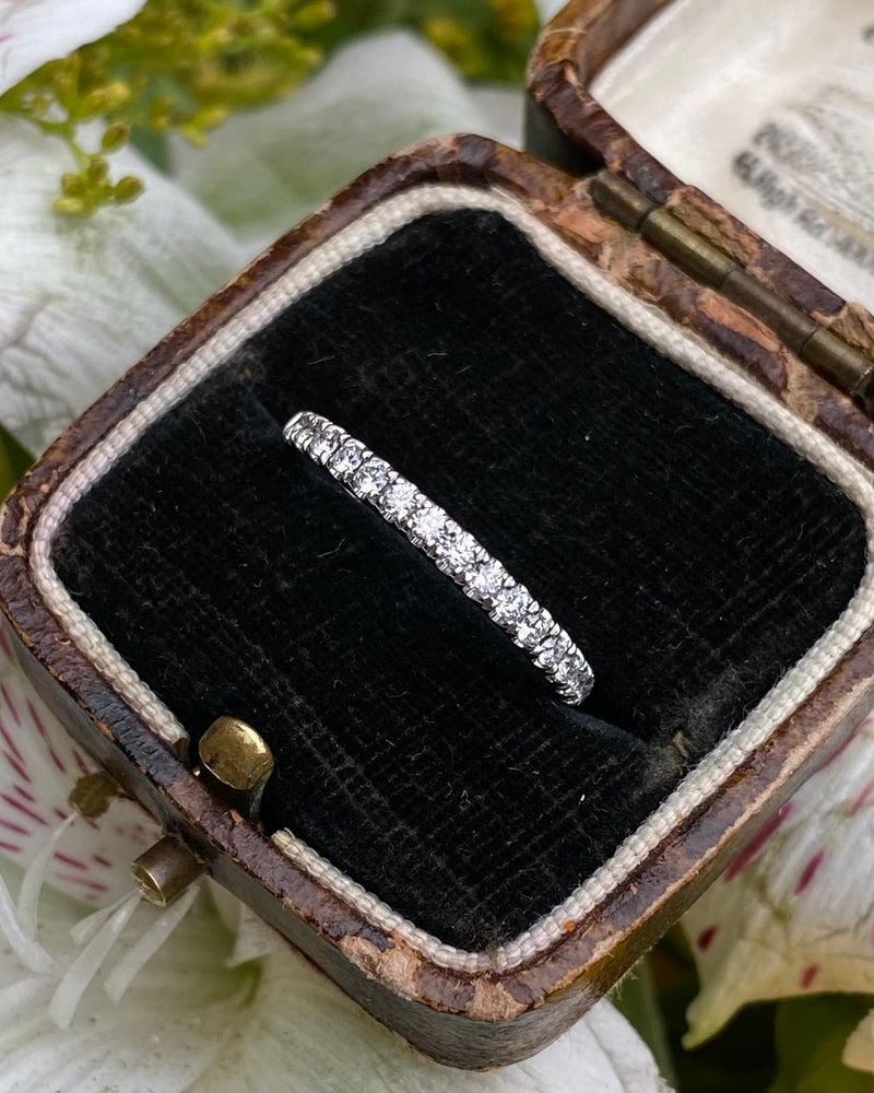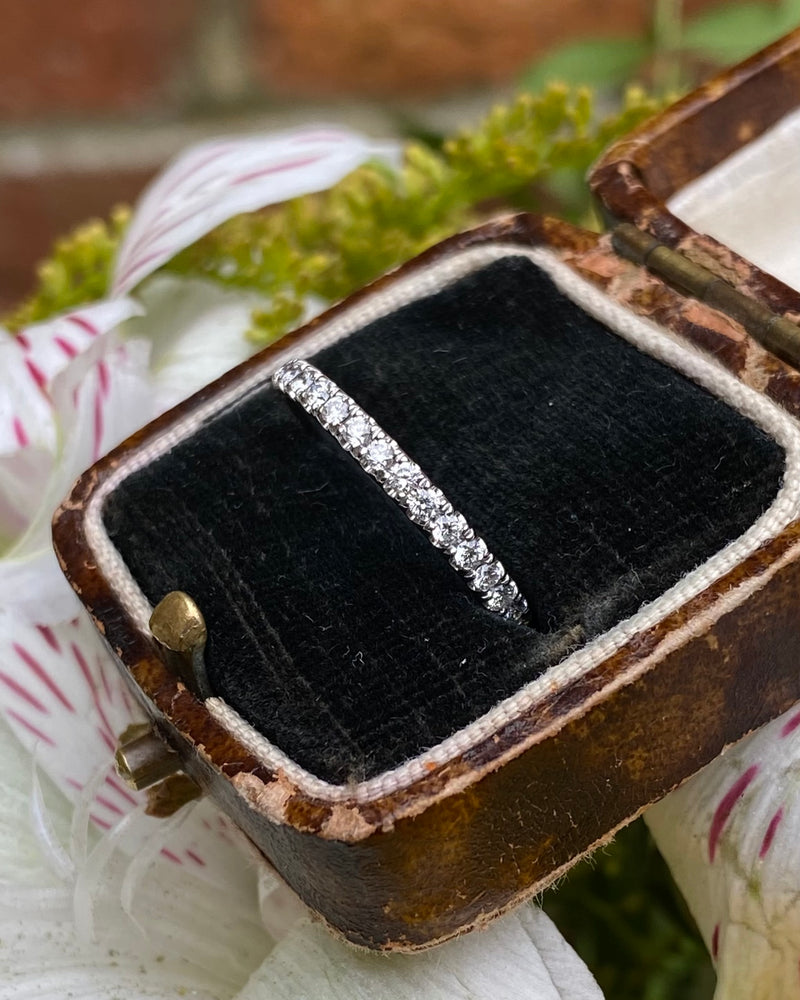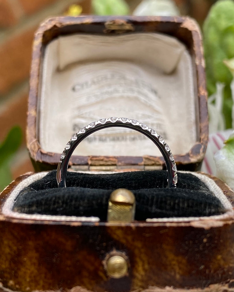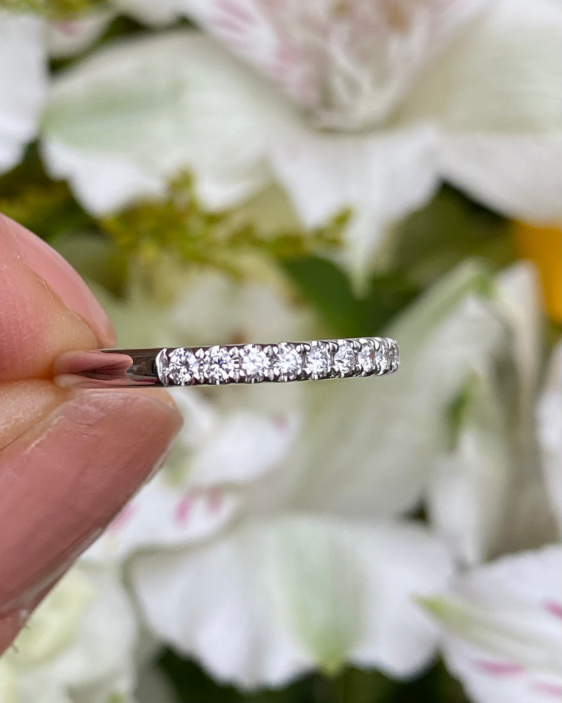 A fine Half Eternity ring set with a seamless row of seventeen Pave Set sparkling Brilliant Cut Diamonds. The Brilliant Cut Diamonds are great quality, approximately G/H colour and VS/SI clarity and are set in a 1.8mm contemporary fine18ct White Gold band which sits neatly with another ring. This is a lovely quality half eternity ring or could be a used as a Wedding set band for that special person, at a great price.