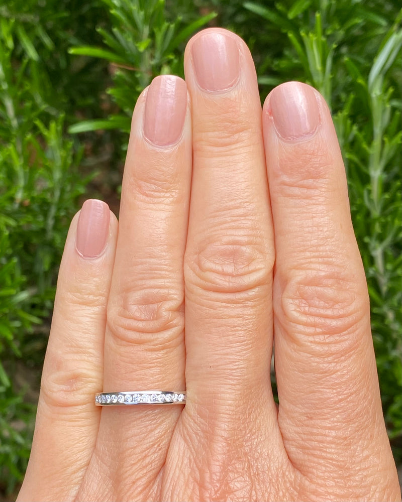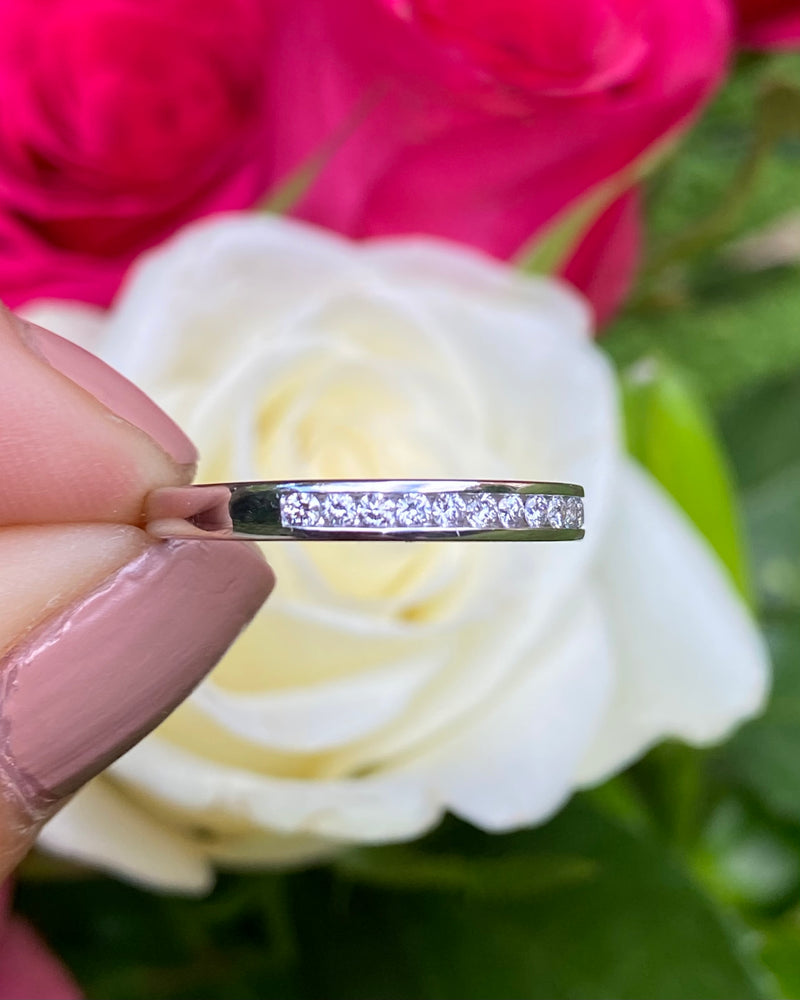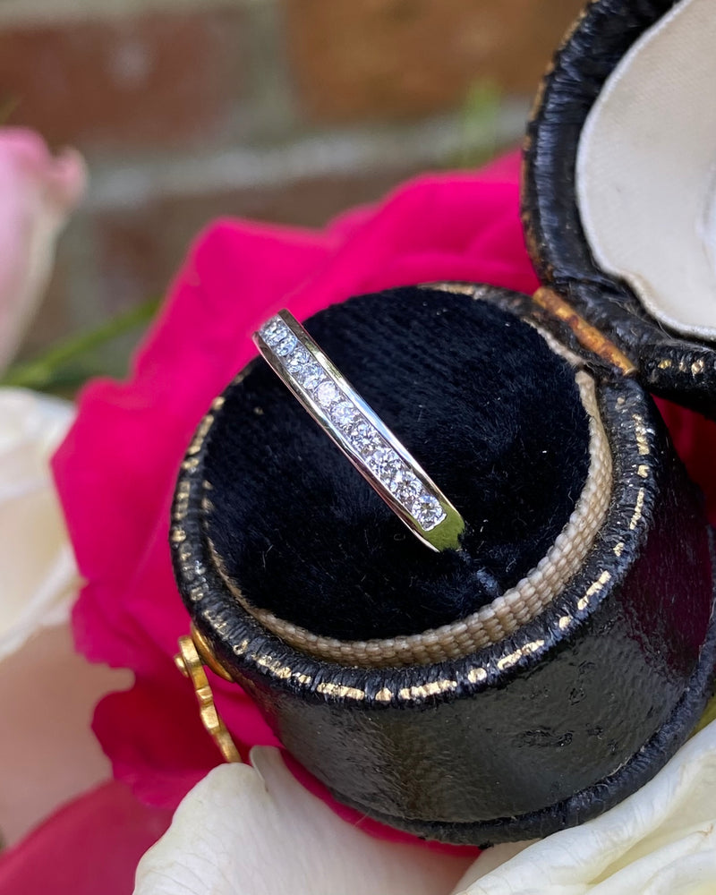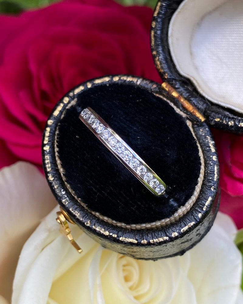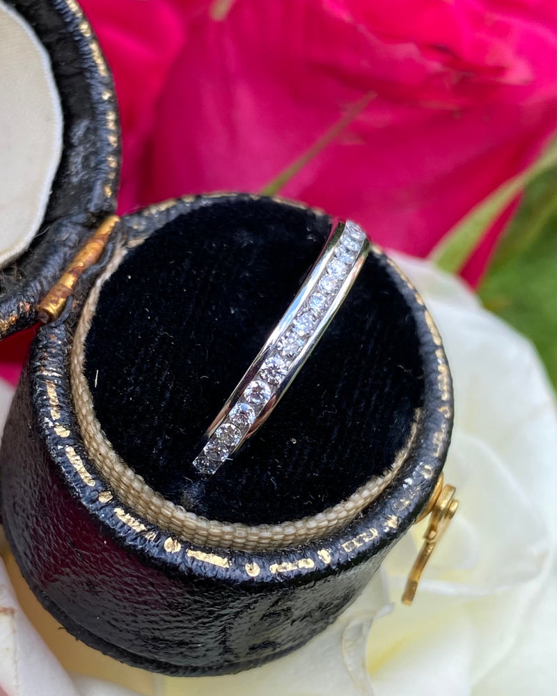 A fine quality half Eternity ring set with a seamless row of twenty one Channel Set sparkling Brilliant Cut Diamonds. The Brilliant Cut Diamonds are great quality, weigh 0.33ct, approximately G colour and VS/SI clarity and are set in a 2.5mm contemporary soft Court Shape band. This is a lovely quality half eternity ring perfect for special occasions or everyday wear, or could be a used as a Wedding set band for that special person - at a great price.