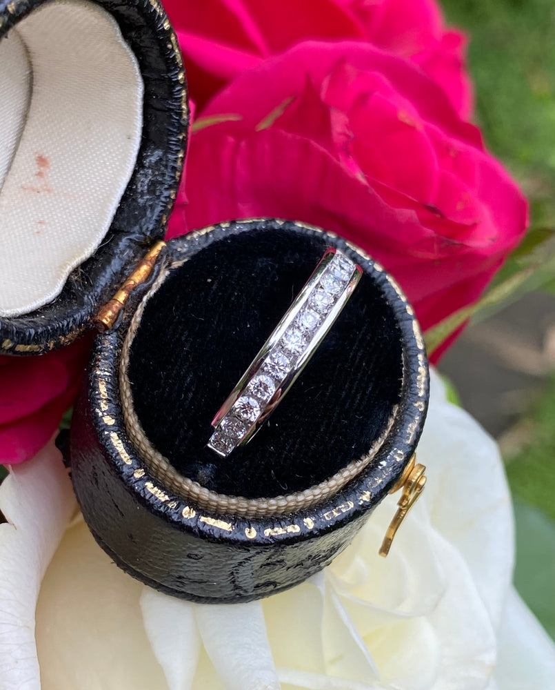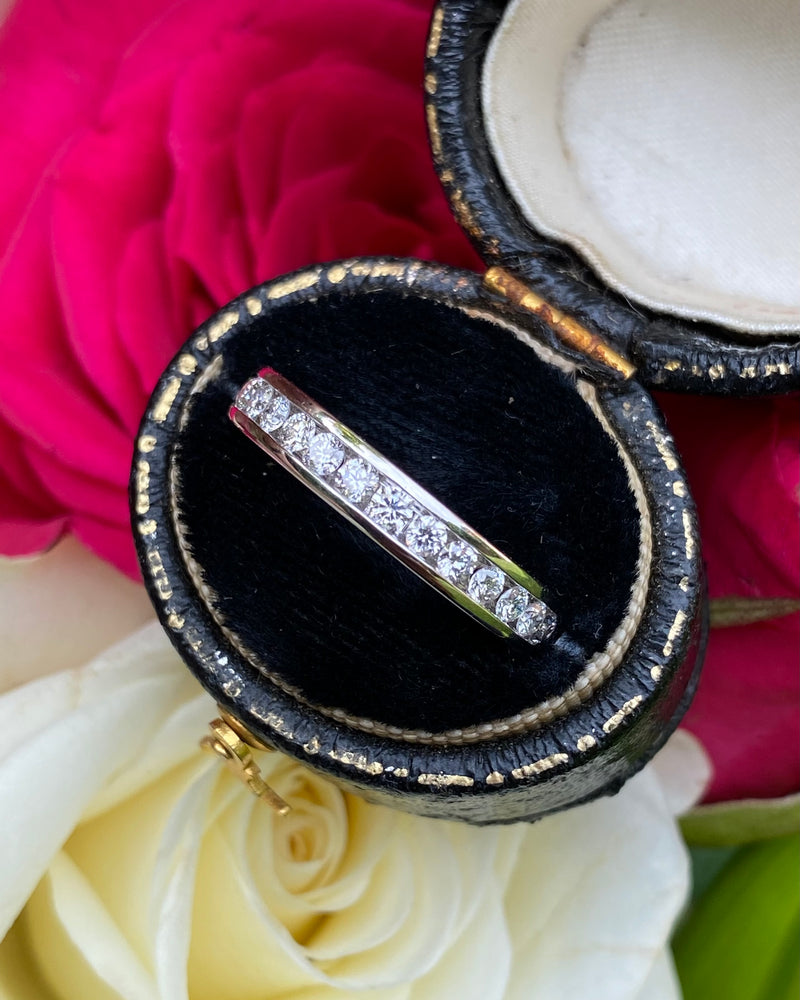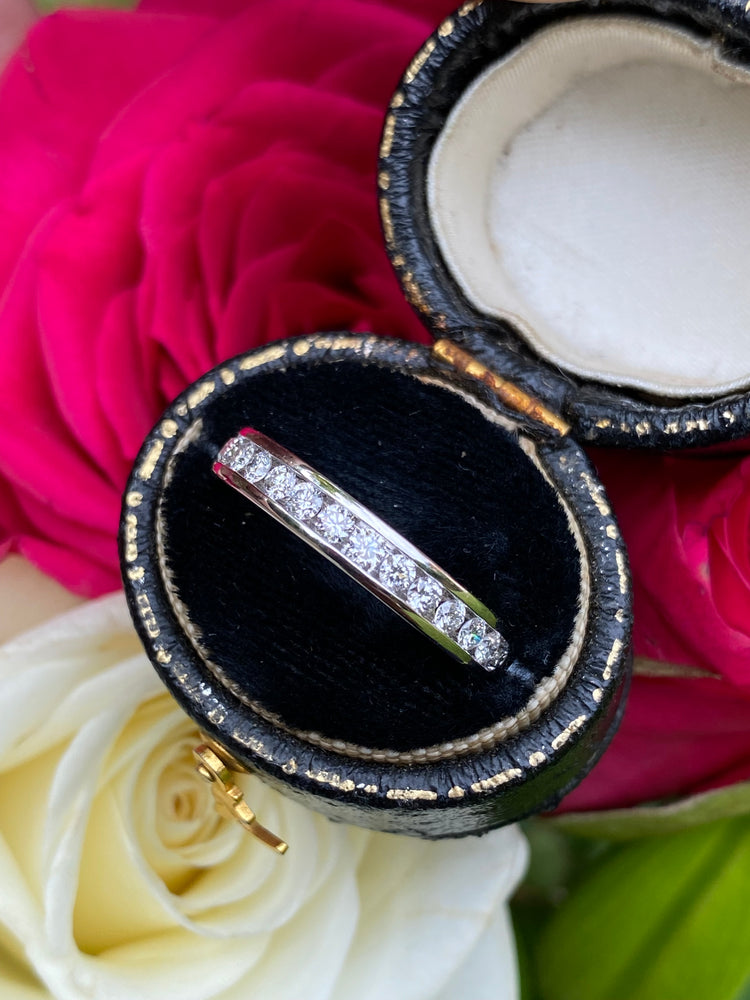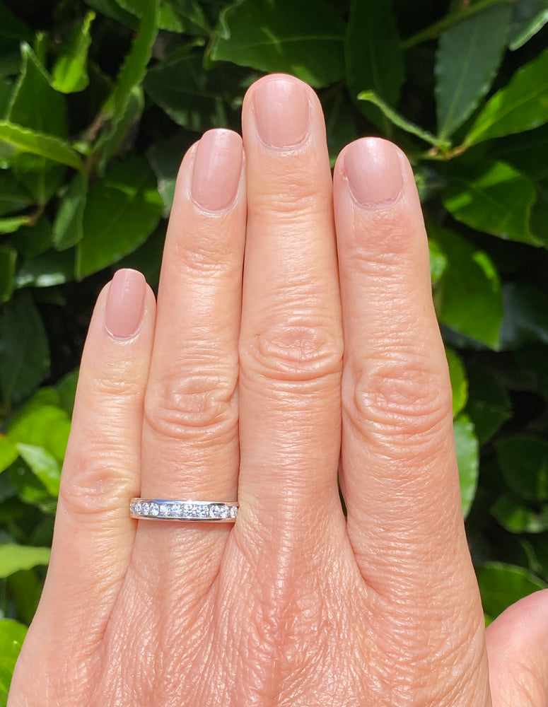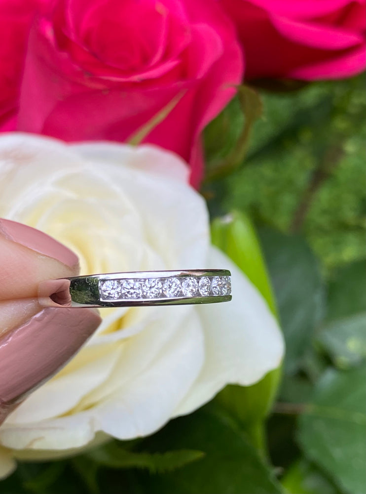 A fine quality contemporary style Half Eternity Wedding ring set with a seamless row of fifteen Channel Set sparkling Brilliant Cut Diamonds. The Brilliant Cut Diamonds are great quality, weigh 0.50ct, approximately G colour and VS/SI clarity and are set in a 3.3mm contemporary soft Court Shape band that is slightly tapered at the back. This is a lovely quality half eternity ring perfect for special occasions or everyday wear, or could be a used as a Wedding set band for that special person - at a great price.