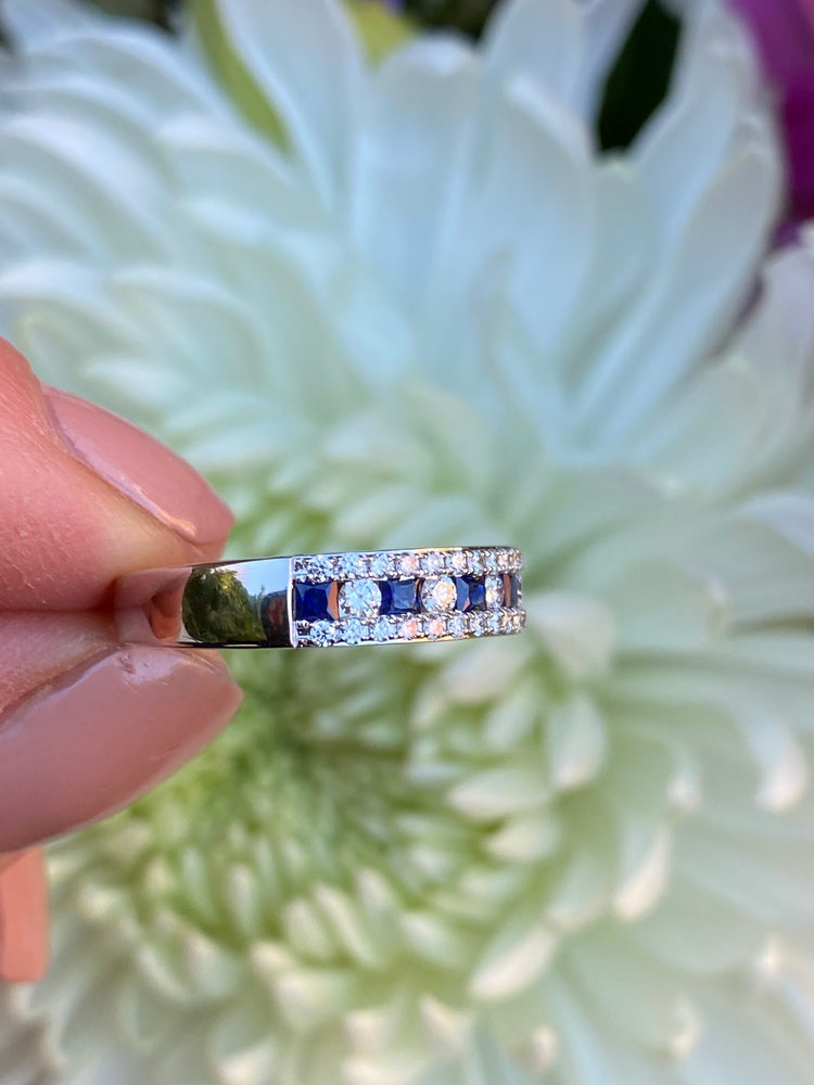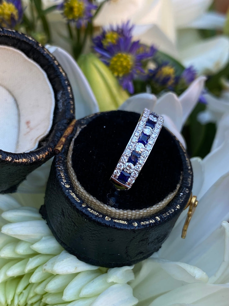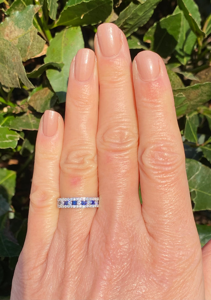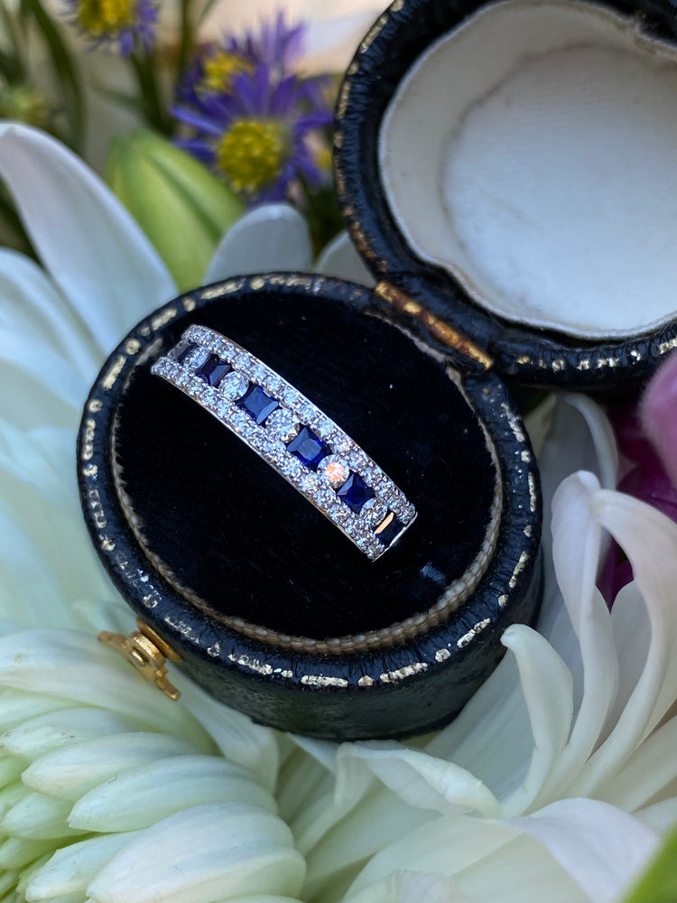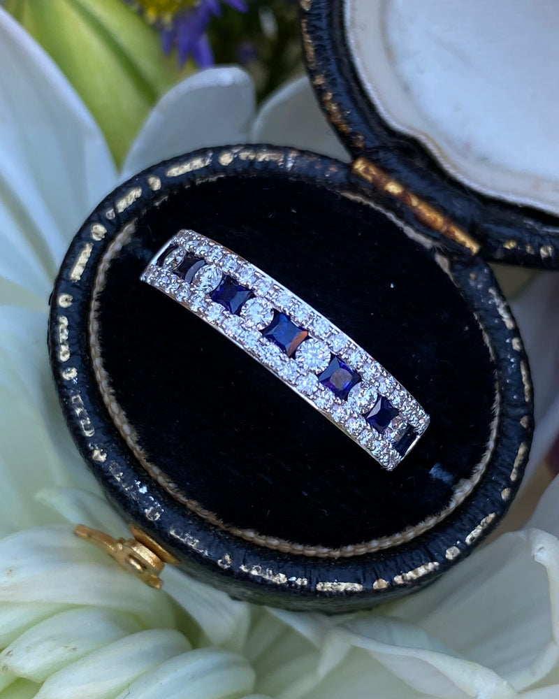 A striking contemporary style Half Eternity ring set with a row of seven Sapphires, perfectly offset by the surrounding dazzling Diamonds. The Sapphires are Square Cut, with a gorgeous cornflower blue Sapphire of a fine colour and clarity and weigh 0.45ct in total. There are two rows of Round Brilliant Cut Diamonds set above and below, as well as additional slightly larger Diamonds set in between each of the Sapphires, all of a fine 'G' colour and 'VS' clarity and are bright and lively stones with no marks visible to the naked eye. The ring contains a total of 0.43ct in Diamond weight, and is set entirely in 18ct White Gold.