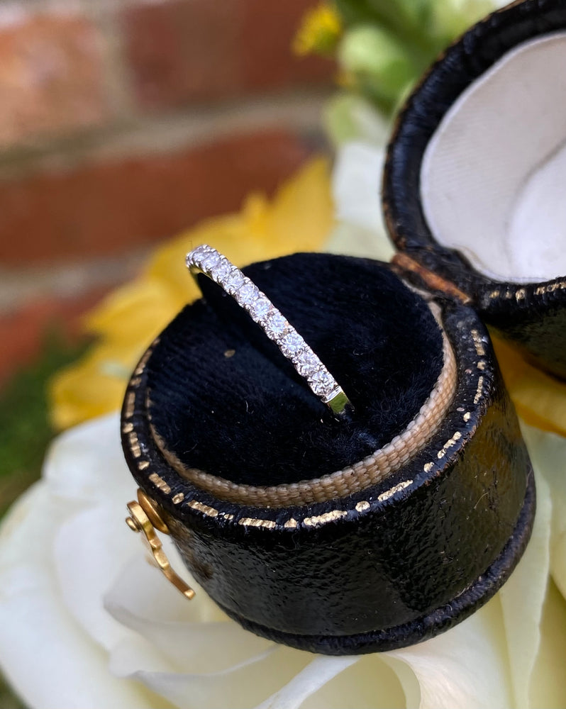 A fine quality Half Eternity Diamond ring containing seventeen Brilliant Cut Diamonds each individually set in a fine claw setting. The Diamonds are approximately 'G' colour and VS clarity, no visible marks whatsoever to the naked eye. The Diamonds weigh approximately 0.29ct in total. This ring sits beautifully with another ring or simply on its own. The ring is made entirely in 18ct White Gold, is fully Hallmarked and is size 'N 1/2' and could be easily sized up or down.